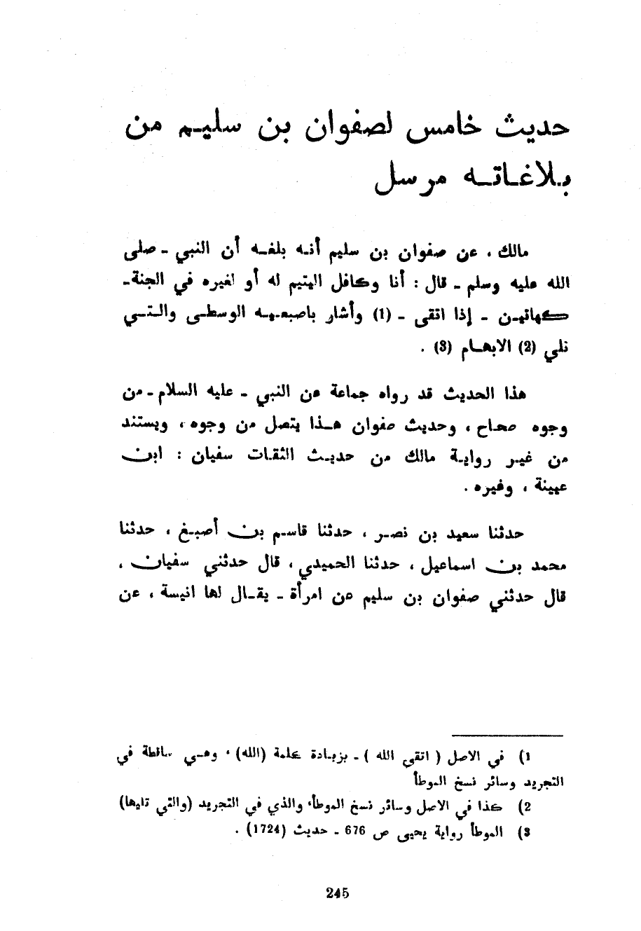 حَدِيثٌ خَامِسٌ لِصَفْوَانَ بْنِ سُلَيْمٍ مِنْ بَلَاغَاتِهِ مُرْسَلٌ مَالِكٌ عَنْ صَفْوَانَ بْنِ سُلَيْمٍ أَنَّهُ بَلَغَهُ أَنَّ النَّبِيَّ صَلَّى اللَّهُ عَلَيْهِ وَسَلَّمَ قَالَ أَنَا وَكَافِلُ الْيَتِيمِ لَهُ أَوْ لِغَيْرِهِ فِي الْجَنَّةِ كَهَاتَيْنِ إِذَا اتَّقَى وَأَشَارَ بِإِصْبَعَيْهِ الْوُسْطَى وَالَّتِي تَلِي الْإِبْهَامَ هَذَا الْحَدِيثُ قَدْ رَوَاهُ جَمَاعَةٌ عَنِ النَّبِيِّ عَلَيْهِ السَّلَامُ مِنْ وُجُوهٍ صِحَاحٍ وَحَدِيثُ صَفْوَانَ هَذَا يَتَّصِلُ مِنْ وُجُوهٍ وَيَسْتَنِدُ مِنْ غَيْرِ رِوَايَةِ مَالِكٍ مِنْ حديث الثقات سفيان ابن عُيَيْنَةَ وَغَيْرِهِ حَدَّثَنَا سَعِيدُ بْنُ نَصْرٍ قَالَ حَدَّثَنَا قَاسِمُ بْنُ أَصْبَغَ حَدَّثَنَا مُحَمَّدُ بْنُ إِسْمَاعِيلَ حَدَّثَنَا الْحُمَيْدِيُّ قَالَ حَدَّثَنِي سُفْيَانُ قَالَ حَدَّثَنِي صَفْوَانُ بْنُ سُلَيْمٍ عَنِ امْرَأَةٍ يُقَالُ لَهَا أُنَيْسَةُ عَنْ