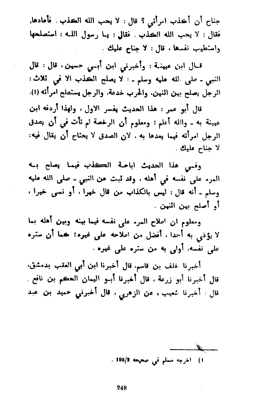 جُنَاحٌ أَنْ أَكْذِبَ امْرَأَتِي قَالَ لَا يُحِبُّ اللَّهُ الْكَذِبَ فَأَعَادَهَا فَقَالَ لَا يُحِبُّ اللَّهُ الْكَذِبَ فَقَالَ يَا رَسُولَ اللَّهِ أَسْتَصْلِحُهَا وَأَسْتَطِيبُ نَفْسَهَا قَالَ لَا جُنَاحَ عَلَيْكَ قَالَ ابْنُ عُيَيْنَةَ وَأَخْبَرَنِي ابْنُ أَبِي حُسَيْنٍ قَالَ قَالَ النَّبِيُّ صَلَّى اللَّهُ عَلَيْهِ وَسَلَّمَ لَا يَصْلُحُ الْكَذِبُ إِلَّا فِي ثَلَاثٍ الرَّجُلُ يُصْلِحُ بَيْنَ اثْنَيْنِ وَالْحَرْبُ خُدْعَةٌ وَالرَّجُلُ يَسْتَصْلِحُ امْرَأَتَهُ قَالَ أَبُو عُمَرَ هَذَا الْحَدِيثُ يُفَسِّرُ الْأَوَّلَ وَلِهَذَا أَرْدَفَهُ ابْنُ عُيَيْنَةَ بِهِ وَاللَّهُ أَعْلَمُ وَمَعْلُومٌ أَنَّ الرُّخْصَةَ لَمْ تَأْتِ فِي أَنْ يَصْدُقَ الرَّجُلُ امْرَأَتَهُ فِيمَا يَعِدُهَا بِهِ لِأَنَّ الصِّدْقَ لَا يَحْتَاجُ أَنْ يُقَالَ فِيهِ لَا جُنَاحَ عَلَيْكَ وَفِي هَذَا الْحَدِيثِ إِبَاحَةُ الْكَذِبِ فِيمَا يُصْلِحُ بِهِ الْمَرْءُ عَلَى نَفْسِهِ فِي أَهْلِهِ وَقَدْ ثَبَتَ عَنِ النَّبِيِّ صَلَّى اللَّهُ عَلَيْهِ وَسَلَّمَ أَنَّهُ قَالَ لَيْسَ بِالْكَذَّابِ مَنْ قَالَ خَيْرًا أَوْ نَمَى خَيْرًا أَوْ أَصْلَحَ بَيْنَ اثْنَيْنِ وَمَعْلُومٌ أَنَّ إِصْلَاحَ الْمَرْءِ عَلَى نَفْسِهِ فِيمَا بَيْنَهُ وَبَيْنَ أَهْلِهِ بِمَا لَا يُؤْذِي بِهِ أَحَدًا أَفْضَلُ مِنْ إِصْلَاحِهِ عَلَى غَيْرِهِ كَمَا أَنَّ سَتْرَهُ عَلَى نَفْسِهِ أَوْلَى بِهِ مِنْ سَتْرِهِ عَلَى غَيْرِهِ أَخْبَرَنَا خَلَفُ بْنُ قَاسِمٍ قَالَ أَخْبَرَنَا ابْنُ أَبِي الْعَقِبِ بِدِمَشْقَ قَالَ أَخْبَرَنَا أَبُو زُرْعَةَ قَالَ أَخْبَرَنَا أَبُو الْيَمَانِ الْحَكَمُ بْنُ نَافِعٍ قَالَ أَخْبَرَنَا شُعَيْبٌ عَنِ الزُّهْرِيُّ قَالَ أَخْبَرَنِي حُمَيْدُ بْنُ عَبْدِ
