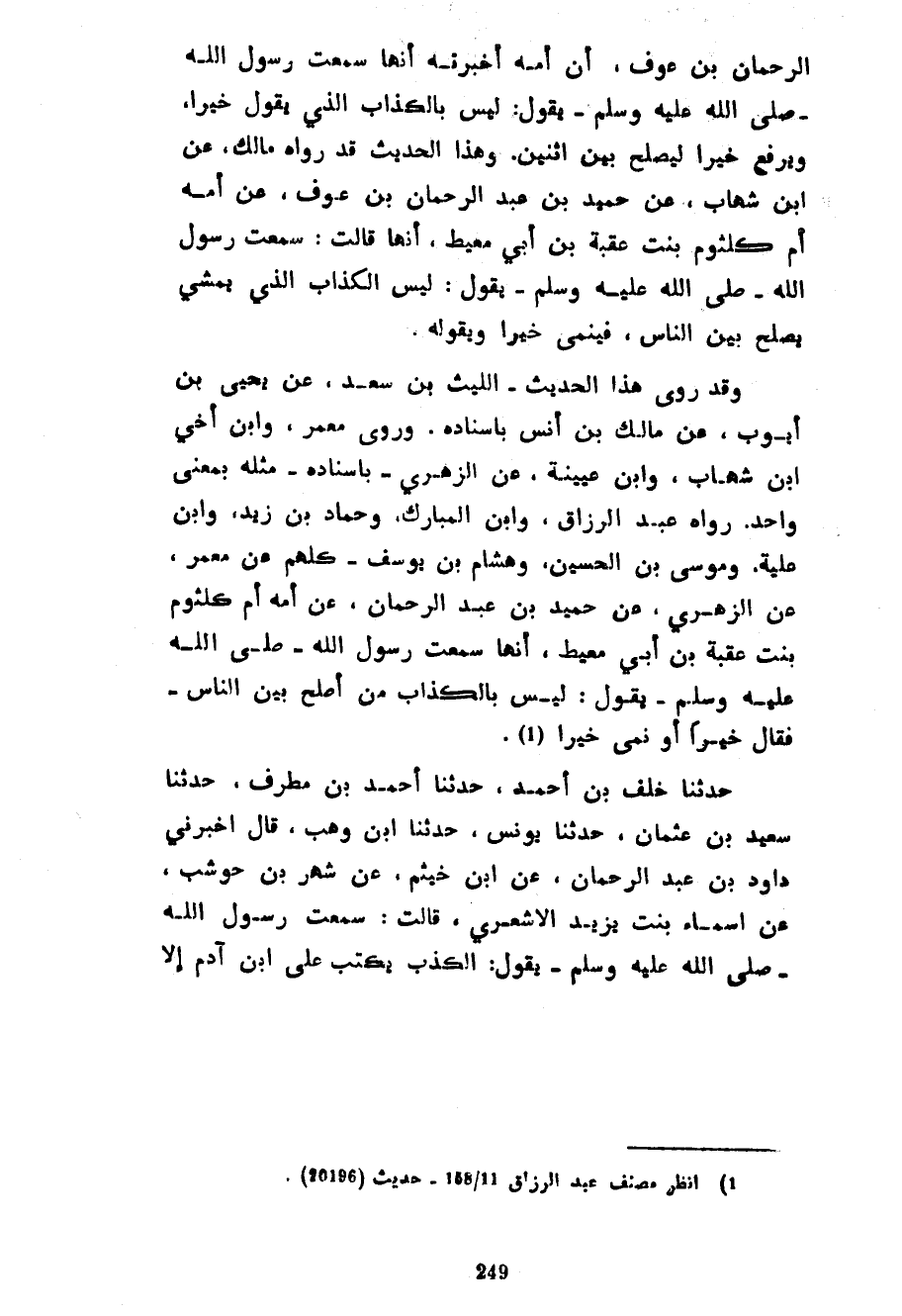 الرحمان بْنِ عَوْفٍ أَنَّ أُمَّهُ أَخْبَرَتْهُ أَنَّهَا سَمِعَتْ رَسُولَ اللَّهِ صَلَّى اللَّهُ عَلَيْهِ وسلم يقول لَيْسَ بِالْكَذَّابِ الَّذِي يَقُولُ خَيْرًا وَيَرْفَعُ خَيْرًا لِيُصْلِحَ بَيْنَ اثْنَيْنِ وَهَذَا الْحَدِيثُ قَدْ رَوَاهُ مَالِكٍ عَنِ ابْنِ شِهَابٍ عَنْ حُمَيْدِ بْنِ عَبْدِ الرحمان بن عوف عن أمه أم لثوم بِنْتِ عُقْبَةَ بْنِ أَبِي مُعَيْطٍ أَنَّهَا قَالَتْ سَمِعْتُ رَسُولَ اللَّهِ صَلَّى اللَّهُ عَلَيْهِ وسلم يَقُولُ لَيْسَ الْكَذَّابُ الَّذِي يَمْشِي يُصْلِحُ بَيْنَ النَّاسِ فَيَنْمِي خَيْرًا وَيَقُولُهُ وَقَدْ رَوَى هَذَا الْحَدِيثَ اللَّيْثُ بْنُ سَعْدٍ عَنْ يَحْيَى بْنُ أَيُّوبَ عَنْ مَالِكِ بْنِ أَنَسٍ بِإِسْنَادِهِ وَرَوَى مَعْمَرٌ وَابْنُ أَخِي ابْنِ شِهَابٍ وَابْنُ عُيَيْنَةَ عَنِ الزُّهْرِيِّ بِإِسْنَادِهِ مِثْلَهُ بِمَعْنًى وَاحِدٍ رَوَاهُ عَبْدُ الرَّزَّاقِ وَابْنُ الْمُبَارَكِ وَحَمَّادُ بْنُ زَيْدٍ وَابْنُ عُلَيَّةَ وَمُوسَى بْنُ الْحُسَيْنِ وَهِشَامُ بْنُ يُوسُفَ كُلُّهُمْ عَنْ مَعْمَرٍ عَنِ الزُّهْرِيِّ عَنْ حميد بن عبد الرحمان عَنْ أُمِّهِ أُمِّ كُلْثُومٍ بِنْتِ عُقْبَةَ بْنِ أَبِي مُعَيْطٍ أَنَّهَا سَمِعَتْ رَسُولَ اللَّهِ صَلَّى اللَّهُ عَلَيْهِ وَسَلَّمَ يَقُولُ لَيْسَ بِالْكَذَّابِ مَنْ أَصْلَحَ بَيْنَ النَّاسِ فَقَالَ خَيْرًا أَوْ نَمَى خَيْرًا حَدَّثَنَا خَلَفُ بْنُ أَحْمَدَ حَدَّثَنَا أَحْمَدُ بْنُ مُطَرِّفٍ حَدَّثَنَا سَعِيدُ بْنُ عُثْمَانَ حَدَّثَنَا يُونُسُ حَدَّثَنَا ابْنُ وَهْبٍ قَالَ أَخْبَرَنِي دَاوُدُ بن عبد الرحمان عَنِ ابْنِ خَيْثَمٍ عَنْ شَهْرِ بْنِ حَوْشَبٍ عَنْ أَسْمَاءَ بِنْتِ يَزِيدَ الْأَشْعَرِيِّ قَالَتْ سَمِعْتُ رَسُولَ اللَّهِ صَلَّى اللَّهُ عَلَيْهِ وسلم يقول الْكَذِبُ يُكْتَبُ عَلَى ابْنِ آدَمَ إِلَّا