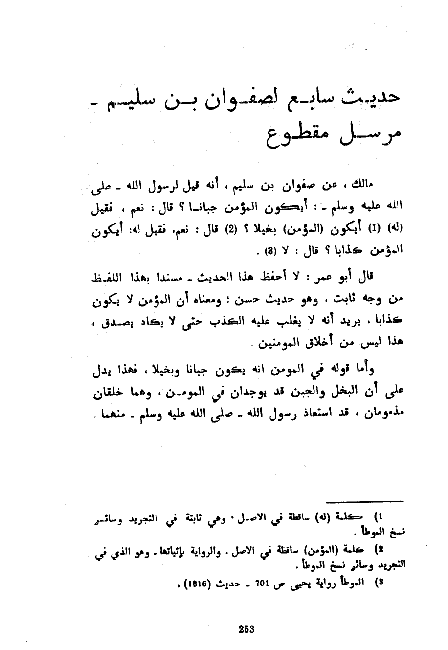 حَدِيثٌ سَابِعٌ لِصَفْوَانَ بْنِ سُلَيْمٍ مُرْسَلٌ مَقْطُوعٌ مَالِكٌ عَنْ صَفْوَانَ بْنِ سُلَيْمٍ أَنَّهُ قِيلَ لِرَسُولِ اللَّهِ صَلَّى اللَّهُ عَلَيْهِ وَسَلَّمَ أَيَكُونُ الْمُؤْمِنُ جَبَانًا قَالَ نَعَمْ فَقِيلَ (لَهُ) أَيَكُونُ (الْمُؤْمِنُ) بَخِيلًا قَالَ نَعَمْ فَقِيلَ لَهُ أَيَكُونُ الْمُؤْمِنُ كَذَّابًا قَالَ لَا قَالَ أَبُو عُمَرَ لَا أَحْفَظُ هَذَا الْحَدِيثَ مُسْنَدًا بِهَذَا اللَّفْظِ مِنْ وَجْهٍ ثَابِتٍ وَهُوَ حَدِيثٌ حَسَنٌ وَمَعْنَاهُ أَنَّ الْمُؤْمِنَ لَا يَكُونُ كَذَّابًا يُرِيدُ أَنَّهُ لَا يَغْلِبُ عَلَيْهِ الْكَذِبُ حَتَّى لَا يَكَادُ يَصْدُقُ هَذَا لَيْسَ مِنْ أَخْلَاقِ الْمُؤْمِنِينَ وَأَمَّا قَوْلُهُ فِي الْمُؤْمِنِ أَنَّهُ يَكُونُ جَبَانًا وَبَخِيلًا فَهَذَا يَدُلُّ عَلَى أَنَّ الْبُخْلَ وَالْجُبْنَ قَدْ يُوجَدَانِ فِي الْمُؤْمِنِ وَهُمَا خُلُقَانِ مَذْمُومَانِ قَدْ اسْتَعَاذَ رَسُولُ اللَّهِ صَلَّى اللَّهُ عَلَيْهِ وَسَلَّمَ مِنْهُمَا