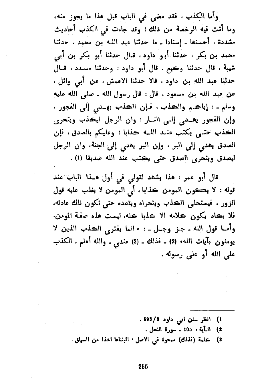وَأَمَّا الْكَذِبُ فَقَدْ مَضَى فِي الْبَابِ قَبْلَ هَذَا مَا يَجُوزُ مِنْهُ وَمَا أَتَتْ فِيهِ الرُّخْصَةُ مِنْ ذَلِكَ وَقَدْ جَاءَتْ فِي الْكَذِبِ أَحَادِيثُ مُشَدِّدَةٌ أَحْسَنُهَا إِسْنَادًا مَا حَدَّثَنَا عَبْدُ اللَّهِ بْنُ مُحَمَّدٍ حَدَّثَنَا مُحَمَّدُ بْنُ بَكْرٍ حَدَّثَنَا أَبُو دَاوُدَ قَالَ حَدَّثَنَا أَبُو بَكْرِ بْنُ أَبِي شَيْبَةَ قَالَ حَدَّثَنَا وَكِيعٌ قَالَ أَبُو دَاوُدَ وَحَدَّثَنَا مُسَدَّدٌ قَالَ حَدَّثَنَا عَبْدُ اللَّهِ بْنُ دَاوُدَ قَالَا حَدَّثَنَا الْأَعْمَشِ عَنْ أَبِي وَائِلٍ عَنْ عَبْدِ اللَّهِ بْنِ مَسْعُودٍ قَالَ قَالَ رَسُولُ اللَّهِ صَلَّى اللَّهُ عَلَيْهِ وَسَلَّمَ إِيَّاكُمْ وَالْكَذِبَ فَإِنَّ الْكَذِبَ يَهْدِي إِلَى الْفُجُورِ وَإِنَّ الْفُجُورَ يَهْدِي إِلَى النَّارِ وَإِنَّ الرَّجُلَ لَيَكْذِبُ وَيَتَحَرَّى الْكَذِبَ حَتَّى يُكْتَبَ عِنْدَ اللَّهِ كَذَّابًا وَعَلَيْكُمْ بِالصِّدْقِ فَإِنَّ الصِّدْقَ يَهْدِي إِلَى الْبِرِّ وَإِنَّ الْبِرَّ يَهْدِي إِلَى الْجَنَّةِ وَإِنَّ الرَّجُلَ لَيَصْدُقُ وَيَتَحَرَّى الصِّدْقَ حَتَّى يُكْتَبَ عِنْدَ اللَّهِ صِدِّيقًا قَالَ أَبُو عُمَرَ هَذَا يَشْهَدُ لِقَوْلِي فِي أَوَّلِ هَذَا الْبَابِ عِنْدَ قَوْلِهِ لَا يَكُونُ الْمُؤْمِنُ كَذَّابًا أَيْ الْمُؤْمِنُ لَا يَغْلِبُ عَلَيْهِ قَوْلُ الزُّورِ فَيَسْتَحْلِي الْكَذِبَ وَيَتَحَرَّاهُ وَيَقْصِدُهُ حَتَّى تَكُونَ تِلْكَ عَادَتَهُ فَلَا يَكَادُ يَكُونُ كَلَامُهُ إِلَّا كَذِبًا كُلُهُ لَيْسَتْ هَذِهِ صِفَةَ الْمُؤْمِنِ وَأَمَّا قَوْلُ اللَّهِ عَزَّ وَجَلَّ إِنَّمَا يَفْتَرِي الْكَذِبَ الَّذِينَ لَا يُؤْمِنُونَ بِآيَاتِ اللَّهِ فَذَلِكَ عِنْدِي وَاللَّهُ أَعْلَمُ الْكَذِبُ عَلَى اللَّهِ أَوْ عَلَى رَسُولِهِ
