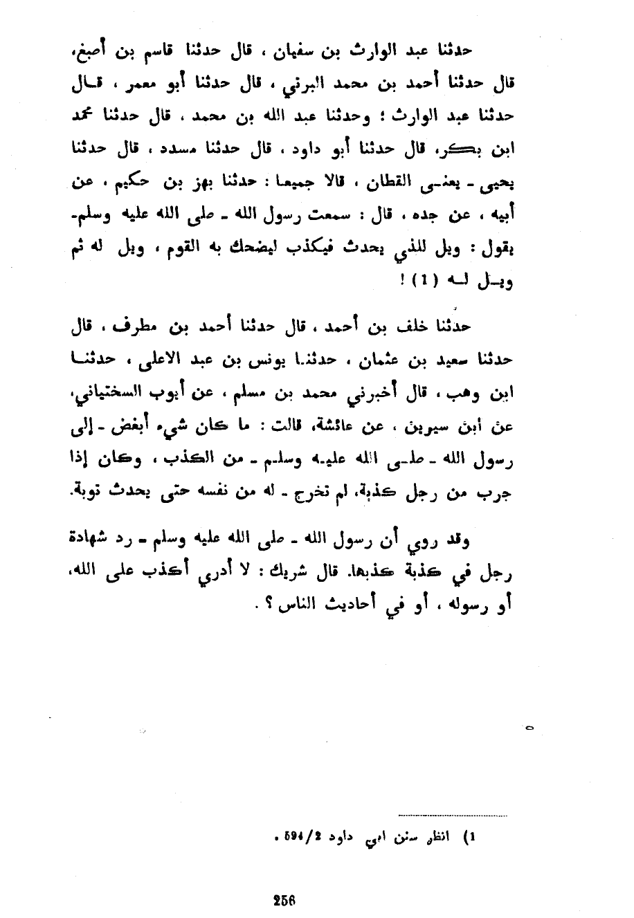 حَدَّثَنَا عَبْدُ الْوَارِثِ بْنُ سُفْيَانَ قَالَ حَدَّثَنَا قَاسِمُ بْنُ أَصْبَغَ قَالَ حَدَّثَنَا أَحْمَدُ بْنُ مُحَمَّدٍ الْبِرْتِيُّ قَالَ حَدَّثَنَا أَبُو مَعْمَرٍ قَالَ حَدَّثَنَا عَبْدُ الْوَارِثِ وَحَدَّثَنَا عَبْدُ اللَّهِ بْنُ مُحَمَّدٍ قَالَ حَدَّثَنَا مُحَمَّدُ بْنُ بَكْرٍ قَالَ حَدَّثَنَا أَبُو دَاوُدَ قَالَ حَدَّثَنَا مُسَدَّدٌ قَالَ حَدَّثَنَا يَحْيَى يَعْنِي الْقَطَّانَ قَالَا جَمِيعًا حَدَّثَنَا بَهْزُ بْنُ حَكِيمٍ عَنْ أَبِيهِ عَنْ جَدِّهِ قَالَ سَمِعْتُ رَسُولَ اللَّهِ صَلَّى اللَّهُ عَلَيْهِ وَسَلَّمَ يَقُولُ وَيْلٌ لِلَّذِي يُحَدِّثُ فَيَكْذِبُ لِيُضْحِكَ بِهِ الْقَوْمَ وَيْلٌ لَهُ ثُمَّ وَيْلٌ لَهُ حَدَّثَنَا خَلَفُ بْنُ أَحْمَدَ قَالَ حَدَّثَنَا أَحْمَدُ بْنُ مُطَرِّفٍ قَالَ حَدَّثَنَا سَعِيدُ بْنُ عُثْمَانَ حَدَّثَنَا يُونُسُ بْنُ عَبْدِ الْأَعْلَى حَدَّثَنَا ابْنُ وَهْبٍ قَالَ أَخْبَرَنِي مُحَمَّدُ بْنُ مُسْلِمٍ عَنْ أَيُّوبَ السَّخْتِيَانِيِّ عَنِ ابْنِ سِيرِينَ عَنْ عَائِشَةَ قَالَتْ مَا كَانَ شَيْءٌ أَبْغَضَ إِلَى رَسُولِ اللَّهِ صَلَّى اللَّهُ عَلَيْهِ وَسَلَّمَ مِنَ الْكَذِبِ وَكَانَ إِذَا جَرَّبَ مِنْ رَجُلٍ كِذْبَةً لَمْ تَخْرُجْ لَهُ مِنْ نَفْسِهِ حَتَّى يُحْدِثَ تَوْبَةً وَقَدْ رُوِيَ أَنَّ رَسُولَ اللَّهِ صَلَّى اللَّهُ عَلَيْهِ وَسَلَّمَ رَدَّ شَهَادَةَ رَجُلٍ فِي كِذْبَةٍ كَذَبَهَا قَالَ شَرِيكٌ لَا أَدْرِي أَكَذَبَ عَلَى اللَّهِ أَوْ رَسُولِهِ أَوْ فِي أَحَادِيثِ النَّاسِ