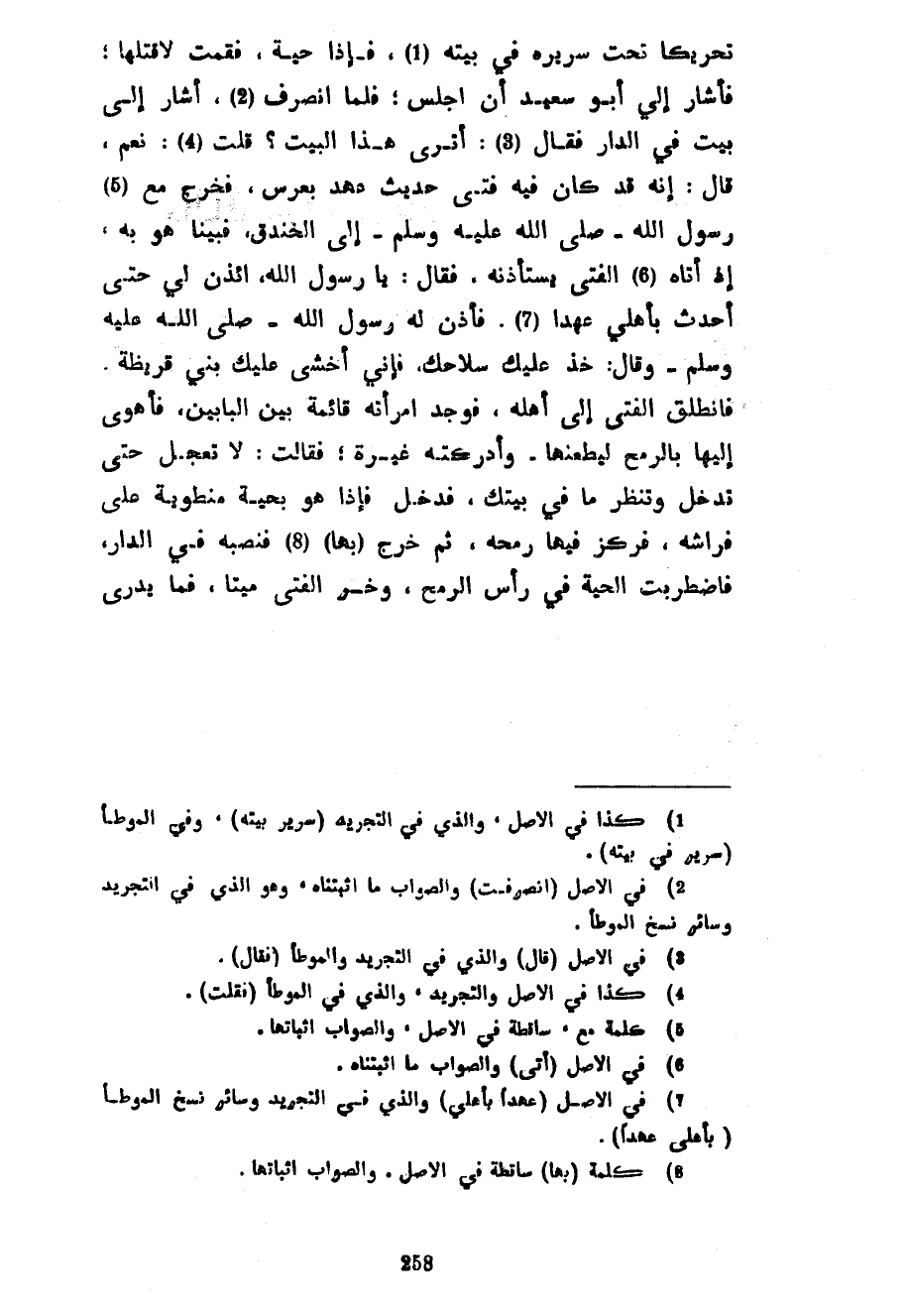 تَحْرِيكًا تَحْتَ سَرِيرِهِ فِي بَيْتِهِ فَإِذَا حَيَّةٌ فَقُمْتُ لِأَقْتُلَهَا فَأَشَارَ إِلَيَّ أَبُو سَعِيدٍ أَنِ اجلس فلما انصرفت أَشَارَ إِلَى بَيْتٍ فِي الدَّارِ فَقَالَ أَتَرَى هَذَا الْبَيْتَ قُلْتُ نَعَمْ قَالَ إِنَّهُ قَدْ كَانَ فِيهِ فَتًى حَدِيثُ عَهْدٍ بِعُرْسٍ فَخَرَجَ مَعَ رَسُولِ اللَّهِ صَلَّى اللَّهُ عَلَيْهِ وَسَلَّمَ إِلَى الْخَنْدَقِ فَبَيْنَا هُوَ بِهِ إِذْ أَتَاهُ الْفَتَى يَسْتَأْذِنُهُ فَقَالَ يَا رَسُولَ اللَّهِ ائْذَنْ لِي حَتَّى أُحْدِثَ بِأَهْلِي عَهْدًا فَأَذِنَ لَهُ رَسُولُ اللَّهِ صَلَّى اللَّهُ عَلَيْهِ وَسَلَّمَ وقال خُذْ عَلَيْكَ سِلَاحَكَ فَإِنِّي أَخْشَى عَلَيْكَ بَنِي قُرَيْظَةَ فَانْطَلَقَ الْفَتَى إِلَى أَهْلِهِ فَوَجَدَ امْرَأَتَهُ قَائِمَةً بَيْنَ الْبَابَيْنِ فَأَهْوَى إِلَيْهَا بِالرُّمْحِ لِيَطْعَنَهَا وَأَدْرَكَتْهُ غَيْرَةٌ فَقَالَتْ لَا تَعْجَلْ حَتَّى تَدْخُلَ وَتَنْظُرَ مَا فِي بَيْتِكَ فَدَخَلَ فَإِذَا هُوَ بِحَيَّةٍ مُنْطَوِيَةٍ عَلَى فِرَاشِهِ فَرَكَزَ فِيهَا رُمْحَهُ ثُمَّ خَرَجَ (بِهَا) فَنَصَبَهُ فِي الدَّارِ فَاضْطَرَبَتِ الْحَيَّةُ فِي رَأْسِ الرُّمْحِ وَخَرَّ الْفَتَى مَيِّتًا فما يدرى