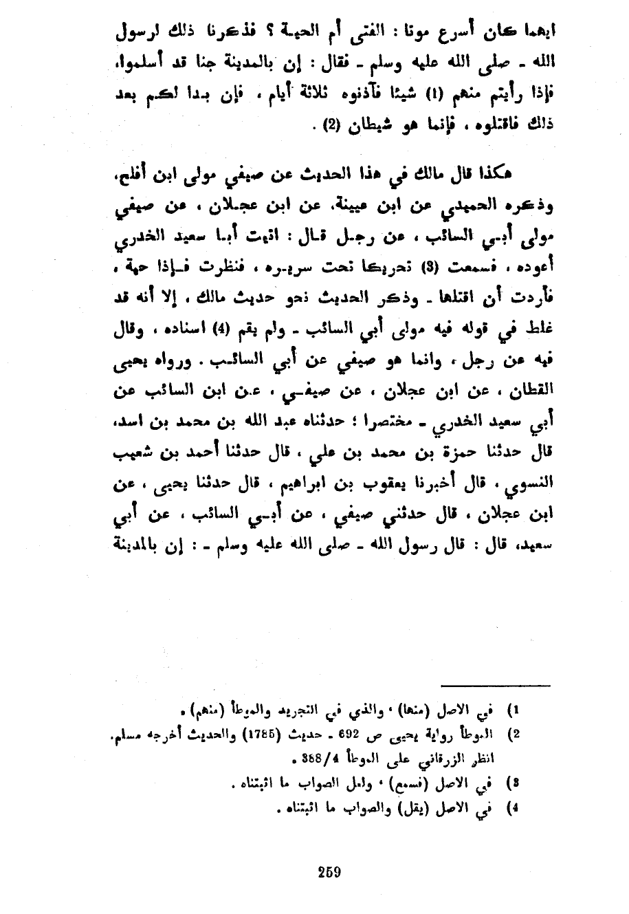 أَيُّهُمَا كَانَ أَسْرَعُ مَوْتًا الْفَتَى أَمِ الْحَيَّةُ فَذَكَرْنَا ذَلِكَ لِرَسُولِ اللَّهِ صَلَّى اللَّهُ عَلَيْهِ وَسَلَّمَ فَقَالَ إِنَّ بِالْمَدِينَةِ جِنًّا قَدْ أَسْلَمُوا فَإِذَا رَأَيْتُمْ مِنْهُمْ شَيْئًا فَآذِنُوهُ ثَلَاثَةَ أَيَّامٍ فَإِنْ بَدَا لَكُمْ بَعْدَ ذَلِكَ فَاقْتُلُوهُ فَإِنَّمَا هُوَ شَيْطَانٌ هَكَذَا قَالَ مَالِكٌ فِي هَذَا الْحَدِيثِ عَنْ صَيْفِيٍّ مَوْلَى ابْنِ أَفْلَحَ وَذَكَرَهُ الْحُمَيْدِيُّ عَنِ ابْنِ عُيَيْنَةَ عَنِ ابْنِ عَجْلَانَ عَنْ صَيْفِيٍّ مَوْلَى أَبِي السَّائِبِ عَنْ رَجُلٍ قَالَ أَتَيْتُ أَبَا سَعِيدٍ الْخُدْرِيَّ أَعُودُهُ فَسَمِعْتُ تَحْرِيكًا تَحْتَ سَرِيرِهِ فَنَظَرْتُ فَإِذَا حَيَّةٌ فَأَرَدْتُ أَنْ أَقْتُلَهَا وَذَكَرَ الْحَدِيثَ نَحْوَ حَدِيثِ مَالِكٍ إِلَّا أَنَّهُ قَدْ غَلِطَ فِي قَوْلِهِ فِيهِ مَوْلَى أَبِي السَّائِبِ وَلَمْ يُقِمْ إِسْنَادَهُ وَقَالَ فِيهِ عَنْ رَجُلٍ وَإِنَّمَا هُوَ صَيْفِيٌّ عَنْ أَبِي السَّائِبِ وَرَوَاهُ يَحْيَى الْقَطَّانُ عَنِ ابْنِ عَجْلَانَ عَنْ صَيْفِيٍّ عَنِ ابْنِ السَّائِبِ عَنْ أَبِي سَعِيدٍ الْخُدْرِيِّ مُخْتَصَرًا حَدَّثَنَاهُ عَبْدُ اللَّهِ بْنُ مُحَمَّدِ بْنِ أَسَدٍ قَالَ حَدَّثَنَا حَمْزَةُ بْنُ مُحَمَّدِ بْنِ عَلِيٍّ قَالَ حَدَّثَنَا أَحْمَدُ بْنُ شُعَيْبٍ النَّسَوِيُّ قَالَ أَخْبَرَنَا يَعْقُوبُ بْنُ إِبْرَاهِيمَ قَالَ حَدَّثَنَا يَحْيَى عَنْ ابْنِ عَجْلَانَ قَالَ حَدَّثَنِي صَيْفِيٍّ عَنْ أَبِي السَّائِبِ عَنْ أَبِي سَعِيدٍ قَالَ قَالَ رَسُولُ اللَّهِ صَلَّى اللَّهُ عَلَيْهِ وَسَلَّمَ إِنَّ بِالْمَدِينَةِ