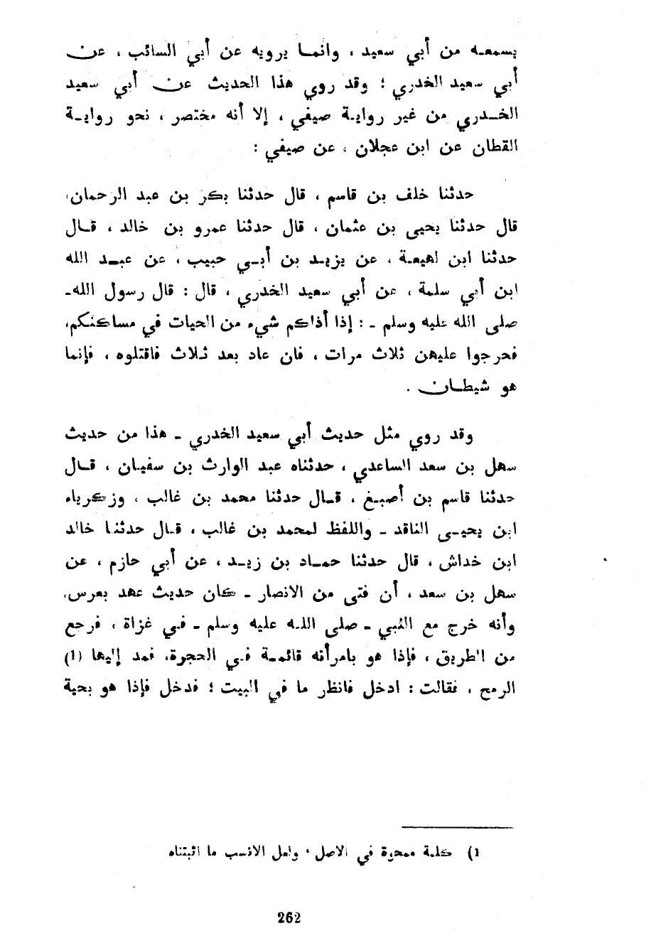 يَسْمَعْهُ مِنْ أَبِي سَعِيدٍ وَإِنَّمَا يَرْوِيهِ عَنْ أَبِي السَّائِبِ عَنْ أَبِي سَعِيدٍ الْخُدْرِيِّ وَقَدْ رُوِيَ هَذَا الْحَدِيثُ عَنْ أَبِي سَعِيدٍ الْخُدْرِيِّ مِنْ غَيْرِ رِوَايَةِ صَيْفِيٍّ إِلَّا أَنَّهُ مُخْتَصَرٌ نَحْوَ رِوَايَةِ الْقَطَّانِ عَنِ ابْنِ عَجْلَانَ عَنْ صَيْفِيٍّ حَدَّثَنَا خَلَفُ بْنُ قَاسِمٍ قَالَ حَدَّثَنَا بكر بن عبد الرحمان قَالَ حَدَّثَنَا يَحْيَى بْنُ عُثْمَانَ قَالَ حَدَّثَنَا عَمْرُو بْنُ خَالِدٍ قَالَ حَدَّثَنَا ابْنُ لَهِيعَةَ عَنْ يَزِيدَ بْنِ أَبِي حَبِيبٍ عَنْ عَبْدِ اللَّهِ بْنِ أَبِي سَلَمَةَ عَنْ أَبِي سَعِيدٍ الْخُدْرِيِّ قَالَ قَالَ رَسُولُ اللَّهِ صَلَّى اللَّهُ عَلَيْهِ وَسَلَّمَ إِذَا آذَاكُمْ شَيْءٌ مِنَ الْحَيَّاتِ فِي مَسَاكِنِكُمْ فَحَرِّجُوا عَلَيْهِنَّ ثَلَاثَ مَرَّاتٍ فَإِنْ عَادَ بَعْدَ ثَلَاثٍ فَاقْتُلُوهُ فَإِنَّمَا هُوَ شَيْطَانٌ وَقَدْ رُوِيَ مِثْلُ حَدِيثِ أَبِي سَعِيدٍ الْخُدْرِيِّ هَذَا مِنْ حَدِيثِ سَهْلِ بْنِ سَعْدٍ السَّاعِدِيِّ حَدَّثَنَاهُ عَبْدُ الْوَارِثِ بْنُ سُفْيَانَ قَالَ حَدَّثَنَا قَاسِمُ بْنُ أَصْبَغَ قَالَ حَدَّثَنَا مُحَمَّدُ بْنُ غَالِبٍ وَزَكَرِيَّاءُ بْنُ يَحْيَى النَّاقِدُ وَاللَّفْظُ لِمُحَمَّدِ بْنِ غَالِبٍ قَالَ حَدَّثَنَا خَالِدُ بْنُ خِدَاشٍ قَالَ حَدَّثَنَا حَمَّادُ بْنُ زَيْدٍ عَنْ أَبِي حَازِمٍ عَنْ سَهْلِ بْنِ سَعْدٍ أَنَّ فَتًى مِنَ الْأَنْصَارِ كَانَ حَدِيثَ عَهْدٍ بِعُرْسٍ وَأَنَّهُ خَرَجَ مَعَ النَّبِيِّ صَلَّى اللَّهُ عَلَيْهِ وَسَلَّمَ فِي غَزَاةٍ فَرَجَعَ مِنَ الطَّرِيقِ فَإِذَا هُوَ بِامْرَأَتِهِ قَائِمَةً فِي الْحُجْرَةِ فَمَدَّ إِلَيْهَا الرُّمْحَ فَقَالَتْ ادْخُلْ فَانْظُرْ مَا فِي الْبَيْتِ فَدَخَلَ فَإِذَا هُوَ بِحَيَّةٍ
