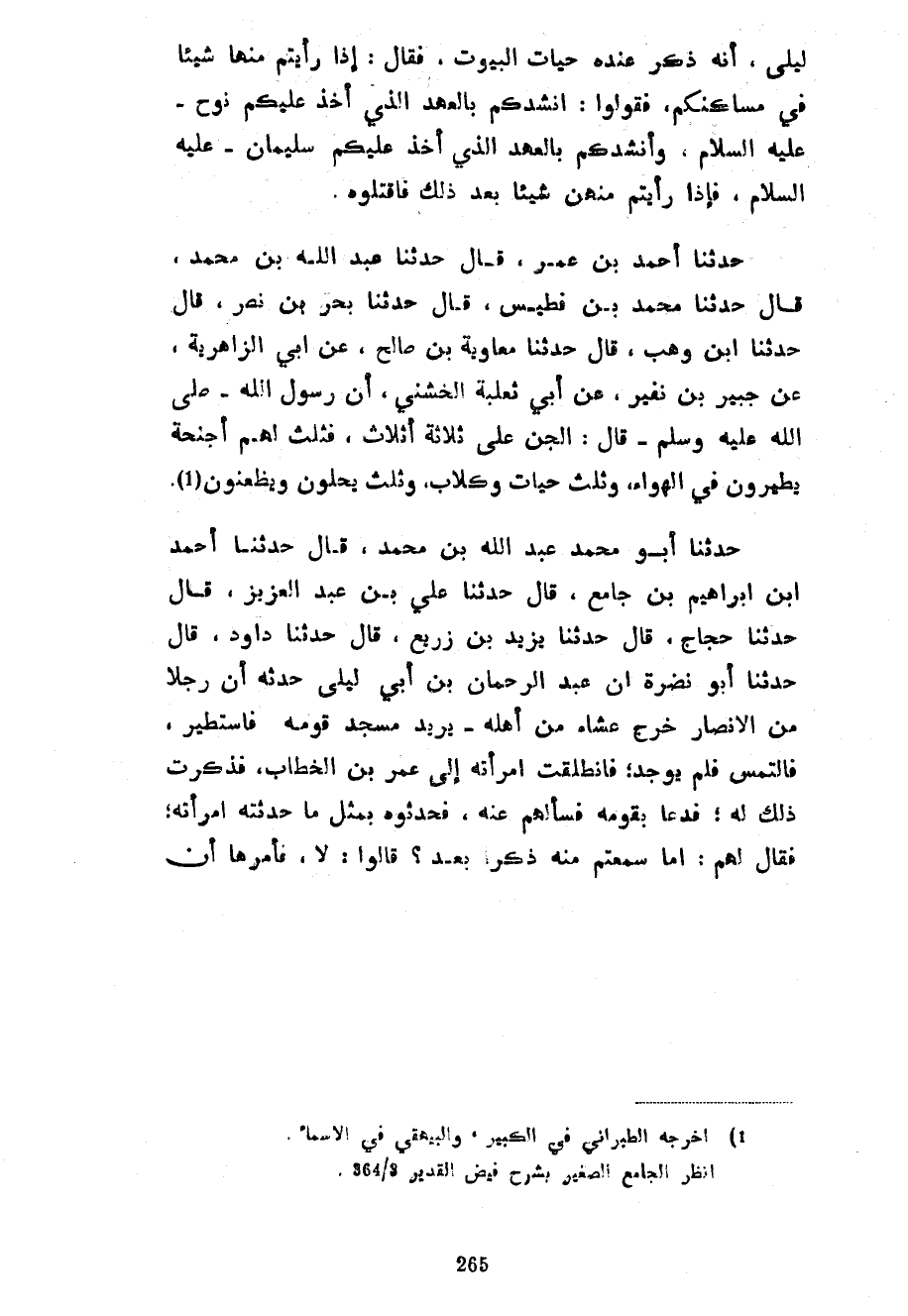 ليلى أنه ذكر عنده حَيَّاتُ الْبُيُوتِ فَقَالَ إِذَا رَأَيْتُمْ مِنْهَا شَيْئًا فِي مَسَاكِنِكُمْ فَقُولُوا أَنْشُدُكُمْ بِالْعَهْدِ الَّذِي أَخَذَ عَلَيْكُمْ نُوحٌ عَلَيْهِ السَّلَامُ وَأَنْشُدُكُمْ بِالْعَهْدِ الَّذِي أَخَذَ عَلَيْكُمْ سُلَيْمَانُ عَلَيْهِ السَّلَامُ فَإِذَا رَأَيْتُمْ مِنْهُنَّ شَيْئًا بَعْدَ ذَلِكَ فَاقْتُلُوهُ حَدَّثَنَا أَحْمَدُ بْنُ عُمَرَ قَالَ حَدَّثَنَا عَبْدُ اللَّهِ بْنُ مُحَمَّدٍ قَالَ حَدَّثَنَا مُحَمَّدُ بْنُ فُطَيْسٍ قَالَ حدثا بَحْرُ بْنُ نَصْرٍ قَالَ حَدَّثَنَا ابْنُ وَهْبٍ قَالَ حَدَّثَنَا مُعَاوِيَةَ بْنِ صَالِحٍ عَنْ أَبِي الزَّاهِرِيَّةِ عَنْ جُبَيْرِ بْنِ نُفَيْرٍ عَنْ أَبِي ثَعْلَبَةَ الْخُشَنِيِّ أَنَّ رَسُولَ اللَّهِ صَلَّى اللَّهُ عَلَيْهِ وَسَلَّمَ قَالَ الْجِنُّ عَلَى ثَلَاثَةِ أَثْلَاثٍ فَثُلُثٌ لَهُمْ أَجْنِحَةٌ يَطِيرُونَ فِي الْهَوَاءِ وَثُلُثٌ حَيَّاتٌ وَكِلَابٌ وَثُلُثٌ يَحُلُّونَ وَيَظْعَنُونَ حَدَّثَنَا أَبُو مُحَمَّدٍ عَبْدُ اللَّهِ بْنُ مُحَمَّدِ قَالَ حَدَّثَنَا أَحْمَدُ بْنُ إِبْرَاهِيمَ بْنِ جَامِعٍ قَالَ حَدَّثَنَا عَلِيُّ بْنُ عَبْدِ الْعَزِيزِ قَالَ حَدَّثَنَا حَجَّاجٌ قَالَ حَدَّثَنَا يَزِيدُ بْنُ زُرَيْعٍ قَالَ حَدَّثَنَا دَاوُدُ قَالَ حَدَّثَنَا أَبُو نَضْرَةَ أَنَّ عَبْدَ الرحمان بْنَ أَبِي لَيْلَى حَدَّثَهُ أَنَّ رَجُلًا مِنَ الْأَنْصَارِ خَرَجَ عِشَاءً مِنْ أَهْلِهِ يُرِيدُ مَسْجِدَ قَوْمِهِ فَاسْتُطِيرَ فَالْتُمِسَ فَلَمْ يُوجَدْ فَانْطَلَقَتِ امْرَأَتُهُ إِلَى عُمَرَ بْنِ الْخَطَّابِ فَذَكَرَتْ ذَلِكَ لَهُ فَدَعَا بِقَوْمِهِ فَسَأَلَهُمْ عَنْهُ فَحَدَّثُوهُ بِمِثْلِ مَا حَدَّثَتْهُ امْرَأَتُهُ فَقَالَ لَهُمْ أَمَا سَمِعْتُمْ مِنْهُ ذِكْرًا بَعْدُ قَالُوا لَا فَأَمَرَهَا أَنْ