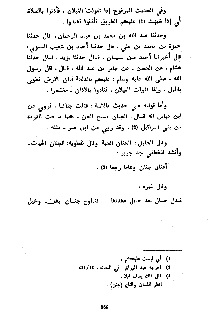 وَفِي الْحَدِيثِ الْمَرْفُوعِ إِذَا تَغَوَّلَتِ الْغِيلَانُ فَأَذِّنُوا بِالصَّلَاةِ أَيْ إِذَا شُبِّهَتْ عَلَيْكُمُ الطَّرِيقُ فَأَذِّنُوا وَحَدَّثَنَا عَبْدُ اللَّهِ بْنُ مُحَمَّدِ بْنِ عَبْدِ الرحمان قَالَ حَدَّثَنَا حَمْزَةُ بْنُ مُحَمَّدِ بْنِ عَلِيٍّ قَالَ حَدَّثَنَا أَحْمَدُ بْنُ شُعَيْبٍ النَّسَوِيُّ قَالَ أَخْبَرَنَا أَحْمَدُ بْنُ سُلَيْمَانَ قَالَ حَدَّثَنَا يَزِيدُ قَالَ حَدَّثَنَا هِشَامٌ عَنِ الْحَسَنِ عَنْ جَابِرِ بْنِ عَبْدِ اللَّهِ قَالَ قَالَ رَسُولُ اللَّهِ صَلَّى اللَّهُ عَلَيْهِ وَسَلَّمَ عَلَيْكُمْ بِالدُّلْجَةِ فَإِنَّ الْأَرْضَ تُطْوَى بِاللَّيْلِ وَإِذَا تَغَوَّلَتِ الْغِيلَانُ فَنَادُوا بِالْأَذَانِ مُخْتَصَرًا وَأَمَّا قَوْلُهُ فِي حَدِيثِ عَائِشَةَ قَتَلَتْ جِنَّانًا فَرُوِيَ عَنِ ابْنِ عَبَّاسٍ أَنَّهُ قَالَ الْجِنَانُ مَسْخُ الْجِنِّ كَمَا مُسِخَتِ الْقِرَدَةُ مِنْ بَنِي إِسْرَائِيلَ وَقَدْ رُوِيَ عَنِ ابْنِ عُمَرَ مِثْلُهُ وَقَالَ الْخَلِيلُ الْجِنَّانُ الْحَيَّةُ وَقَالَ نِفْطَوَيْهِ الْجِنَّانُ الْحَيَّاتُ وَأَنْشَدَ لِلْخَطَفِيِّ جَدِّ جَرِيرٍ ... أَعْنَاقُ جِنَّانٍ وَهَامَا رُجَّفَا ... وَقَالَ غَيْرُهُ ... تَبَدَّلَ حال بعد حال عهدنها ... تُنَاوِحُ جِنَّانٌ بِهِنَّ وَخُيَّلُ