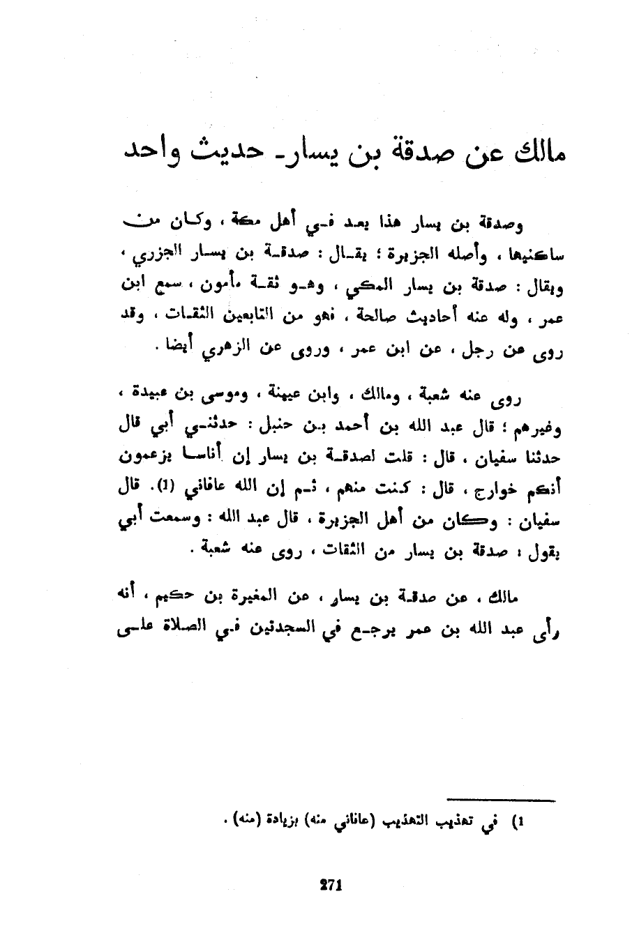 مَالِكٌ عَنْ صَدَقَةَ بْنِ يَسَارٍ حَدِيثٌ وَاحِدٌ وَصَدَقَةُ بْنُ يَسَارٍ هَذَا يُعَدُّ فِي أَهْلِ مَكَّةَ وَكَانَ مِنْ سَاكِنِيهَا وَأَصْلُهُ الْجَزِيرَةُ يُقَالُ صَدَقَةُ بْنُ يَسَارٍ الْجَزَرِيُّ وَيُقَالُ صَدَقَةُ بْنُ يَسَارٍ الْمَكِّيُّ وَهُوَ ثِقَةٌ مَأْمُونٌ سَمِعَ ابْنَ عُمَرَ وَلَهُ عَنْهُ أَحَادِيثُ صَالِحَةٌ فَهُوَ مِنَ التَّابِعِينَ الثِّقَاتِ وَقَدْ رَوَى عَنْ رَجُلٍ عَنِ ابْنِ عُمَرَ وَرَوَى عَنِ الزُّهْرِيِّ أَيْضًا رَوَى عَنْهُ شُعْبَةُ وَمَالِكٌ وَابْنُ عُيَيْنَةَ وَمُوسَى بْنُ عُبَيْدَةَ وَغَيْرُهُمْ قَالَ عَبْدُ اللَّهِ بْنُ أَحْمَدَ بْنِ حَنْبَلٍ حَدَّثَنِي أَبِي قَالَ حَدَّثَنَا سُفْيَانُ قَالَ قُلْتُ لِصَدَقَةَ بْنِ يَسَارٍ إِنَّ أُنَاسًا يَزْعُمُونَ أَنَّكُمْ خَوَارِجُ قَالَ كُنْتُ مِنْهُمْ ثُمَّ إِنَّ اللَّهَ عَافَانِي قَالَ سُفْيَانُ وَكَانَ مِنْ أَهْلِ الْجَزِيرَةِ قَالَ عَبْدُ اللَّهِ وَسَمِعْتُ أَبِي يَقُولُ صَدَقَةُ بْنُ يَسَارٍ مِنَ الثِّقَاتِ رَوَى عَنْهُ شُعْبَةُ مَالِكٌ عَنْ صَدَقَةَ بْنِ يَسَارٍ عَنِ الْمُغِيرَةِ بْنِ حَكِيمٍ أَنَّهُ رَأَى عَبْدَ اللَّهِ بْنَ عُمَرَ يَرْجِعُ فِي السَّجْدَتَيْنِ فِي الصلاة على