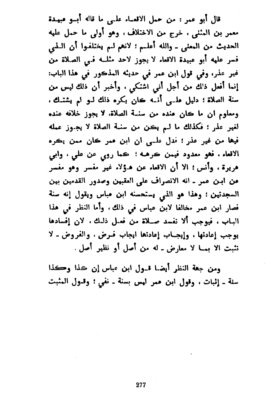 قَالَ أَبُو عُمَرَ مَنْ حَمَلَ الْإِقْعَاءَ عَلَى مَا قَالَهُ أَبُو عُبَيْدَةَ مَعْمَرُ بْنُ الْمُثَنَّى خَرَجَ مِنَ الِاخْتِلَافِ وَهُوَ أَوْلَى مَا حُمِلَ عَلَيْهِ الْحَدِيثُ مِنَ الْمَعْنَى وَاللَّهُ أَعْلَمُ لِأَنَّهُمْ لَمْ يَخْتَلِفُوا أَنَّ الَّذِي فَسَّرَ عَلَيْهِ أَبُو عُبَيْدَةَ الْإِقْعَاءَ لَا يَجُوزُ لِأَحَدٍ مِثْلُهُ فِي الصَّلَاةِ مِنْ غَيْرِ عُذْرٍ وَفِي قَوْلِ ابْنِ عُمَرَ فِي حَدِيثِهِ الْمَذْكُورِ فِي هَذَا الْبَابِ إِنَّمَا أَفْعَلُ ذَلِكَ مِنْ أَجْلِ أَنِّي أَشْتَكِي وَأَخْبَرَ أَنَّ ذَلِكَ لَيْسَ مِنْ سُنَّةِ الصَّلَاةِ دَلِيلٌ عَلَى أَنَّهُ كَانَ يَكْرَهُ ذَلِكَ لَوْ لَمْ يَشْتَكِ وَمَعْلُومٌ أَنَّ مَا كَانَ عِنْدَهُ مِنْ سُنَّةِ الصَّلَاةِ لَا يَجُوزُ خِلَافُهُ عِنْدَهُ لِغَيْرِ عُذْرٍ فَكَذَلِكَ مَا لَمْ يَكُنْ مِنْ سُنَّةِ الصَّلَاةِ لَا يَجُوزُ عَمَلُهُ فِيهَا مِنْ غَيْرِ عُذْرٍ فَدَلَّ عَلَى أَنَّ ابْنَ عُمَرَ كَانَ مِمَّنْ يَكْرَهُ الْإِقْعَاءَ فَهُوَ مَعْدُودٌ فِيمَنْ كَرِهَهُ كَمَا رُوِيَ عَنْ عَلِيٍّ وَأَبِي هُرَيْرَةَ وَأَنَسٍ إِلَّا أَنَّ الْإِقْعَاءَ عَنْ هَؤُلَاءِ غَيْرُ مُفَسَّرٍ وَهُوَ مُفَسَّرٌ عَنِ ابْنِ عُمَرَ أَنَّهُ الِانْصِرَافُ عَلَى الْعَقِبَيْنِ وَصُدُورِ الْقَدَمَيْنِ بَيْنَ السَّجْدَتَيْنِ وَهَذَا هُوَ الَّذِي يَسْتَحْسِنُهُ ابْنُ عَبَّاسٍ وَيَقُولُ إِنَّهُ سُنَّةٌ فَصَارَ ابْنُ عُمَرَ مُخَالِفًا لِابْنِ عَبَّاسٍ فِي ذَلِكَ وَأَمَّا النَّظَرُ فِي هَذَا الْبَابِ فَيُوجِبُ أَلَّا تَفْسُدَ صَلَاةُ مَنْ فَعَلَ ذَلِكَ لِأَنَّ إِفْسَادَهَا يُوجِبُ إِعَادَتَهَا وَإِيجَابُ إِعَادَتِهَا إِيجَابُ فَرْضٍ وَالْفُرُوضُ لَا تَثْبُتْ إِلَّا بِمَا لَا مُعَارِضَ لَهُ مِنْ أَصْلٍ أَوْ نَظِيرِ أَصْلٍ وَمِنْ جِهَةِ النَّظَرِ أَيْضًا قَوْلُ ابْنِ عَبَّاسٍ إِنَّ كَذَا وَكَذَا سُنَّةٌ إِثْبَاتٌ وَقَوْلُ ابْنِ عُمَرَ لَيْسَ بِسُنَّةٍ نَفْيٌ وَقَوْلُ الْمُثْبِتِ