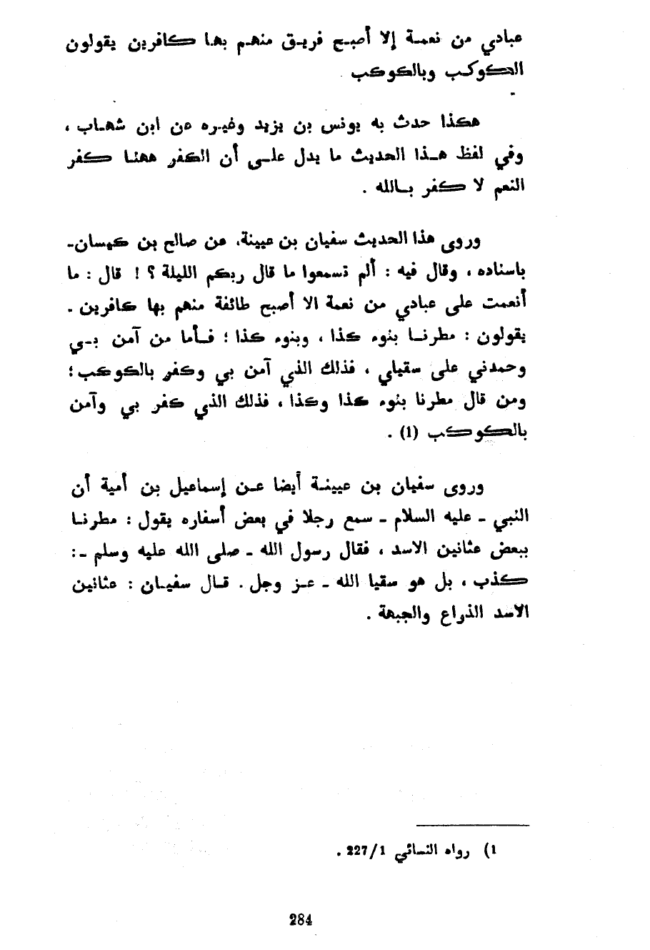 عِبَادِي مِنْ نِعْمَةٍ إِلَّا أَصْبَحَ فَرِيقٌ مِنْهُمْ بِهَا كَافِرِينَ يَقُولُونَ الْكَوْكَبُ وَبِالْكَوْكَبِ هَكَذَا حَدَّثَ بِهِ يُونُسُ بْنُ يَزِيدَ وَغَيْرُهُ عَنِ ابْنِ شِهَابٍ وَفِي لَفْظِ هَذَا الْحَدِيثِ مَا يَدُلُّ على أن الكفر ههنا كُفْرُ النِّعَمِ لَا كُفْرٌ بِاللَّهِ وَرَوَى هَذَا الْحَدِيثَ سُفْيَانُ بْنُ عُيَيْنَةَ عَنْ صَالِحِ بْنِ كَيْسَانَ بِإِسْنَادِهِ وَقَالَ فِيهِ أَلَمْ تَسْمَعُوا مَا قَالَ رَبُّكُمُ اللَّيْلَةَ قَالَ مَا أَنْعَمْتُ عَلَى عِبَادِي مِنْ نِعْمَةٍ إِلَّا أَصْبَحَ طَائِفَةٌ مِنْهُمْ بِهَا كَافِرِينَ يَقُولُونَ مُطِرْنَا بِنَوْءِ كَذَا وَبِنَوْءِ كَذَا فَأَمَّا مَنْ آمَنَ بِي وَحَمِدَنِي عَلَى سُقْيَايَ فَذَلِكَ الَّذِي آمَنَ بِي وَكَفَرَ بِالْكَوْكَبِ وَمَنْ قَالَ مُطِرْنَا بِنَوْءِ كَذَا وَكَذَا فَذَلِكَ الَّذِي كَفَرَ بِي وَآمَنَ بِالْكَوْكَبِ وَرَوَى سُفْيَانُ بْنُ عُيَيْنَةَ أَيْضًا عَنْ إِسْمَاعِيلَ بْنِ أُمَيَّةَ أَنَّ النَّبِيَّ عَلَيْهِ السَّلَامُ سَمِعَ رَجُلًا فِي بَعْضِ أَسْفَارِهِ يَقُولُ مُطِرْنَا بِبَعْضِ عَثَانِينِ الْأَسَدِ فَقَالَ رَسُولُ اللَّهِ صَلَّى اللَّهُ عَلَيْهِ وَسَلَّمَ كَذَبَ بَلْ هُوَ سُقْيَا اللَّهِ عَزَّ وَجَلَّ قَالَ سُفْيَانُ عَثَانِينُ الْأَسَدِ الذِّرَاعُ وَالْجَبْهَةُ