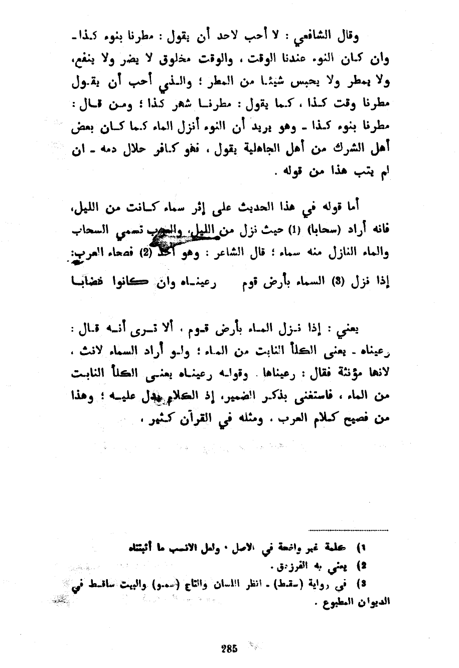 وَقَالَ الشَّافِعِيُّ لَا أُحِبُّ لِأَحَدٍ أَنْ يَقُولَ مُطِرْنَا بِنَوْءِ كَذَا وَإِنْ كَانَ النَّوْءُ عِنْدَنَا الْوَقْتُ وَالْوَقْتُ مَخْلُوقٌ لَا يَضُرُّ وَلَا يَنْفَعُ وَلَا يُمْطِرُ وَلَا يَحْبِسُ شَيْئًا مِنَ الْمَطَرِ وَالَّذِي أُحِبُّ أَنْ يَقُولَ مُطِرْنَا وَقْتَ كَذَا كَمَا يَقُولُ مُطِرْنَا شَهْرَ كَذَا وَمَنْ قَالَ مُطِرْنَا بِنَوْءِ كَذَا وَهُوَ يُرِيدُ أَنَّ النَّوْءَ أَنْزَلَ الْمَاءَ كَمَا كَانَ بَعْضُ أَهْلِ الشِّرْكِ مِنْ أَهْلِ الْجَاهِلِيَّةِ يَقُولُ فَهُوَ كَافِرٌ حَلَالٌ دمه إن لم يتب هذا من قوله أَمَّا قَوْلُهُ فِي هَذَا الْحَدِيثِ عَلَى إِثْرِ سَمَاءٍ كَانَتْ مِنَ اللَّيْلِ فَإِنَّهُ أَرَادَ (سَحَابًا) حَيْثُ نَزَلَ مِنَ اللَّيْلِ وَالْعَرَبُ تُسَمِّي السَّحَابَ وَالْمَاءَ النَّازِلَ مِنْهُ سَمَاءً قَالَ الشَّاعِرُ وَهُوَ أَحَدُ فُصَحَاءِ الْعَرَبِ ... إِذَا نَزَلَ السَّمَاءُ بِأَرْضِ قَوْمٍ ... رَعَيْنَاهُ وَإِنْ كَانُوا غِضَابًا ... يَعْنِي إِذَا نَزَلَ الْمَاءُ بِأَرْضِ قَوْمٍ أَلَا تَرَى أَنَّهُ قَالَ رَعَيْنَاهُ يَعْنِي الْكَلَأَ النَّابِتَ مِنَ الْمَاءِ وَلَوْ أَرَادَ السَّمَاءَ لَأَنَّثَ لِأَنَّهَا مُؤَنَّثَةٌ فَقَالَ رَعَيْنَاهَا وَقَوْلُهُ رَعَيْنَاهُ يَعْنِي الْكَلَأَ النَّابِتَ مِنَ الْمَاءِ فَاسْتَغْنَى بِذِكْرِ الضَّمِيرِ إِذِ الْكَلَامُ يَدُلُّ عَلَيْهِ وَهَذَا مِنْ فَصِيحِ كَلَامِ الْعَرَبِ وَمِثْلُهُ فِي الْقُرْآنِ كَثِيرٌ