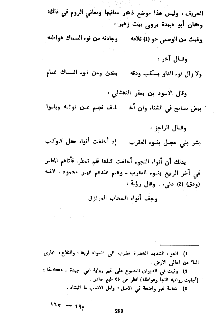 الْخَرِيفُ وَلَيْسَ هَذَا مَوْضِعَ ذِكْرِ مَعَانِيهَا وَمَعَانِي الرُّومِ فِي ذَلِكَ وَكَانَ أَبُو عُبَيْدَةَ يَرْوِي بَيْتَ زُهَيْرٍ ... وَغَيْثٍ مَنَ الْوَسْمِيِّ حُوٍّ تِلَاعُهُ ... وِجَادَتْهُ مِنْ نَوْءِ السِّمَاكِ هَوَاطِلُهُ ... وَقَالَ آخَرُ ... وَلَا زَالَ نَوْءُ الدَّلْوِ يَسْكُبُ وَدَقَهُ ... بِكُنَّ وَمِنْ نَوْءِ السِّمَاكِ غَمَامُ ... وَقَالَ الْأَسْوَدُ بْنُ يَعْفُرِ النَّهْشَلِيُّ ... بِيضٌ مُسَامِحٌ فِي الشِّتَاءِ وَإِنْ أَخْلَفَ ... نَجْمٌ عَنْ نَوْئِهِ وَبَلُوَا ... وَقَالَ الرَّاجِزُ ... بَشِّرْ بَنِي عِجْلٍ بِنَوْءِ الْعَقْرَبِ ... إِذْ أَخَلَفَتْ أَنْوَاءُ كُلِّ كَوْكَبِ ... يَدُلُّكَ أَنَّ أَنْوَاءَ النُّجُومِ أَخْلَفَتْ كُلُّهَا فَلَمْ تُمْطِرْ فَأَتَاهُمُ الْمَطَرُ فِي آخر الربيع بنوء العقرب وهم عندهم غير محمود لأنه (ودق) دنئ وَقَالَ رُؤْبَةُ ... وَجَفَّ أَنْوَاءُ السَّحَابِ الْمُرْتَزَقُ
