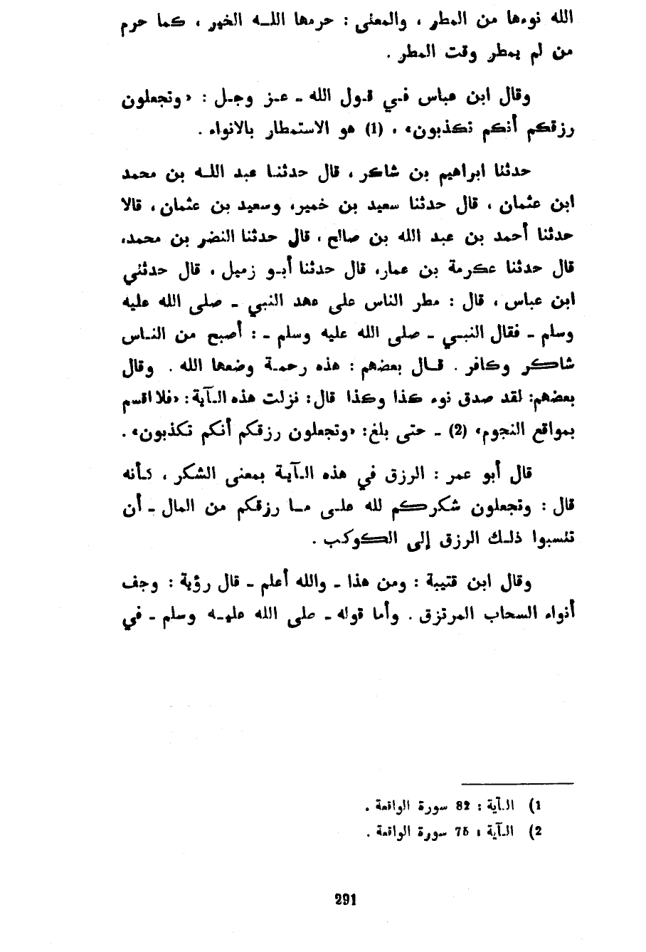 اللَّهُ نَوْءَهَا مِنَ الْمَطَرِ وَالْمَعْنَى حَرَمَهَا اللَّهُ الْخَيْرَ كَمَا حَرَمَ مَنْ لَمْ يُمْطَرْ وَقْتَ الْمَطَرِ وَقَالَ ابْنِ عَبَّاسٍ فِي قَوْلِ اللَّهِ عَزَّ وَجَلَّ وَتَجْعَلُونَ رِزْقَكُمْ أَنَّكُمْ تُكَذِّبُونَ هُوَ الِاسْتِمْطَارُ بِالْأَنْوَاءِ حَدَّثَنَا إِبْرَاهِيمُ بْنُ شَاكِرٍ قَالَ حَدَّثَنَا عَبْدُ اللَّهِ بْنُ مُحَمَّدِ بْنِ عُثْمَانَ قَالَ حَدَّثَنَا سَعِيدُ بْنُ خُمَيْرٍ وَسَعِيدُ بْنُ عُثْمَانَ قَالَا حَدَّثَنَا أَحْمَدُ بْنُ عَبْدِ اللَّهِ بْنِ صَالِحٍ قَالَ حَدَّثَنَا النَّضْرُ بْنُ مُحَمَّدٍ قَالَ حَدَّثَنَا عِكْرِمَةُ بْنُ عَمَّارٍ قَالَ حَدَّثَنَا أَبُو زُمَيْلٍ قَالَ حَدَّثَنِي ابْنُ عَبَّاسٍ قَالَ مُطِرَ النَّاسُ عَلَى عَهْدِ النَّبِيِّ صَلَّى اللَّهُ عَلَيْهِ وَسَلَّمَ فَقَالَ النَّبِيُّ صَلَّى اللَّهُ عَلَيْهِ وَسَلَّمَ أَصْبَحَ مِنَ النَّاسِ شَاكِرٌ وَكَافِرٌ قَالَ بَعْضُهُمْ هَذِهِ رَحْمَةٌ وَضَعَهَا اللَّهُ وَقَالَ بَعْضُهُمْ لَقَدْ صَدَقَ نَوْءُ كَذَا وَكَذَا قَالَ نَزَلَتْ هَذِهِ الْآيَةُ فَلَا أُقْسِمُ بِمَوَاقِعِ النُّجُومِ حَتَّى بَلَغَ وَتَجْعَلُونَ رِزْقَكُمْ أَنَّكُمْ تُكَذِّبُونَ قَالَ أَبُو عُمَرَ الرِّزْقُ فِي هَذِهِ الْآيَةِ بِمَعْنَى الشُّكْرِ كَأَنَّهُ قَالَ وَتَجْعَلُونَ شُكْرَكُمْ لِلَّهِ عَلَى مَا رَزَقَكُمْ مِنَ الْمَالِ أَنْ تَنْسِبُوا ذَلِكَ الرِّزْقَ إِلَى الْكَوْكَبِ وَقَالَ ابْنُ قُتَيْبَةَ وَمِنْ هَذَا والله اعلم قال رؤية وَجَفَّ أَنْوَاءُ السَّحَابِ الْمُرْتَزِقِ وَأَمَّا قَوْلُهُ صَلَّى اللَّهُ عَلَيْهِ وَسَلَّمَ فِي
