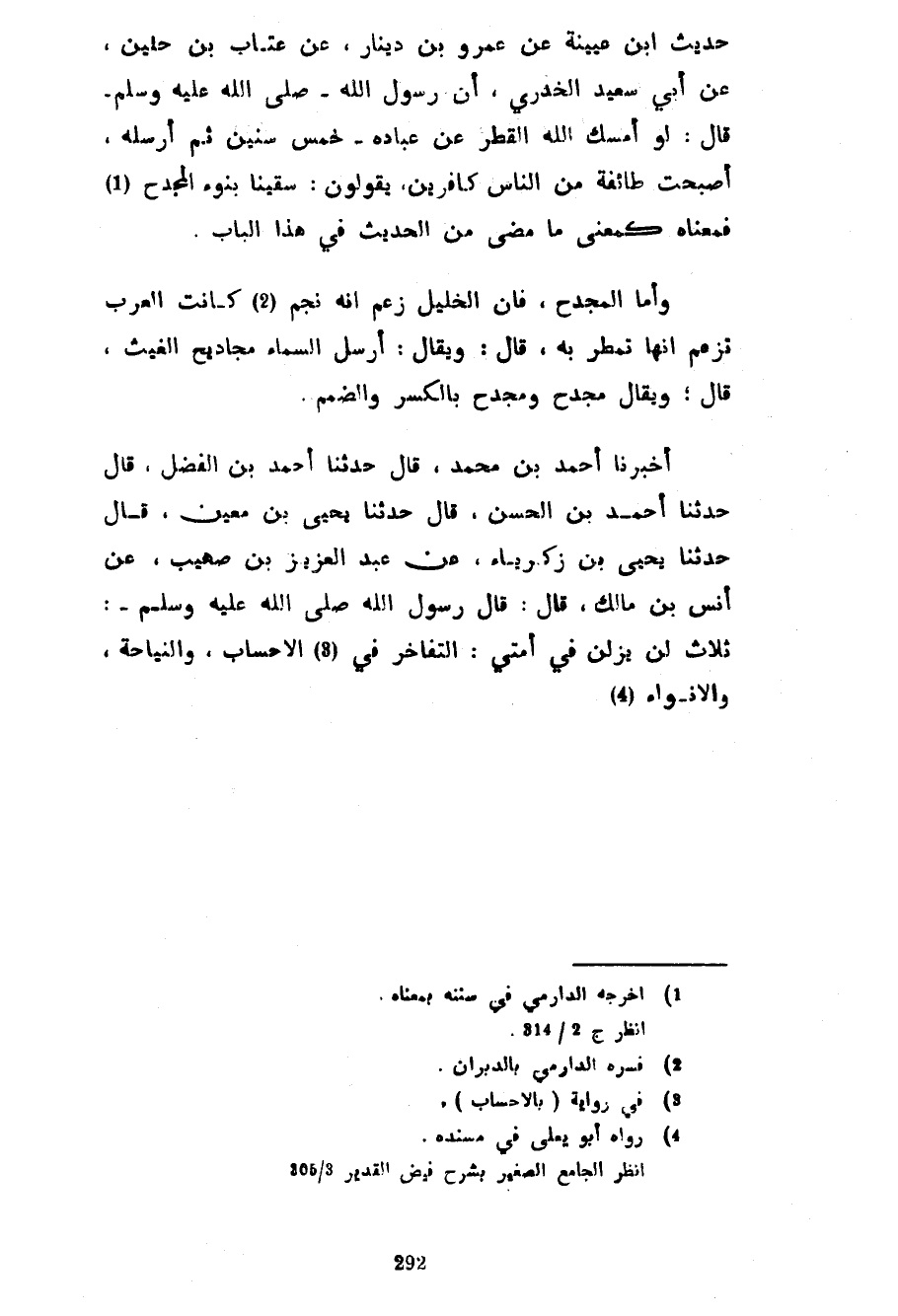 حَدِيثِ ابْنُ عُيَيْنَةَ عَنْ عَمْرِو بْنِ دِينَارٍ عَنْ عَتَّابِ بْنِ حُنَيْنٍ عَنْ أَبِي سَعِيدٍ الْخُدْرِيِّ أَنَّ رَسُولَ اللَّهِ صَلَّى اللَّهُ عَلَيْهِ وَسَلَّمَ قَالَ لَوْ أَمْسَكَ اللَّهُ الْقَطْرَ عَنْ عِبَادِهِ خَمْسَ سِنِينَ ثُمَّ أَرْسَلَهُ أَصْبَحَتْ طَائِفَةٌ مِنَ النَّاسِ كَافِرِينَ يَقُولُونَ سُقِينَا بِنَوْءِ الْمِجْدَحِ فَمَعْنَاهُ كَمَعْنَى مَا مَضَى مِنَ الْحَدِيثِ فِي هَذَا الْبَابِ وَأَمَّا الْمِجْدَحُ فَإِنَّ الْخَلِيلَ زَعَمَ أَنَّهُ نَجْمٌ كَانْتِ الْعَرَبُ تَزْعُمُ أَنَّهَا تُمْطَرُ بِهِ قَالَ وَيُقَالُ أَرْسَلَ السَّمَاءَ مَجَادِيحُ الْغَيْثِ قَالَ وَيُقَالُ مِجْدَحٌ وَمُجْدَحٌ بِالْكَسْرِ وَالضَّمِّ أَخْبَرَنَا أَحْمَدُ بْنُ مُحَمَّدٍ قَالَ حَدَّثَنَا أَحْمَدُ بْنُ الْفَضْلِ قَالَ حَدَّثَنَا أَحْمَدُ بْنُ الْحَسَنِ قَالَ حَدَّثَنَا يَحْيَى بْنُ مَعِينٍ قَالَ حَدَّثَنَا يَحْيَى بْنُ زَكَرِيَّاءَ عَنْ عَبْدِ الْعَزِيزِ بْنِ صُهَيْبٍ عَنْ أَنَسٍ بْنِ مَالِكٍ قَالَ قَالَ رَسُولُ اللَّهِ صَلَّى اللَّهُ عَلَيْهِ وَسَلَّمَ ثَلَاثٌ لَنْ يَزَلْنَ فِي أُمَّتِيَ التَّفَاخُرُ فِي الْأَحْسَابِ وَالنِّيَاحَةُ والأنواء