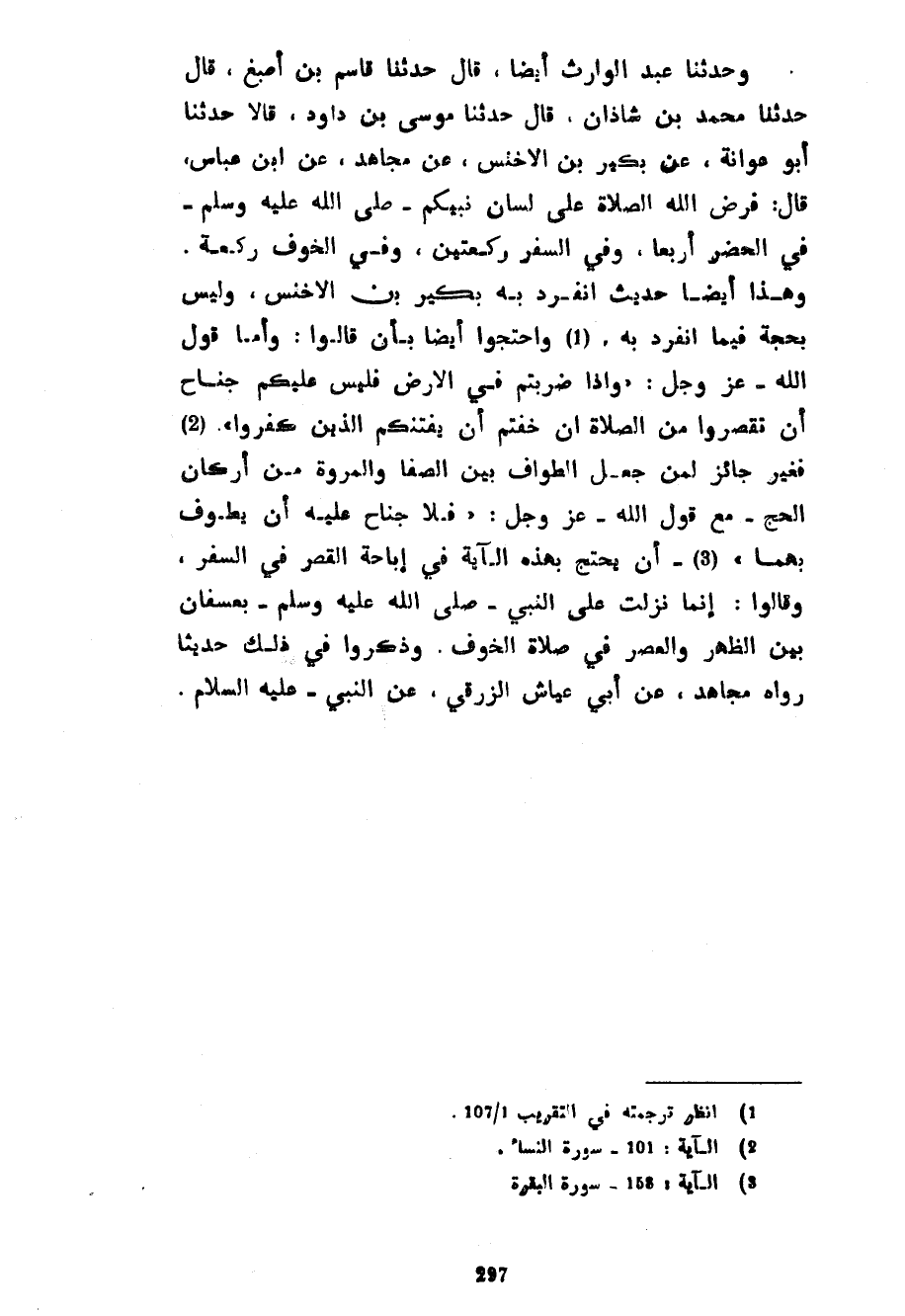 وَحَدَّثَنَا عَبْدُ الْوَارِثِ أَيْضًا قَالَ حَدَّثَنَا قَاسِمُ بْنُ أَصْبَغَ قَالَ حَدَّثَنَا مُحَمَّدُ بْنُ شَاذَانَ قَالَ حَدَّثَنَا مُوسَى بْنُ دَاوُدَ قَالَا حَدَّثَنَا أَبُو عَوَانَةَ عَنْ بُكَيْرِ بْنِ الْأَخْنَسِ عَنْ مُجَاهِدٍ عَنِ ابْنِ عَبَّاسٍ قَالَ فَرَضَ اللَّهُ الصَّلَاةَ عَلَى لِسَانِ نَبِيِّكُمْ صَلَّى اللَّهُ عَلَيْهِ وَسَلَّمَ فِي الْحَضَرِ أَرْبَعًا وَفِي السَّفَرِ رَكْعَتَيْنِ وَفِي الْخَوْفِ رَكْعَةً وَهَذَا أَيْضًا حَدِيثٌ انْفَرَدَ بِهِ بُكَيْرُ بْنُ الْأَخْنَسِ وَلَيْسَ بِحُجَّةٍ فِيمَا انْفَرَدَ بِهِ وَاحْتَجُّوا أَيْضًا بِأَنْ قَالُوا وَأَمَّا قَوْلُ اللَّهُ عَزَّ وَجَلَّ وَإِذَا ضَرَبْتُمْ فِي الْأَرْضِ فَلَيْسَ عَلَيْكُمْ جُنَاحٌ أَنْ تَقْصُرُوا مِنَ الصَّلَاةِ إِنْ خِفْتُمْ أَنْ يَفْتِنَكُمُ الَّذِينَ كَفَرُوا فَغَيْرُ جَائِزٍ لِمَنْ جَعَلَ الطَّوَافَ بَيْنَ الصَّفَا وَالْمَرْوَةِ مِنْ أَرْكَانِ الْحَجِّ مَعَ قَوْلِ اللَّهِ عَزَّ وَجَلَّ فَلَا جُنَاحَ عَلَيْهِ أَنْ يَطَّوَّفَ بِهِمَا أَنْ يَحْتَجَّ بِهَذِهِ الْآيَةِ فِي إِبَاحَةِ الْقَصْرِ فِي السَّفَرِ وَقَالُوا إِنَّمَا نَزَلَتْ عَلَى النَّبِيِّ صَلَّى اللَّهُ عَلَيْهِ وَسَلَّمَ بِعُسْفَانَ بَيْنَ الظُّهْرِ وَالْعَصْرِ فِي صَلَاةِ الْخَوْفِ وَذَكَرُوا فِي ذَلِكَ حَدِيثًا رَوَاهُ مُجَاهِدٌ عَنْ أَبِي عَيَّاشٍ الزُّرَقِيِّ عَنِ النَّبِيِّ عَلَيْهِ السَّلَامُ