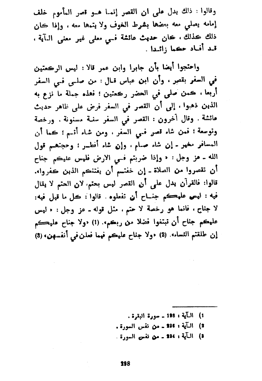 وَقَالُوا ذَلِكَ يَدُلُّ عَلَى أَنَّ الْقَصْرَ إِنَّمَا هُوَ قَصْرُ الْمَأْمُومِ خَلْفَ إِمَامِهِ يُصَلِّي مَعَهُ بعضها بشرط الخوف ولا يقوم مَعَهُ وَإِذَا كَانَ ذَلِكَ كَذَلِكَ كَانَ حَدِيثُ عَائِشَةَ فِي مَعْنًى غَيْرِ مَعْنَى الْآيَةِ قَدْ أَفَادَ حُكْمًا زَائِدًا وَاحْتَجُّوا أَيْضًا بِأَنْ جَابِرًا وَابْنَ عُمَرَ قَالَا لَيْسَ الرَّكْعَتَيْنِ فِي السَّفَرِ بِقَصْرٍ وَأَنَّ ابْنَ عَبَّاسٍ قَالَ مَنْ صَلَّى فِي السَّفَرِ أَرْبَعًا كَمَنْ صَلَّى فِي الْحَضَرِ رَكْعَتَيْنِ فَهَذِهِ جُمْلَةُ مَا نَزَعَ بِهِ الَّذِينَ ذَهَبُوا إِلَى أَنَّ الْقَصْرَ فِي السَّفَرِ فَرْضٌ عَلَى ظَاهِرِ حَدِيثِ عَائِشَةَ وَقَالَ آخَرُونَ الْقَصْرُ فِي السَّفَرِ سُنَّةٌ مَسْنُونَةٌ وَرُخْصَةٌ وَتَوْسِعَةٌ فَمَنْ شَاءَ قَصَرَ فِي السَّفَرِ وَمَنْ شَاءَ أَتَمَّ كَمَا أَنَّ الْمُسَافِرَ مُخَيَّرٌ إِنْ شَاءَ صَامَ وَإِنْ شَاءَ أَفْطَرَ وَحُجَّتُهُمْ قَوْلُ اللَّهُ عَزَّ وَجَلَّ وَإِذَا ضَرَبْتُمْ فِي الْأَرْضِ فَلَيْسَ عَلَيْكُمْ جُنَاحٌ أَنْ تَقْصُرُوا مِنَ الصَّلَاةِ إِنْ خِفْتُمْ أَنْ يَفْتِنَكُمُ الَّذِينَ كَفَرُوا قَالُوا فَالْقُرْآنُ يَدُلُّ عَلَى أَنَّ الْقَصْرَ لَيْسَ بِحَتْمٍ لِأَنَّ الْحَتْمَ لَا يُقَالُ فِيهِ لَيْسَ عَلَيْكُمْ جُنَاحٌ أَنْ تَفْعَلُوهُ قَالُوا كُلُّ مَا قِيلَ فِيهِ لَا جُنَاحَ فَإِنَّمَا هُوَ رُخْصَةٌ لَا حَتْمٌ مِثْلُ قَوْلِهِ عَزَّ وَجَلَّ لَيْسَ عَلَيْكُمْ جُنَاحٌ أَنْ تبتغوا فضلا من ربكم ولا جناح عليكم إن طلقتم النساء ولا جُنَاحَ عَلَيْكُمْ فِيمَا فَعَلْنَ فِي أَنْفُسِهِنَّ