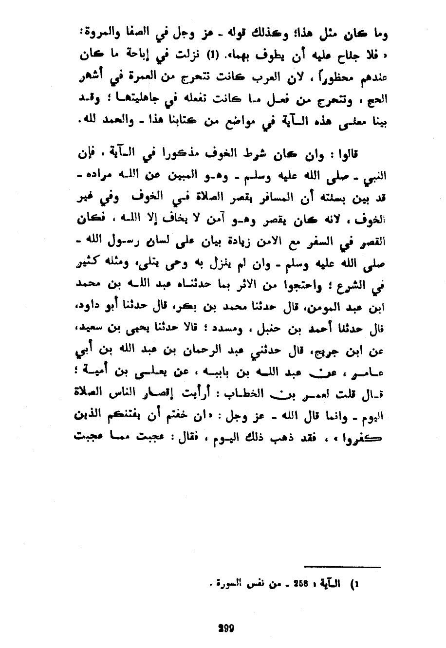 وَمَا كَانَ مِثْلَ هَذَا وَكَذَلِكَ قَوْلُهُ عَزَّ وَجَلَّ فِي الصَّفَا وَالْمَرْوَةِ فَلَا جُنَاحَ عَلَيْهِ أَنْ يَطَّوَّفَ بِهِمَا نَزَلَتْ فِي إِبَاحَةِ مَا كَانَ عِنْدَهُمْ مَحْظُورًا لِأَنَّ الْعَرَبَ كَانَتْ تَتَحَرَّجُ مِنَ الْعُمْرَةِ فِي أَشْهُرِ الْحَجِّ وَتَتَحَرَّجُ مِنْ فِعْلِ مَا كَانَتْ تَفْعَلُهُ فِي جَاهِلِيَّتِهَا وَقَدْ بَيَّنَّا مَعْنَى هَذِهِ الْآيَةِ فِي مَوَاضِعَ مِنْ كِتَابِنَا هَذَا وَالْحَمْدُ لِلَّهِ قَالُوا وَإِنْ كَانَ شَرْطُ الْخَوْفِ مَذْكُورًا فِي الْآيَةِ فَإِنَّ النَّبِيَّ صَلَّى اللَّهُ عَلَيْهِ وَسَلَّمَ وَهُوَ الْمُبَيِّنُ عَنِ اللَّهِ مُرَادَهُ قَدْ بَيَّنَ بِسُنَّتِهِ أَنَّ الْمُسَافِرَ يَقْصُرُ الصَّلَاةَ فِي الْخَوْفِ وَفِي غَيْرِ الْخَوْفِ لِأَنَّهُ كَانَ يَقْصُرُ وَهُوَ آمِنٌ لَا يَخَافُ إِلَّا اللَّهَ فَكَانَ الْقَصْرُ فِي السَّفَرِ مَعَ الْأَمْنِ زِيَادَةُ بَيَانٍ عَلَى لِسَانِ رَسُولِ اللَّهِ صَلَّى اللَّهُ عَلَيْهِ وَسَلَّمَ وَإِنْ لَمْ يَنْزِلْ بِهِ وَحْيٌ يُتْلَى وَمِثْلُهُ كَثِيرٌ فِي الشَّرْعِ وَاحْتَجُّوا مِنَ الْأَثَرِ بِمَا حَدَّثَنَاهُ عَبْدُ اللَّهِ بْنُ مُحَمَّدِ بْنِ عَبْدِ الْمُؤْمِنِ قَالَ حَدَّثَنَا مُحَمَّدُ بْنُ بَكْرٍ قَالَ حَدَّثَنَا أَبُو دَاوُدَ قَالَ حَدَّثَنَا أَحْمَدُ بْنُ حَنْبَلٍ وَمُسَدَّدٌ قَالَا حَدَّثَنَا يَحْيَى بْنُ سَعِيدٍ عَنِ ابْنِ جُرَيْجٍ قال حدثني عبد الرحمان بْنُ عَبْدِ اللَّهِ بْنِ أَبِي عَامِرٍ عَنْ عبد الله بن باببه عَنْ يَعْلَى بْنِ أُمَيَّةَ قَالَ قُلْتُ لِعُمَرَ بْنِ الْخَطَّابِ أَرَأَيْتَ إِقْصَارُ النَّاسِ الصَّلَاةَ الْيَوْمَ وَإِنَّمَا قَالَ اللَّهُ عَزَّ وَجَلَّ إِنْ خِفْتُمْ أَنْ يَفْتِنَكُمُ الَّذِينَ كَفَرُوا فَقَدْ ذَهَبَ ذَلِكَ الْيَوْمَ فَقَالَ عَجِبْتُ مِمَّا عَجِبْتَ