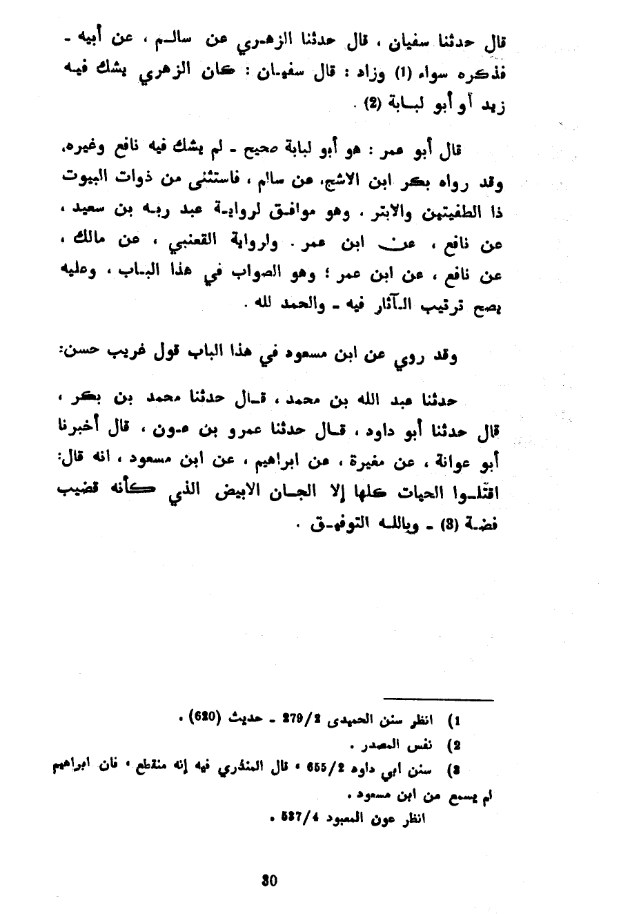 قَالَ حَدَّثَنَا سُفْيَانُ قَالَ حَدَّثَنَا الزُّهْرِيُّ عَنْ سَالِمٍ عَنْ أَبِيهِ فَذَكَرَهُ سَوَاءً وَزَادَ قَالَ سُفْيَانُ كَانَ الزُّهْرِيُّ يَشُكُّ فِيهِ زَيْدٌ أَوْ أَبُو لُبَابَةَ قَالَ أَبُو عُمَرَ هُوَ أَبُو لُبَابَةَ صَحِيحٌ لَمْ يَشُكَّ فِيهِ نَافِعٌ وَغَيْرُهُ وَقَدْ رَوَاهُ بَكْرُ بْنُ الْأَشَجِّ عَنْ سَالِمٍ فَاسْتَثْنَى مِنْ ذَوَاتِ الْبُيُوتِ ذَا الطُّفْيَتَيْنِ وَالْأَبْتَرَ وَهُوَ مُوَافِقٌ لِرِوَايَةِ عَبْدِ رَبِّهِ بْنِ سَعِيدٍ عَنْ نَافِعٍ عَنِ ابْنِ عُمَرَ وَلِرِوَايَةٍ الْقَعْنَبِيِّ عَنْ مَالِكٍ عَنْ نَافِعٍ عَنِ ابْنِ عُمَرَ وَهُوَ الصَّوَابُ فِي هَذَا الْبَابِ وَعَلَيْهِ يَصِحُّ تَرْتِيبُ الْآثَارِ فِيهِ وَالْحَمْدُ لِلَّهِ وَقَدْ رُوِيَ عَنِ ابْنِ مَسْعُودٍ فِي هَذَا الْبَابِ قَوْلٌ غَرِيبٌ حَسَنٌ حَدَّثَنَا عَبْدُ اللَّهِ بْنُ مُحَمَّدٍ قَالَ حَدَّثَنَا مُحَمَّدُ بْنُ بَكْرٍ قَالَ حَدَّثَنَا أَبُو دَاوُدَ قَالَ حَدَّثَنَا عَمْرُو بْنُ عَوْنٍ قَالَ أَخْبَرَنَا أَبُو عَوَانَةَ عَنْ مُغِيرَةَ عَنْ إِبْرَاهِيمَ عَنِ ابْنِ مَسْعُودٍ أَنَّهُ قَالَ اقْتُلُوا الْحَيَّاتِ كُلَّهَا إِلَّا الْجَانَّ الْأَبْيَضَ الَّذِي كَأَنَّهُ قَضِيبُ فِضَّةٍ وَبِاللَّهِ التَّوْفِيقُ