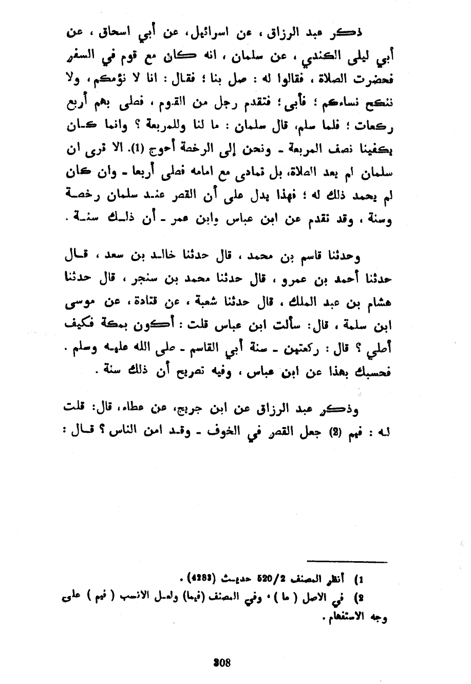 ذَكَرَ عَبْدُ الرَّزَّاقِ عَنِ اسْرَائِيلَ عَنْ أَبِي إِسْحَاقَ عَنْ أَبِي لَيْلَى الْكِنْدِيِّ عَنْ سَلْمَانَ أَنَّهُ كَانَ مَعَ قَوْمٍ فِي السَّفَرِ فَحَضَرَتِ الصَّلَاةُ فَقَالُوا لَهُ صَلِّ بِنَا فَقَالَ إِنَّا لَا نَؤُمُّكُمْ وَلَا نَنْكِحُ نِسَاءَكُمْ فَأَبَى فَتَقَدَّمَ رَجُلٌ مِنَ الْقَوْمِ فَصَلَّى بِهِمْ أَرْبَعَ رَكَعَاتٍ فَلَمَّا سَلَّمَ قَالَ سَلْمَانُ مَا لَنَا وَلِلْمُرَبَّعَةِ وَإِنَّمَا كَانَ يَكْفِينَا نِصْفُ الْمُرَبَّعَةِ وَنَحْنُ إِلَى الرُّخْصَةِ أَحْوَجُ أَلَا تَرَى أَنَّ سَلْمَانَ لَمْ يُعِدِ الصَّلَاةَ بَلْ تَمَادَى مَعَ إِمَامِهِ فَصَلَّى أَرْبَعًا وَإِنْ كَانَ لَمْ يَحْمَدْ ذَلِكَ لَهُ فَهَذَا يَدُلُّ عَلَى أَنَّ الْقَصْرَ عِنْدَ سَلْمَانَ رُخْصَةٌ وَسُنَّةٌ وَقَدْ تَقَدَّمَ عَنِ ابْنِ عَبَّاسٍ وَابْنِ عُمَرَ أَنَّ ذَلِكَ سُنَّةٌ وَحَدَّثَنَا قَاسِمُ بْنُ مُحَمَّدٍ قَالَ حَدَّثَنَا خَالِدُ بْنُ سَعْدٍ قَالَ حَدَّثَنَا أَحْمَدُ بْنُ عَمْرِو قَالَ حَدَّثَنَا مُحَمَّدُ بْنُ سَنْجَرٍ قَالَ حَدَّثَنَا هِشَامُ بْنُ عَبْدِ الْمَلِكِ قَالَ حَدَّثَنَا شُعْبَةُ عَنْ قَتَادَةَ عن موسى ابن سَلَمَةَ قَالَ سَأَلْتُ ابْنَ عَبَّاسٍ قُلْتُ أَكُونُ بِمَكَّةَ فَكَيْفَ أُصَلِّي قَالَ رَكْعَتَيْنِ سُنَّةَ أَبِي الْقَاسِمِ صَلَّى اللَّهُ عَلَيْهِ وَسَلَّمَ فَحَسْبُكَ بِهَذَا عَنِ ابْنِ عَبَّاسٍ وَفِيهِ تَصْرِيحٌ أَنَّ ذَلِكَ سُنَّةٌ وَذَكَرَ عَبْدُ الرَّزَّاقِ عَنِ ابْنِ جُرَيْجٍ عَنْ عَطَاءٍ قَالَ قُلْتُ لَهُ فِيمَ جُعِلَ الْقَصْرُ فِي الْخَوْفِ وَقَدْ أَمِنَ النَّاسُ قَالَ