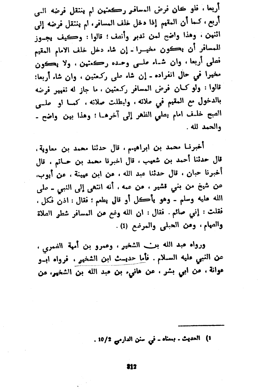أَرْبَعًا فَلَوْ كَانَ فَرْضُ الْمُسَافِرِ رَكْعَتَيْنِ لَمْ يَنْتَقِلْ فَرْضُهُ إِلَى أَرْبَعٍ كَمَا أَنَّ الْمُقِيمَ إِذَا دَخَلَ خَلْفَ الْمُسَافِرِ لَمْ يَنْتَقِلْ فَرْضُهُ إلى اثنين وَهَذَا وَاضِحٌ لِمَنْ تَدَبَّرَ وَأَنْصَفَ قَالُوا وَكَيْفَ يَجُوزُ لِلْمُسَافِرِ أَنْ يَكُونَ مُخَيَّرًا إِنْ شَاءَ دَخَلَ خَلْفَ الْإِمَامِ الْمُقِيمِ فَصَلَّى أَرْبَعًا وَإِنْ شَاءَ صَلَّى وَحْدَهُ رَكْعَتَيْنِ وَلَا يَكُونُ مُخَيَّرًا فِي حَالِ انْفِرَادِهِ إِنْ شَاءَ صَلَّى رَكْعَتَيْنِ وَإِنْ شَاءَ أَرْبَعًا قَالُوا وَلَوْ كَانَ فَرْضُ الْمُسَافِرِ رَكْعَتَيْنِ مَا جَازَ لَهُ تَغْيِيرُ فَرْضِهِ بِالدُّخُولِ مَعَ الْمُقِيمِ فِي صَلَاتِهِ وَلَبَطَلَتْ صَلَاتُهُ كَمَا لَوْ صَلَّى الصُّبْحَ خَلَفَ إِمَامٍ يُصَلِّى الظُّهْرَ إِلَى آخِرِهَا وَهَذَا بَيِّنٌ وَاضِحٌ وَالْحَمْدُ لِلَّهِ أَخْبَرَنَا مُحَمَّدُ بْنُ إِبْرَاهِيمَ قَالَ حَدَّثَنَا مُحَمَّدُ بْنُ مُعَاوِيَةَ قَالَ حَدَّثَنَا أَحْمَدُ بْنُ شُعَيْبٍ قَالَ أَخْبَرَنَا مُحَمَّدُ بْنُ حَاتِمٍ قَالَ أَخْبَرَنَا ابن حِبَّانُ قَالَ حَدَّثَنَا عَبْدُ اللَّهِ عَنِ ابْنِ عُيَيْنَةَ عَنْ أَيُّوبَ عَنْ شَيْخٍ مِنْ بَنِي قُشَيْرٍ عَنْ عَمِّهِ أَنَّهُ انْتَهَى إِلَى النَّبِيِّ صَلَّى اللَّهُ عَلَيْهِ وَسَلَّمَ وَهُوَ يَأْكُلُ أَوْ قال يطعم فقال إذن فَكُلْ فَقُلْتُ إِنِّي صَائِمٌ فَقَالَ إِنَّ اللَّهَ وَضَعَ عَنِ الْمُسَافِرِ شَطْرَ الصَّلَاةِ وَالصِّيَامَ وَعَنِ الْحُبْلَى وَالْمُرْضِعِ وَرَوَاهُ عَبْدُ اللَّهِ بْنُ الشِّخِّيرِ وَعَمْرُو بْنُ أُمَيَّةَ الضَّمْرِيُّ عَنِ النَّبِيِّ عَلَيْهِ السَّلَامُ فَأَمَّا حَدِيثُ ابْنِ الشِّخِّيرِ فَرَوَاهُ أَبُو عوانة عن أبي بشر عن هانىء بْنِ عَبْدِ اللَّهِ بْنِ الشِّخِّيرِ عَنْ