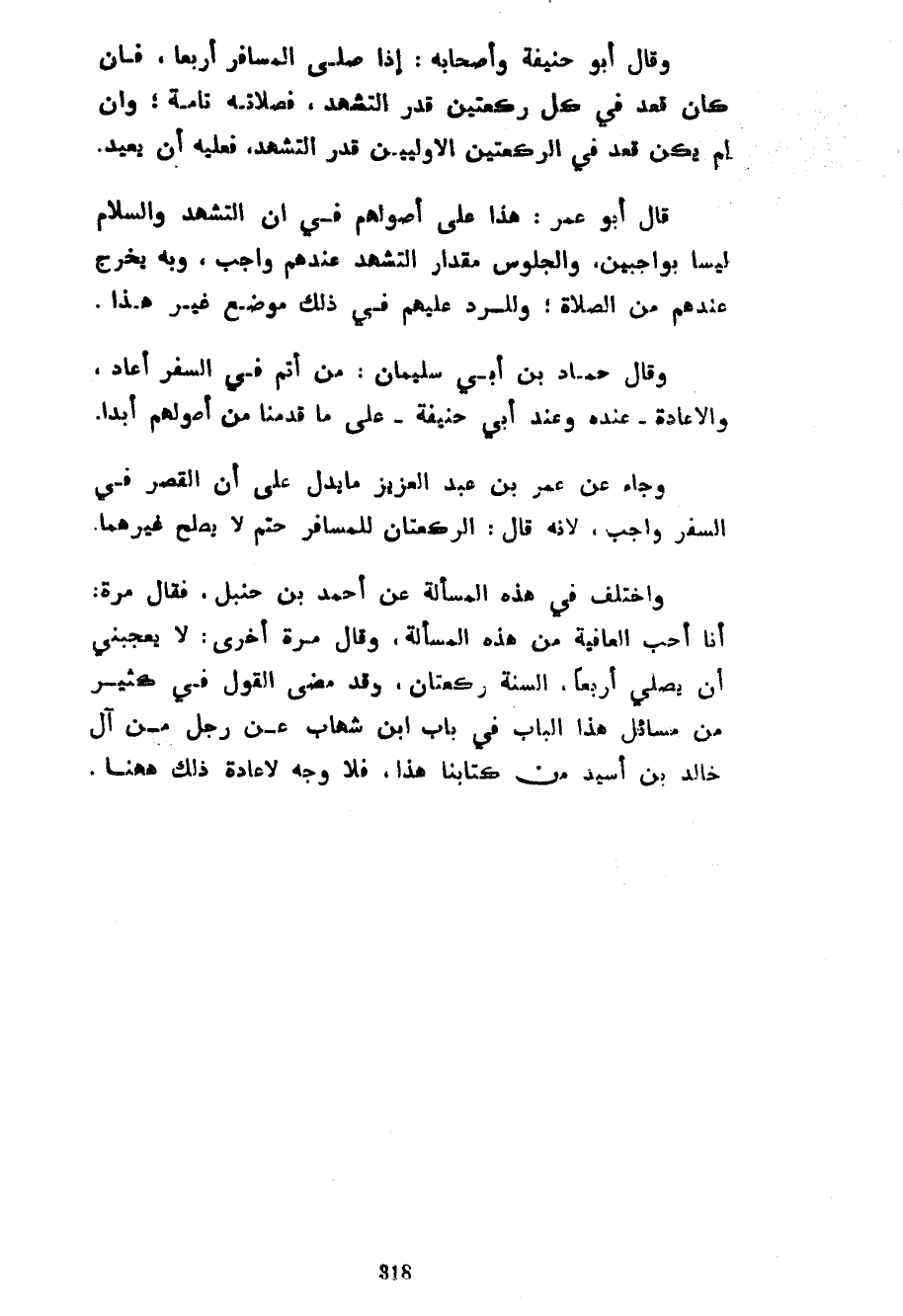 وَقَالَ أَبُو حَنِيفَةَ وَأَصْحَابُهُ إِذَا صَلَّى الْمُسَافِرُ أَرْبَعًا فَإِنْ كَانَ قَعَدَ فِي كُلِّ رَكْعَتَيْنِ قدر التشهد صلاته تامة وإن لم يكن فقعد في الرَّكْعَتَيْنِ الْأُولَيَيْنِ قَدْرَ التَّشَهُّدِ فَعَلَيْهِ أَنْ يُعِيدَ قَالَ أَبُو عُمَرَ هَذَا عَلَى أُصُولِهِمْ فِي أَنَّ التَّشَهُّدَ وَالسَّلَامَ لَيْسَا بِوَاجِبَيْنِ وَالْجُلُوسُ مِقْدَارَ التَّشَهُّدِ عِنْدَهُمْ وَاجِبٌ وَبِهِ يَخْرُجُ عِنْدَهُمْ مِنَ الصَّلَاةِ وَلِلرَّدِّ عَلَيْهِمْ فِي ذَلِكَ مَوْضِعٌ غَيْرُ هَذَا وَقَالَ حَمَّادُ بْنُ أَبِي سُلَيْمَانَ مَنْ أَتَمَّ فِي السَّفَرِ أَعَادَ وَالْإِعَادَةُ عِنْدَهُ وَعِنْدَ أَبِي حَنِيفَةَ عَلَى مَا قَدَّمْنَا مِنْ أُصُولِهِمْ أَبَدًا وَجَاءَ عَنْ عُمَرَ بْنِ عَبْدِ الْعَزِيزِ مَا يَدُلُّ عَلَى أَنَّ الْقَصْرَ فِي السَّفَرِ وَاجِبٌ لِأَنَّهُ قَالَ الرَّكْعَتَانِ لِلْمُسَافِرِ حَتْمٌ لَا يَصْلُحُ غَيْرُهُمَا وَاخْتُلِفَ فِي هَذِهِ الْمَسْأَلَةِ عَنْ أَحْمَدَ بْنِ حَنْبَلٍ فَقَالَ مَرَّةً أَنَا أُحِبُّ الْعَافِيَةَ مِنْ هَذِهِ الْمَسْأَلَةِ وَقَالَ مَرَّةً أُخْرَى لَا يُعْجِبُنِي أَنْ يُصَلِّيَ أَرْبَعًا السُّنَّةُ رَكْعَتَانِ وَقَدْ مَضَى الْقَوْلُ فِي كَثِيرٍ مِنْ مَسَائِلِ هَذَا الْبَابِ فِي بَابِ ابْنِ شِهَابٍ عَنْ رَجُلٍ مِنْ آلِ خَالِدِ بْنِ أَسِيدٍ مِنْ كِتَابِنَا هَذَا فَلَا وَجْهَ لِإِعَادَةِ ذَلِكَ ههنا