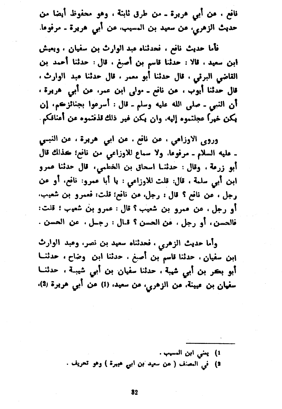 نَافِعٍ عَنْ أَبِي هُرَيْرَةَ مِنْ طُرُقٍ ثَابِتَةٍ وَهُوَ مَحْفُوظٌ أَيْضًا مِنْ حَدِيثِ الزُّهْرِيِّ عَنْ سَعِيدِ بْنِ الْمُسَيَّبِ عَنْ أَبِي هُرَيْرَةَ مَرْفُوعًا فَأَمَّا حَدِيثُ نَافِعٍ فَحَدَّثَنَاهُ عَبْدُ الْوَارِثِ بْنُ سُفْيَانَ وَيَعِيشُ بْنُ سَعِيدٍ قَالَا حَدَّثَنَا قَاسِمُ بْنُ أَصْبَغَ قَالَ حَدَّثَنَا أَحْمَدُ بْنُ الْقَاضِي الْبِرْتِيُّ قَالَ حَدَّثَنَا أَبُو مَعْمَرٍ قَالَ حَدَّثَنَا عَبْدُ الْوَارِثِ قَالَ حَدَّثَنَا أَيُّوبُ عَنْ نَافِعٍ مَوْلَى ابْنِ عُمَرَ عَنْ أَبِي هُرَيْرَةَ أَنَّ النَّبِيَّ صَلَّى اللَّهُ عليه وسلم قال أسرعوا بِجَنَائِزِكُمْ إِنْ يَكُنْ خَيْرًا عَجَّلْتُمُوهُ إِلَيْهِ وَإِنْ يَكُنْ غَيْرَ ذَلِكَ قَذَفْتُمُوهُ عَنْ أَعْنَاقِكُمْ وَرَوَى الْأَوْزَاعِيُّ عَنْ نَافِعٍ عَنْ أَبِي هُرَيْرَةَ عَنِ النَّبِيِّ عَلَيْهِ السَّلَامُ مَرْفُوعًا وَلَا سَمَاعَ لِلْأَوْزَاعِيِّ مِنْ نَافِعٍ كَذَلِكَ قَالَ أَبُو زُرْعَةَ وَقَالَ حَدَّثَنَا إِسْحَاقُ بْنُ الْخَطْمِيِّ قَالَ حَدَّثَنَا عَمْرُو بْنُ أَبِي سَلَمَةَ قَالَ قُلْتُ لِلْأَوْزَاعِيِّ يَا أَبَا عَمْرٍو نَافِعٌ أَوْ عَنْ رَجُلٍ عَنْ نَافِعٍ قَالَ رَجُلٌ عَنْ نَافِعٍ قُلْتُ فَعَمْرُو بْنُ شُعَيْبٍ أَوْ رَجُلٌ عَنْ عَمْرِو بْنِ شُعَيْبٍ قَالَ عَمْرُو بْنُ شُعَيْبٍ قُلْتُ فَالْحَسَنُ أَوْ رَجُلٌ عَنِ الْحَسَنِ قَالَ رَجُلٌ عَنِ الْحَسَنِ وَأَمَّا حَدِيثُ الزُّهْرِيِّ فَحَدَّثَنَاهُ سَعِيدُ بْنُ نَصْرٍ وَعَبْدُ الْوَارِثِ بْنُ سُفْيَانَ حَدَّثَنَا قَاسِمُ بْنُ أَصْبَغَ حَدَّثَنَا ابْنُ وَضَّاحٍ حَدَّثَنَا أَبُو بَكْرِ بْنُ أَبِي شَيْبَةَ حَدَّثَنَا سُفْيَانُ بْنُ أَبِي شَيْبَةَ حَدَّثَنَا سُفْيَانُ بْنُ عُيَيْنَةَ عَنِ الزُّهْرِيِّ عَنْ سَعِيدٍ عَنْ أَبِي هُرَيْرَةَ