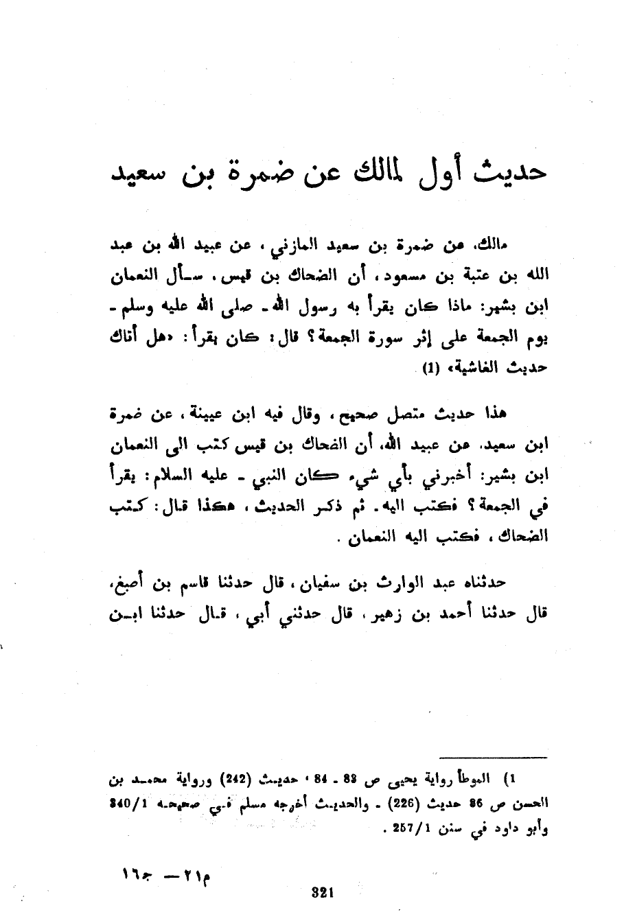 حَدِيثٌ أَوَّلٌ لِمَالِكٍ عَنْ ضَمْرَةَ بْنِ سَعِيدٍ مَالِكٌ عَنْ ضَمْرَةَ بْنِ سَعِيدٍ الْمَازِنِيِّ عَنْ عُبَيْدِ اللَّهِ بْنِ عَبْدِ اللَّهِ بْنِ عُتْبَةَ بْنِ مَسْعُودٍ أَنَّ الضَّحَّاكَ بْنَ قَيْسٍ سَأَلَ النعمان ابن بَشِيرٍ مَاذَا كَانَ يَقْرَأُ بِهِ رَسُولُ اللَّهِ صَلَّى اللَّهُ عَلَيْهِ وَسَلَّمَ يَوْمَ الْجُمُعَةِ عَلَى إِثْرِ سُورَةِ الْجُمُعَةِ قَالَ كَانَ يَقْرَأُ هَلْ أَتَاكَ حَدِيثُ الْغَاشِيَةِ هَذَا حَدِيثٌ مُتَّصِلٌ صَحِيحٌ وقال فيه ابن عيينة عن ضمرة ابن سَعِيدٍ عَنْ عُبَيْدِ اللَّهِ أَنَّ الضَّحَّاكَ بْنَ قيس كتب الى النعمان ابن بَشِيرٍ أَخْبِرْنِي بِأَيِّ شَيْءٍ كَانَ النَّبِيُّ عَلَيْهِ السَّلَامُ يَقْرَأُ فِي الْجُمُعَةِ فَكَتَبَ إِلَيْهِ ثُمَّ ذَكَرَ الْحَدِيثَ هَكَذَا قَالَ كَتَبَ الضَّحَّاكُ فَكَتَبَ إِلَيْهِ النُّعْمَانُ حَدَّثَنَاهُ عَبْدُ الْوَارِثِ بْنُ سُفْيَانَ قَالَ حَدَّثَنَا قَاسِمُ بْنُ أَصْبَغَ قَالَ حَدَّثَنَا أَحْمَدُ بْنُ زُهَيْرٍ قَالَ حَدَّثَنِي أَبِي قَالَ حدثنا ابن