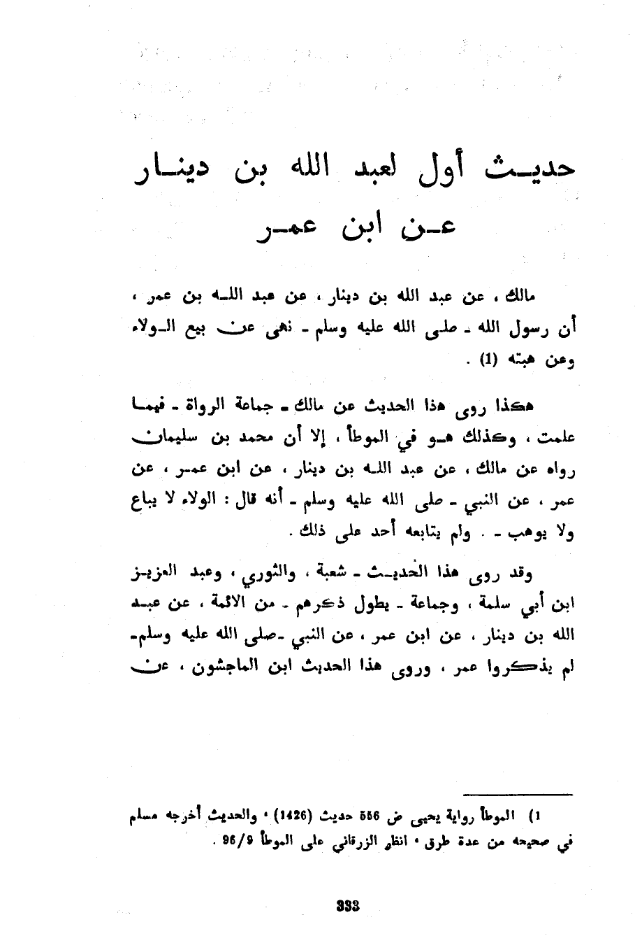 حَدِيثٌ أَوَّلٌ لِعَبْدِ اللَّهِ بْنِ دِينَارٍ عَنِ ابْنِ عُمَرَ مَالِكٌ عَنْ عَبْدِ اللَّهِ بْنِ دِينَارٍ عَنْ عَبْدِ اللَّهِ بْنِ عُمَرَ أَنَّ رَسُولَ اللَّهِ صَلَّى اللَّهُ عَلَيْهِ وَسَلَّمَ نَهَى عَنْ بَيْعِ الْوَلَاءِ وَعَنْ هِبَتِهِ هَكَذَا رَوَى هَذَا الْحَدِيثَ عَنْ مَالِكٍ جَمَاعَةُ الرُّوَاةِ فِيمَا عَلِمْتُ وَكَذَلِكَ هُوَ فِي الْمُوَطَّأِ إِلَّا أَنَّ مُحَمَّدَ بْنَ سُلَيْمَانَ رَوَاهُ عَنْ مَالِكٍ عَنْ عَبْدِ اللَّهِ بْنِ دِينَارٍ عَنِ ابْنِ عُمَرَ عَنْ عُمَرَ عَنِ النَّبِيِّ صَلَّى اللَّهُ عَلَيْهِ وَسَلَّمَ أَنَّهُ قَالَ الْوَلَاءُ لَا يُبَاعُ وَلَا يُوهَبُ وَلَمْ يُتَابِعْهُ أَحَدٌ عَلَى ذَلِكَ وَقَدْ رَوَى هَذَا الْحَدِيثَ شُعْبَةُ وَالثَّوْرِيُّ وَعَبْدُ الْعَزِيزِ ابن أَبِي سَلَمَةَ وَجَمَاعَةٌ يَطُولُ ذِكْرُهُمْ مِنَ الْأَئِمَّةِ عَنْ عَبْدِ اللَّهِ بْنِ دِينَارٍ عَنِ ابْنِ عُمَرَ عَنِ النَّبِيِّ صَلَّى اللَّهُ عَلَيْهِ وَسَلَّمَ لَمْ يَذْكُرُوا عُمَرَ وَرَوَى هَذَا الْحَدِيثَ ابْنُ الماجشون عن