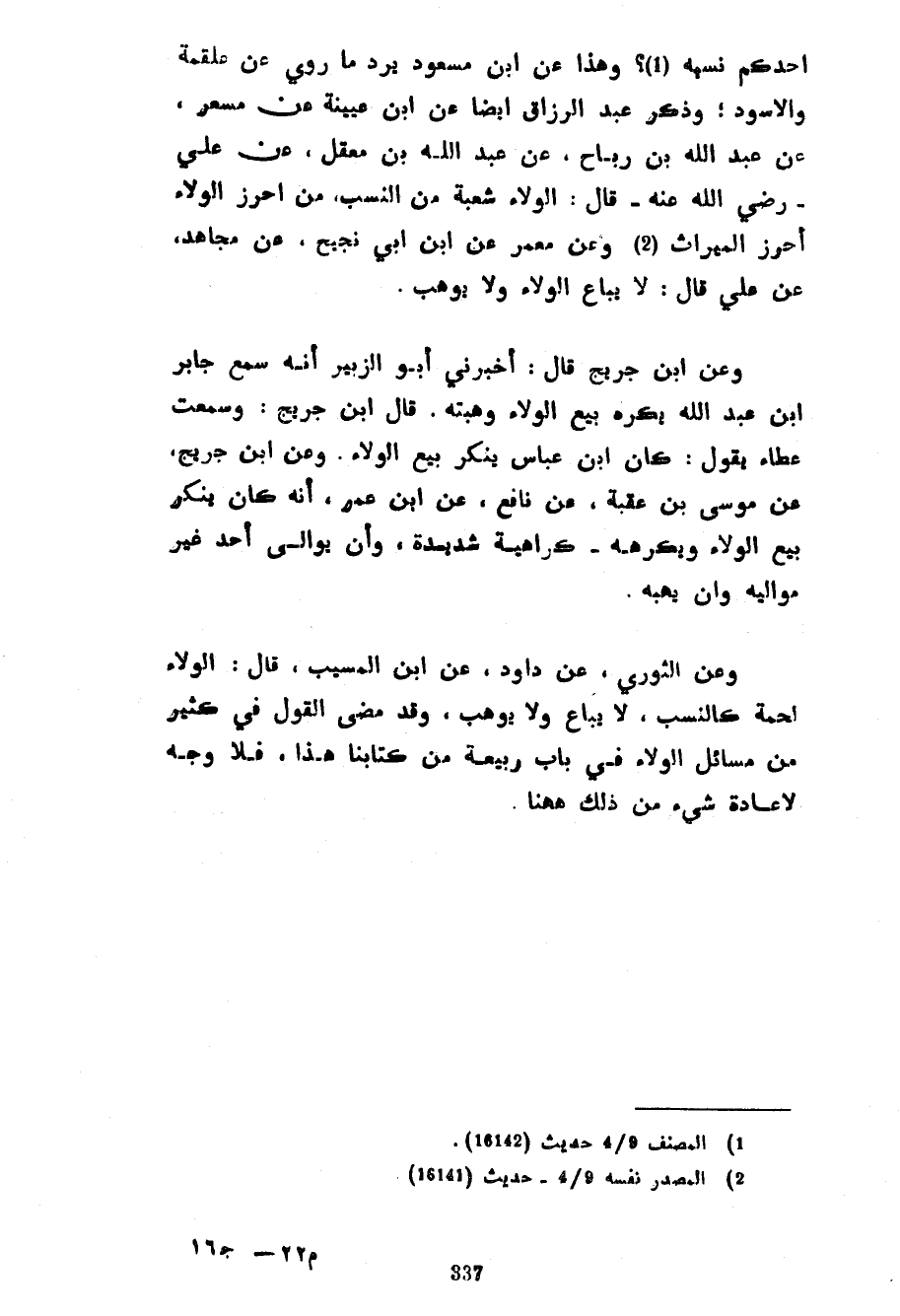 أَحَدُكُمْ نَسَبَهُ وَهَذَا عَنِ ابْنِ مَسْعُودٍ يَرُدُّ مَا رُوِيَ عَنْ عَلْقَمَةَ وَالْأَسْوَدِ وَذَكَرَ عَبْدُ الرَّزَّاقِ أَيْضًا عَنِ ابْنِ عُيَيْنَةَ عَنْ مِسْعَرٍ عَنْ عَبْدِ اللَّهِ بْنِ رَبَاحٍ عَنْ عَبْدِ اللَّهِ بْنِ مَعْقِلٍ عَنْ عَلِيٍّ رَضِيَ اللَّهُ عَنْهُ قَالَ الْوَلَاءُ شُعْبَةٌ مِنَ النَّسَبِ مَنْ أَحْرَزَ الْوَلَاءَ أَحْرَزَ الْمِيرَاثَ وَعَنْ مَعْمَرٌ عَنِ ابْنِ أَبِي نَجِيحٍ عَنْ مُجَاهِدٍ عَنِ عَلِيٍّ قَالَ لَا يُبَاعُ الْوَلَاءُ وَلَا يُوهَبُ وَعَنِ ابْنِ جُرَيْجٍ قَالَ أَخْبَرَنِي أَبُو الزُّبَيْرِ أَنَّهُ سمع جابر ابن عَبْدِ اللَّهِ يَكْرَهُ بَيْعَ الْوَلَاءِ وَهِبَتَهُ قَالَ ابْنُ جُرَيْجٍ وَسَمِعْتُ عَطَاءً يَقُولُ كَانَ ابْنُ عَبَّاسٍ يُنْكِرُ بَيْعَ الْوَلَاءِ وَعَنِ ابْنُ جُرَيْجٍ عَنْ مُوسَى بْنِ عُقْبَةَ عَنْ نَافِعٍ عَنِ ابْنِ عُمَرَ أَنَّهُ كَانَ يُنْكِرُ بَيْعَ الْوَلَاءِ وَيَكْرَهُهُ كَرَاهِيَةً شَدِيدَةً وَأَنْ يُوَالِيَ أَحَدٌ غَيْرَ مَوَالِيهِ وَأَنْ يَهَبَهُ وَعَنْ الثَّوْرِيِّ عَنْ دَاوُدَ عَنِ ابْنِ الْمُسَيَّبِ قَالَ الْوَلَاءُ لُحْمَةٌ كَالنَّسَبِ لَا يُبَاعُ وَلَا يُوهَبُ وَقَدْ مَضَى الْقَوْلُ فِي كَثِيرٍ مِنْ مَسَائِلِ الْوَلَاءِ فِي بَابِ رَبِيعَةَ مِنْ كِتَابِنَا هَذَا فَلَا وَجْهَ لِإِعَادَةِ شيء من ذلك ههنا