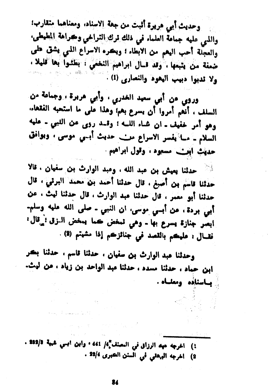 وَحَدِيثُ أَبِي هُرَيْرَةَ أَثْبَتُ مِنْ جِهَةِ الْإِسْنَادِ وَمَعْنَاهُمَا مُتَقَارِبٌ وَالَّذِي عَلَيْهِ جَمَاعَةُ الْعُلَمَاءِ فِي ذَلِكَ تَرْكُ التَّرَاخِي وَكَرَاهَةُ الْمُطَيْطَى وَالْعَجَلَةُ أَحَبُّ إِلَيْهِمْ مِنَ الْإِبْطَاءِ وَيُكْرَهُ الْإِسْرَاعُ الَّذِي يَشُقُّ عَلَى ضَعَفَةِ مَنْ يَتْبَعُهَا وَقَدْ قَالَ إِبْرَاهِيمُ النَّخَعِيُّ بَطِّئُوا بِهَا قَلِيلًا وَلَا تَدُبُّوا دَبِيبَ الْيَهُودِ وَالنَّصَارَى وَرُوِيَ عَنْ أَبِي سَعِيدٍ الْخُدْرِيِّ وَأَبِي هُرَيْرَةَ وَجَمَاعَةٍ مِنَ السَّلَفِ أَنَّهُمْ أَمَرُوا أَنْ يُسْرِعَ بِهِمْ وَهَذَا عَلَى مَا اسْتَحَبَّهُ الْفُقَهَاءُ وَهُوَ أَمْرٌ خَفِيفٌ إِنْ شَاءَ اللَّهُ وَقَدْ رُوِيَ عَنِ النَّبِيِّ عَلَيْهِ السَّلَامُ مَا يُفَسِّرُ الْإِسْرَاعَ مِنْ حَدِيثِ أَبِي مُوسَى وَيُوَافِقُ حَدِيثَ ابْنِ مَسْعُودٍ وَقَوْلَ إِبْرَاهِيمَ حَدَّثَنَا يَعِيشُ بْنُ عَبْدِ اللَّهِ وَعَبْدُ الْوَارِثِ بْنُ سُفْيَانَ قَالَا حَدَّثَنَا قَاسِمُ بْنُ أَصْبَغَ قَالَ حَدَّثَنَا أَحْمَدُ بْنُ مُحَمَّدٍ الْبِرْتِيُّ قَالَ حَدَّثَنَا أَبُو مَعْمَرٍ قَالَ حَدَّثَنَا عَبْدُ الْوَارِثِ قَالَ حَدَّثَنَا لَيْثٌ عَنْ أَبِي بُرْدَةَ عَنْ أَبِي مُوسَى أَنَّ النَّبِيَّ صَلَّى اللَّهُ عَلَيْهِ وَسَلَّمَ أَبْصَرَ جِنَازَةً يُسْرَعُ بِهَا وَهِيَ تَمْخُضُ كَمَا يَمْخُضُ الزِّقِّ قَالَ فَقَالَ عَلَيْكُمْ بِالْقَصْدِ فِي جَنَائِزِكُمْ إِذَا مَشَيْتُمْ وَحَدَّثَنَا عَبْدُ الْوَارِثِ بْنُ سُفْيَانَ حَدَّثَنَا قَاسِمُ حَدَّثَنَا بَكْرُ بْنُ حَمَّادٍ حَدَّثَنَا مُسَدَّدٌ حَدَّثَنَا عَبْدُ الْوَاحِدِ بْنُ زِيَادٍ عَنْ لَيْثٍ بِإِسْنَادِهِ وَمَعْنَاهُ