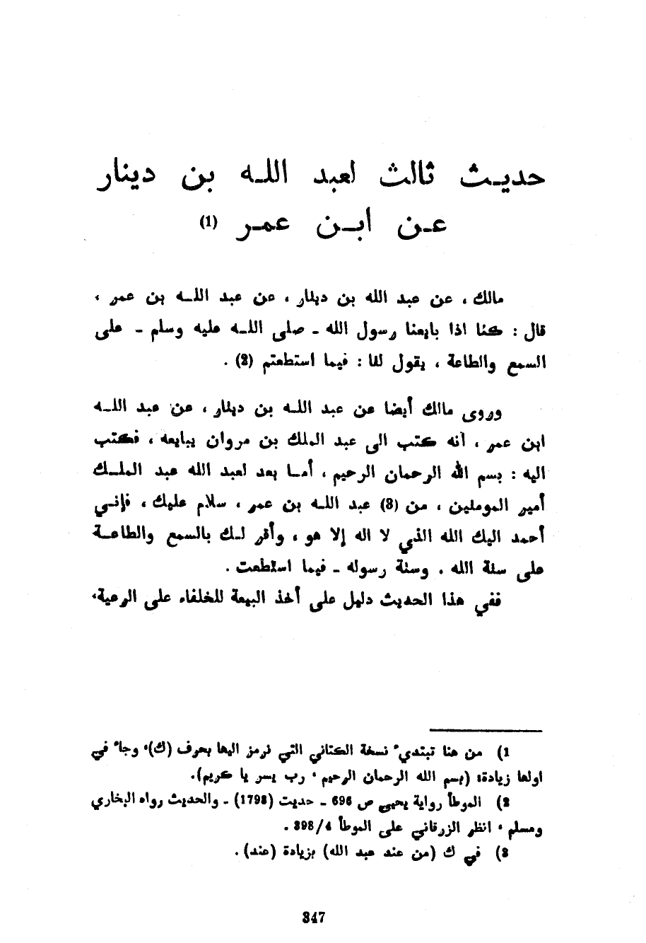 حَدِيثٌ ثَالِثٌ لِعَبْدِ اللَّهِ بْنِ دِينَارٍ عَنِ ابْنِ عُمَرَ مَالِكٌ عَنْ عَبْدِ اللَّهِ بْنِ دِينَارٍ عَنْ عَبْدِ اللَّهِ بْنِ عُمَرَ قَالَ كُنَّا إِذَا بَايَعْنَا رَسُولَ اللَّهِ صَلَّى اللَّهُ عَلَيْهِ وَسَلَّمَ عَلَى السَّمْعِ وَالطَّاعَةِ يَقُولُ لَنَا فِيمَا اسْتَطَعْتُمْ وَرَوَى مَالِكٌ أَيْضًا عَنْ عَبْدِ اللَّهِ بْنِ دِينَارٍ عَنْ عَبْدِ اللَّهِ بْنِ عُمَرَ أَنَّهُ كَتَبَ إِلَى عَبْدِ الْمَلِكِ بْنِ مروان يبايعه فكتب إليه بسم الله الرحمان الرَّحِيمِ أَمَّا بَعْدُ لِعَبْدِ اللَّهِ عَبْدِ الْمَلِكِ أَمِيرِ الْمُؤْمِنِينَ مِنْ عَبْدِ اللَّهِ بْنِ عُمَرَ سَلَامٌ عَلَيْكَ فَإِنِّي أَحْمَدُ إِلَيْكَ اللَّهَ الَّذِي لَا إِلَهَ إِلَّا هُوَ وَأُقِرُّ لَكَ بِالسَّمْعِ وَالطَّاعَةِ عَلَى سُنَّةِ اللَّهِ وَسُنَّةِ رَسُولِهِ فِيمَا اسْتَطَعْتُ فَفِي هَذَا الْحَدِيثِ دَلِيلٌ عَلَى أَخْذِ الْبَيْعَةِ لِلْخُلَفَاءِ عَلَى الرَّعِيَّةِ
