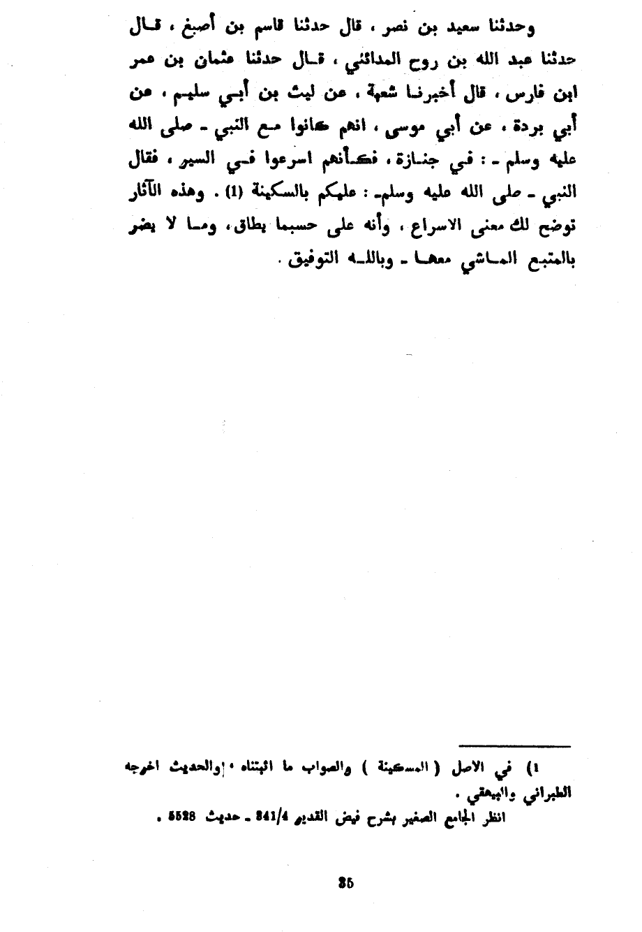وَحَدَّثَنَا سَعِيدُ بْنُ نَصْرٍ قَالَ حَدَّثَنَا قَاسِمُ بْنُ أَصْبَغَ قَالَ حَدَّثَنَا عَبْدُ اللَّهِ بْنُ رَوْحٍ الْمَدَائِنِيُّ قَالَ حَدَّثَنَا عُثْمَانُ بْنُ عُمَرَ بْنِ فَارِسٍ قَالَ أَخْبَرَنَا شُعْبَةُ عَنْ لَيْثِ بْنِ أَبِي سُلَيْمٍ عَنْ أَبِي بُرْدَةَ عَنْ أَبِي مُوسَى أَنَّهُمْ كَانُوا مَعَ النَّبِيِّ صَلَّى اللَّهُ عَلَيْهِ وَسَلَّمَ فِي جِنَازَةٍ فَكَأَنَّهُمْ أَسْرَعُوا فِي السَّيْرِ فَقَالَ النَّبِيُّ صَلَّى اللَّهُ عَلَيْهِ وَسَلَّمَ عَلَيْكُمْ بِالسَّكِينَةِ وَهَذِهِ الْآثَارُ تُوَضِّحُ لَكَ معنى الإسراع وأنه على حسبما يُطَاقُ وَمَا لَا يَضُرُّ بِالْمُتَّبِعِ الْمَاشِي مَعَهَا وبالله التوفيق