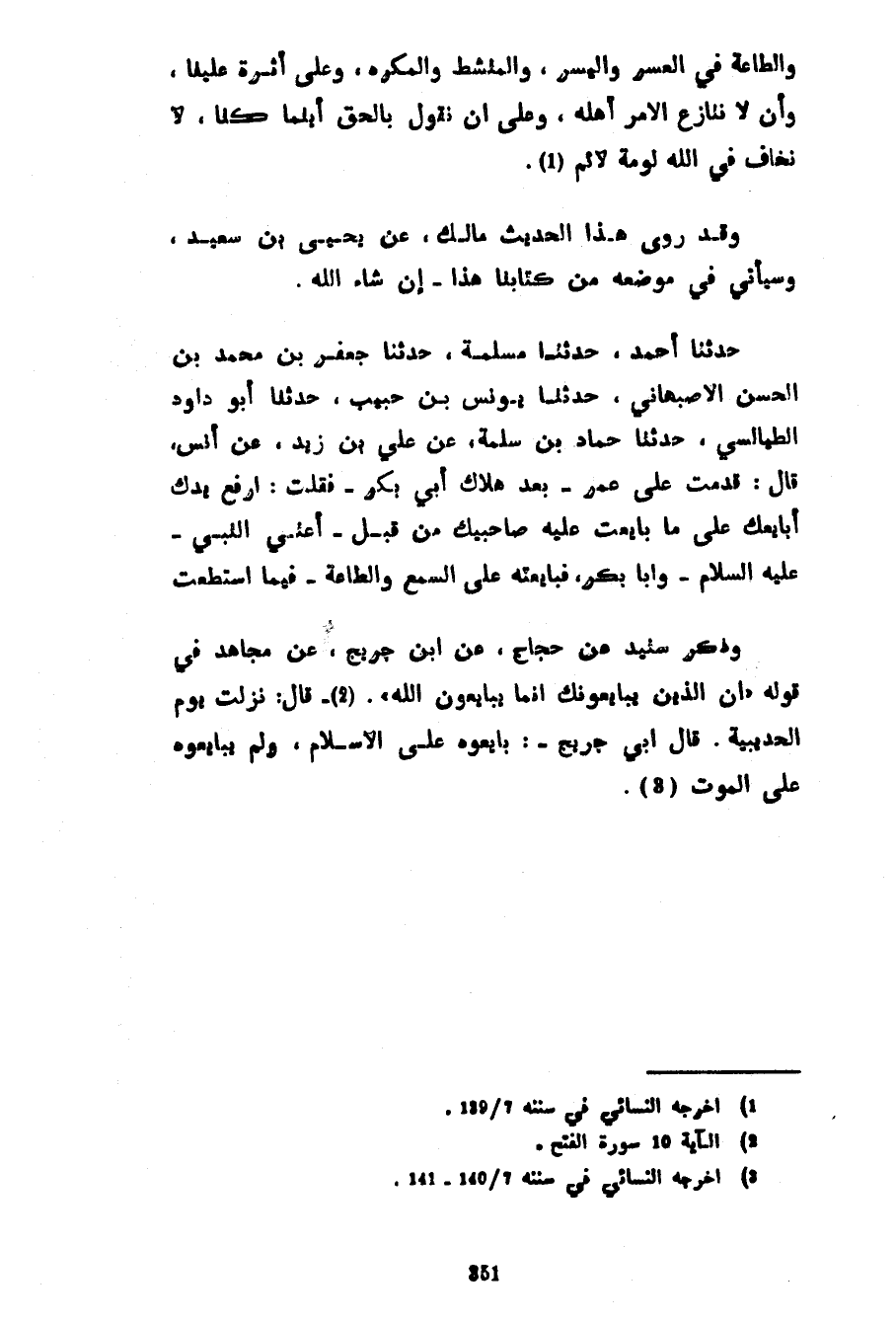 وَالطَّاعَةِ فِي الْعُسْرِ وَالْيُسْرِ وَالْمَنْشَطِ وَالْمَكْرَهِ وَعَلَى أَثَرَةٍ عَلَيْنَا وَأَنْ لَا نُنَازِعَ الْأَمْرَ أَهْلَهُ وَعَلَى أَنْ نَقُولَ بِالْحَقِّ أَيْنَمَا كُنَّا لَا نَخَافُ فِي اللَّهِ لَوْمَةَ لَائِمٍ وَقَدْ رَوَى هَذَا الْحَدِيثَ مَالِكٌ عَنْ يَحْيَى بْنِ سَعِيدٍ وَسَيَأْتِي فِي مَوْضِعِهِ مِنْ كِتَابِنَا هَذَا إِنْ شَاءَ اللَّهُ حَدَّثَنَا أَحْمَدُ حَدَّثَنَا مَسْلَمَةُ حَدَّثَنَا جَعْفَرُ بْنُ مُحَمَّدِ بْنِ الْحَسَنِ الْأَصْبَهَانِيُّ حَدَّثَنَا يُونُسُ بْنُ حَبِيبٍ حَدَّثَنَا أَبُو دَاوُدَ الطَّيَالِسِيُّ حَدَّثَنَا حَمَّادُ بْنُ سَلَمَةَ عَنْ عَلِيِّ بْنِ زَيْدٍ عَنْ أَنَسٍ قَالَ قَدِمْتُ عَلَى عُمَرَ بَعْدَ هَلَاكِ أَبِي بَكْرٍ فَقُلْتُ ارْفَعْ يَدَكَ أُبَايِعْكَ عَلَى مَا بَايَعْتُ عَلَيْهِ صَاحِبَيْكَ مِنْ قَبْلُ أَعْنِي النَّبِيَّ عَلَيْهِ السَّلَامُ وَأَبَا بَكْرٍ فَبَايَعْتُهُ عَلَى السَّمْعِ وَالطَّاعَةِ فِيمَا اسْتَطَعْتُ وَذَكَرَ سُنَيْدٍ عَنْ حَجَّاجٍ عَنِ ابْنِ جُرَيْجٍ عَنْ مُجَاهِدٍ فِي قَوْلِهِ إِنَّ الَّذِينَ يُبَايِعُونَكَ إِنَّمَا يُبَايِعُونَ اللَّهَ قَالَ نَزَلَتْ يَوْمَ الْحُدَيْبِيَةِ قَالَ أَبِي جُرَيْجٌ بَايَعُوهُ عَلَى الْإِسْلَامِ وَلَمْ يُبَايِعُوهُ على الموت