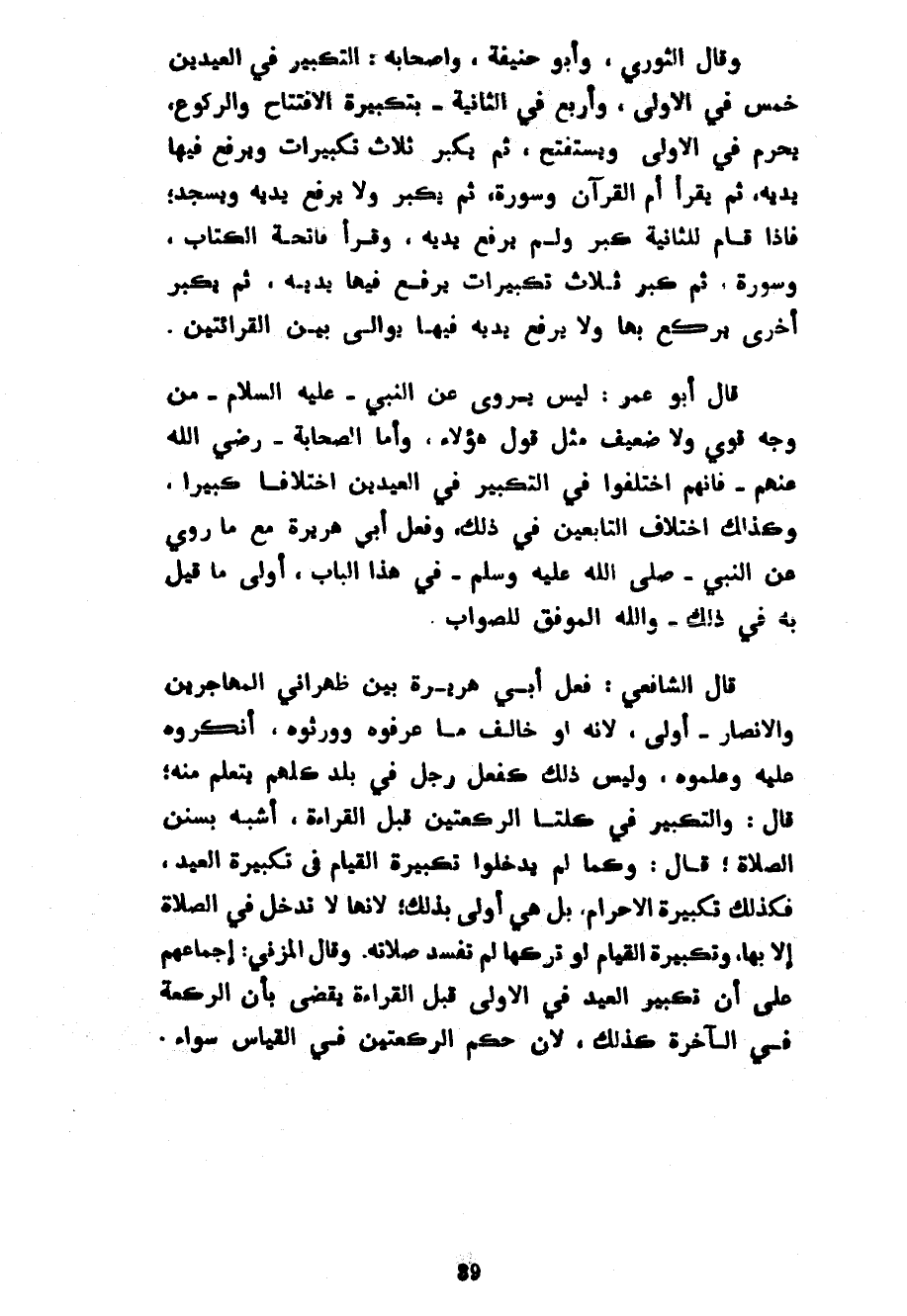 وَقَالَ الثَّوْرِيُّ وَأَبُو حَنِيفَةَ وَأَصْحَابُهُ التَّكْبِيرُ فِي الْعِيدَيْنِ خَمْسٌ فِي الْأُولَى وَأَرْبَعٌ فِي الثَّانِيَةِ بِتَكْبِيرَةِ الِافْتِتَاحِ وَالرُّكُوعِ يُحْرِمُ فِي الْأُولَى وَيَسْتَفْتِحُ ثُمَّ يُكَبِّرُ ثَلَاثَ تَكْبِيرَاتٍ وَيَرْفَعُ فِيهَا يَدَيْهِ ثُمَّ يَقْرَأُ أُمَّ الْقُرْآنِ وَسُورَةً ثُمَّ يُكَبِّرُ وَلَا يَرْفَعُ يَدَيْهِ وَيَسْجُدُ فَإِذَا قَامَ لِلثَّانِيَةِ كَبَّرَ وَلَمْ يَرْفَعْ يَدَيْهِ وَقَرَأَ فَاتِحَةَ الْكِتَابِ وَسُورَةً ثُمَّ كَبَّرَ ثَلَاثَ تَكْبِيرَاتٍ يَرْفَعُ فِيهَا يَدَيْهِ ثُمَّ يُكَبِّرُ أُخْرَى يَرْكَعُ بِهَا وَلَا يرفع يديه فيها يوالي بين القرائتين قَالَ أَبُو عُمَرَ لَيْسَ يُرْوَى عَنِ النَّبِيِّ عَلَيْهِ السَّلَامُ مِنْ وَجْهٍ قَوِيٍّ وَلَا ضَعِيفٍ مِثْلُ قَوْلِ هَؤُلَاءِ وَأَمَّا الصَّحَابَةُ رَضِيَ اللَّهُ عَنْهُمْ فَإِنَّهُمُ اخْتَلَفُوا فِي التَّكْبِيرِ فِي الْعِيدَيْنِ اخْتِلَافًا كَبِيرًا وَكَذَلِكَ اخْتِلَافُ التَّابِعِينَ فِي ذَلِكَ وَفِعْلُ أَبِي هُرَيْرَةَ مَعَ مَا رُوِيَ عَنِ النَّبِيِّ صَلَّى اللَّهُ عَلَيْهِ وَسَلَّمَ فِي هَذَا الْبَابِ أَوْلَى مَا قِيلَ بِهِ فِي ذَلِكَ وَاللَّهُ الْمُوَفِّقُ لِلصَّوَابِ قَالَ الشَّافِعِيُّ فِعْلُ أَبِي هُرَيْرَةَ بَيْنَ ظَهْرَانَيِ الْمُهَاجِرِينَ وَالْأَنْصَارِ أَوْلَى لِأَنَّهُ لَوْ خَالَفَ مَا عَرَفُوهُ وَوَرِثُوهُ أَنْكَرُوهُ عَلَيْهِ وَعَلِمُوهُ وَلَيْسَ ذَلِكَ كَفِعْلِ رَجُلٍ فِي بَلَدٍ كُلُّهُمْ يَتَعَلَّمُ مِنْهُ قَالَ وَالتَّكْبِيرُ فِي كِلْتَا الرَّكْعَتَيْنِ قَبْلَ الْقِرَاءَةِ أَشْبَهُ بِسُنَنِ الصَّلَاةِ قَالَ وَكَمَا لَمْ يُدْخِلُوا تَكْبِيرَةَ الْقِيَامِ فِي تَكْبِيرَةِ الْعِيدِ فَكَذَلِكَ تَكْبِيرَةُ الْإِحْرَامِ بَلْ هِيَ أَوْلَى بِذَلِكَ لِأَنَّهَا لَا تَدْخُلُ فِي الصَّلَاةِ إِلَّا بِهَا وَتَكْبِيرَةُ الْقِيَامِ لَوْ تَرَكَهَا لَمْ تُفْسِدْ صَلَاتَهُ وَقَالَ الْمُزَنِيُّ إِجْمَاعُهُمْ عَلَى أَنَّ تَكْبِيرَ الْعِيدِ فِي الْأُولَى قَبْلَ الْقِرَاءَةِ يَقْضِي بِأَنَّ الرَّكْعَةَ فِي الْآخِرَةِ كَذَلِكَ لِأَنَّ حُكْمَ الرَّكْعَتَيْنِ فِي الْقِيَاسِ سَوَاءٌ
