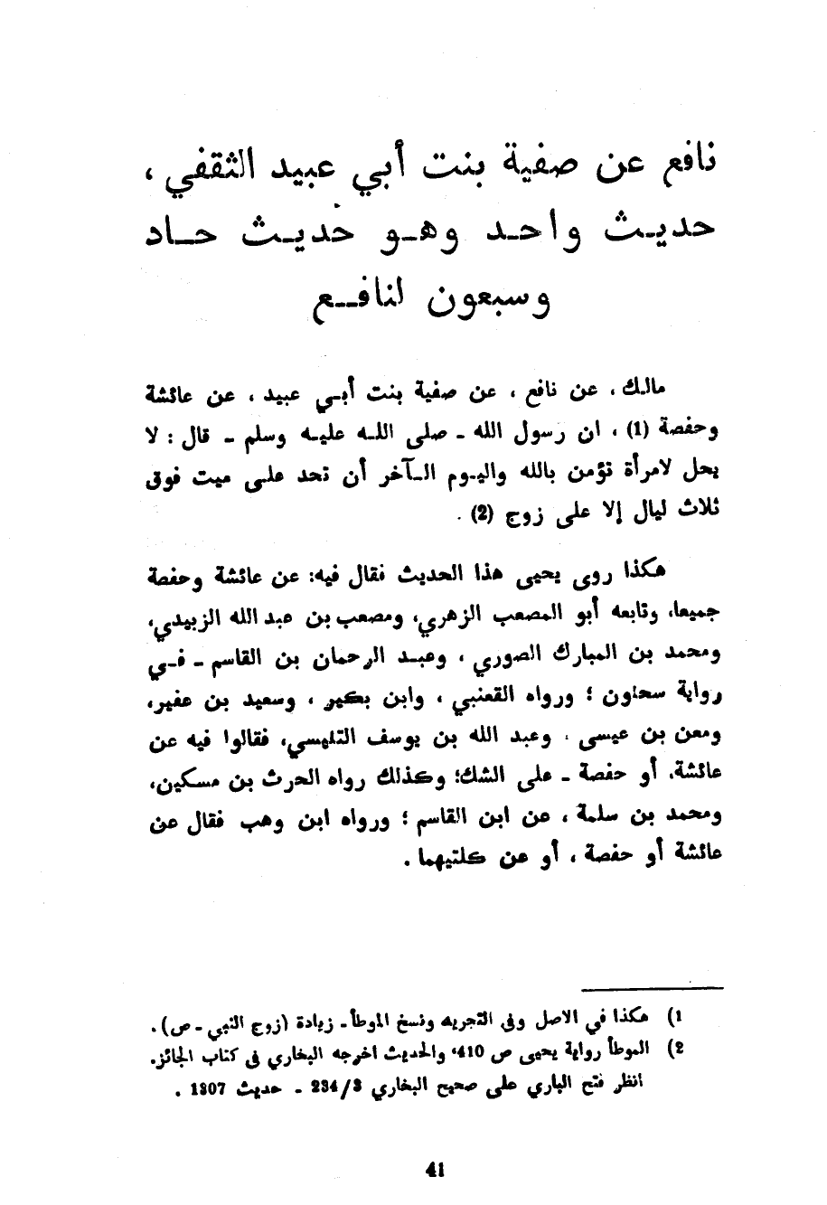 نَافِعٌ عَنْ صَفِيَّةَ بِنْتِ أَبِي عُبَيْدٍ الثَّقَفِيِّ حَدِيثٌ وَاحِدٌ وَهُوَ حَدِيثٌ حَادٍ وَسَبْعُونَ لِنَافِعٍ مَالِكٌ عَنْ نَافِعٍ عَنْ صَفِيَّةَ بِنْتِ أَبِي عُبَيْدٍ عَنْ عَائِشَةَ وَحَفْصَةَ أَنَّ رَسُولَ اللَّهِ صَلَّى اللَّهُ عَلَيْهِ وَسَلَّمَ قَالَ لَا يَحِلُّ لِامْرَأَةٍ تُؤْمِنُ بِاللَّهِ وَالْيَوْمِ الْآخِرِ أَنْ تَحُدَّ عَلَى مَيِّتٍ فَوْقَ ثَلَاثِ لَيَالٍ إِلَّا عَلَى زَوْجٍ هَكَذَا رَوَى يَحْيَى هَذَا الْحَدِيثَ فَقَالَ فِيهِ عَنْ عَائِشَةَ وَحَفْصَةَ جَمِيعًا وَتَابَعَهُ أَبُو الْمُصْعَبِ الزُّهْرِيُّ وَمُصْعَبُ بْنُ عَبْدِ اللَّهِ الزُّبَيْدِيُّ ومحمد بن المبارك الصوري وعبد الرحمان بْنُ الْقَاسِمِ فِي رِوَايَةِ سَحْنُونٍ وَرَوَاهُ الْقَعْنَبِيُّ وَابْنُ بُكَيْرٍ وَسَعِيدُ بْنُ عُفَيْرٍ وَمَعْنُ بْنُ عِيسَى وَعَبْدُ اللَّهِ بْنُ يُوسُفَ التِّنِّيسِيُّ فَقَالُوا فِيهِ عَنْ عَائِشَةَ أَوْ حَفْصَةَ عَلَى الشَّكِّ وكذلك رواه الحرث بْنُ مِسْكِينٍ وَمُحَمَّدُ بْنُ سَلَمَةَ عَنِ ابْنِ الْقَاسِمِ وَرَوَاهُ ابْنُ وَهْبٍ فَقَالَ عَنْ عَائِشَةَ أَوْ حَفْصَةَ أَوْ عَنْ كِلْتَيْهِمَا