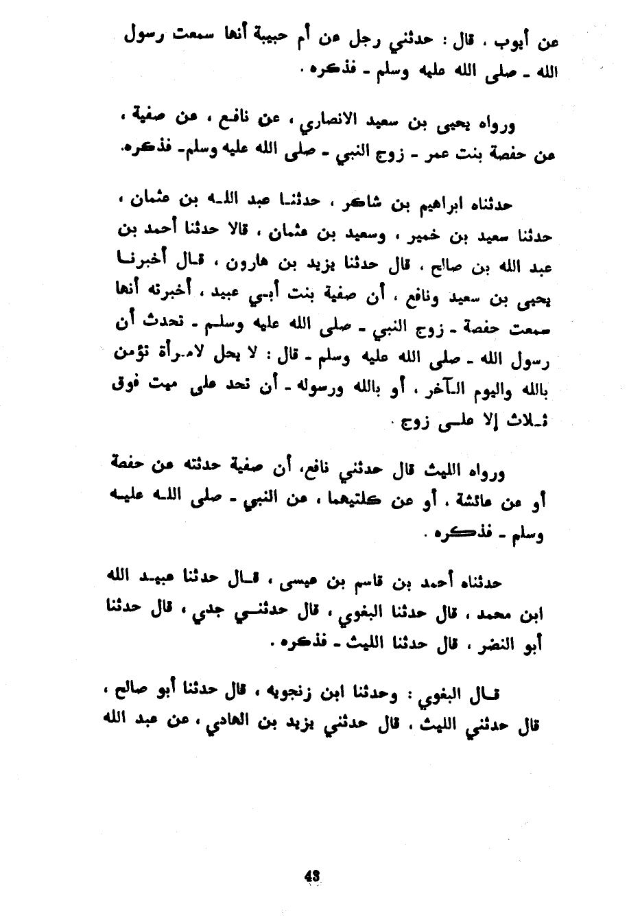 عَنْ أَيُّوبَ قَالَ حَدَّثَنِي رَجُلٌ عَنْ أُمِّ حَبِيبَةَ أَنَّهَا سَمِعَتْ رَسُولَ اللَّهِ صَلَّى اللَّهُ عَلَيْهِ وَسَلَّمَ فَذَكَرَهُ وَرَوَاهُ يَحْيَى بْنُ سَعِيدٍ الْأَنْصَارِيُّ عَنْ نَافِعٍ عَنْ صَفِيَّةَ عَنْ حَفْصَةَ بِنْتِ عُمَرَ زَوْجِ النَّبِيِّ صَلَّى اللَّهُ عَلَيْهِ وَسَلَّمَ فَذَكَرَهُ حَدَّثَنَاهُ إِبْرَاهِيمُ بْنُ شَاكِرٍ حَدَّثَنَا عَبْدُ اللَّهِ بْنُ عُثْمَانَ حَدَّثَنَا سَعِيدُ بْنُ خُمَيْرٍ وَسَعِيدُ بْنُ عمثان قَالَا حَدَّثَنَا أَحْمَدُ بْنُ عَبْدِ اللَّهِ بْنِ صَالِحٍ قَالَ حَدَّثَنَا يَزِيدُ بْنُ هَارُونَ قَالَ يَحْيَى بْنُ سَعِيدٍ وَنَافِعٌ أَنَّ صَفِيَّةَ بِنْتَ أَبِي عُبَيْدٍ أَخْبَرَتْهُ أَنَّهَا سَمِعَتْ حَفْصَةُ زَوْجُ النَّبِيِّ صَلَّى اللَّهُ عَلَيْهِ وَسَلَّمَ تُحَدِّثُ أَنَّ رَسُولَ اللَّهِ صَلَّى اللَّهُ عَلَيْهِ وسلم قَالَ لَا يَحِلُّ لِامْرَأَةٍ تُؤْمِنُ بِاللَّهِ وَالْيَوْمِ الْآخِرِ أَوْ بِاللَّهِ وَرَسُولِهِ أَنْ تَحُدَّ عَلَى مَيِّتٍ فَوْقَ ثَلَاثٍ إِلَّا عَلَى زَوْجٍ وَرَوَاهُ اللَّيْثُ قَالَ حَدَّثَنِي نَافِعٌ أَنَّ صَفِيَّةَ حَدَّثَتْهُ عَنْ حَفْصَةَ أَوْ عَنْ عَائِشَةَ أَوْ عَنْ كِلْتَيْهِمَا عَنِ النَّبِيِّ صَلَّى اللَّهُ عَلَيْهِ وَسَلَّمَ فَذَكَرَهُ حَدَّثَنَاهُ أَحْمَدُ بْنُ قَاسِمِ بْنِ عِيسَى قَالَ حَدَّثَنَا عُبَيْدُ اللَّهِ بْنُ مُحَمَّدٍ قَالَ حَدَّثَنَا الْبَغَوِيُّ قَالَ حَدَّثَنِي جَدِّي قَالَ حَدَّثَنَا أَبُو النَّضْرِ قَالَ حَدَّثَنَا اللَّيْثُ فَذَكَرَهُ قَالَ الْبَغَوِيُّ وَحَدَّثَنَا ابْنُ زَنْجُوَيْهِ قَالَ حَدَّثَنَا أَبُو صَالِحٍ قَالَ حَدَّثَنِيَ اللَّيْثُ قَالَ حَدَّثَنِي يَزِيدُ بْنُ الهادي عن عبد الله