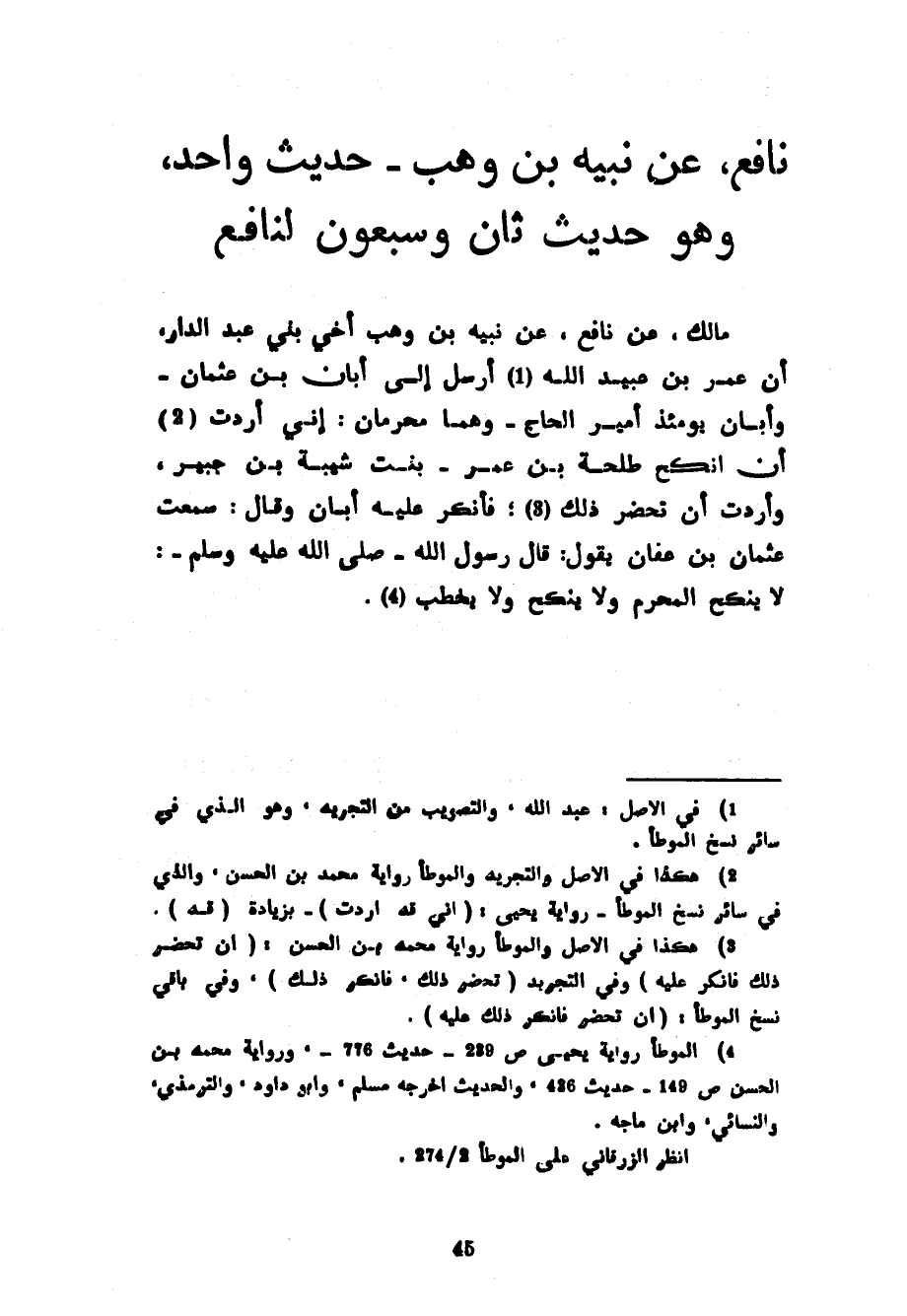 نَافِعٌ عَنْ نُبَيْهِ بْنِ وَهْبٍ حَدِيثٌ وَاحِدٌ وَهُوَ حَدِيثٌ ثَانٍ وَسَبْعُونَ لِنَافِعٍ مَالِكٌ عَنْ نَافِعٍ عَنْ نُبَيْهِ بْنِ وَهْبٍ أَخِي بَنِي عَبْدِ الدَّارِ أَنَّ عُمَرَ بْنَ عُبَيْدِ اللَّهِ أَرْسَلَ إِلَى أَبَانِ بْنِ عُثْمَانَ وَأَبَانٌ يَوْمَئِذٍ أَمِيرُ الْحَاجِّ وَهُمَا مُحْرِمَانِ إِنِّي أَرَدْتُ أَنْ أُنْكِحَ طَلْحَةَ بْنَ عُمَرَ بِنْتَ شَيْبَةَ بْنِ جُبَيْرٍ وَأَرَدْتُ أَنْ تَحْضُرَ ذَلِكَ فَأَنْكَرَ عَلَيْهِ أَبَانٌ وَقَالَ سَمِعْتُ عُثْمَانَ بْنَ عَفَّانَ يَقُولُ قَالَ رَسُولُ اللَّهِ صَلَّى اللَّهُ عَلَيْهِ وسلم لَا يَنْكِحُ الْمُحْرِمُ وَلَا يُنْكَحُ وَلَا يَخْطُبُ
