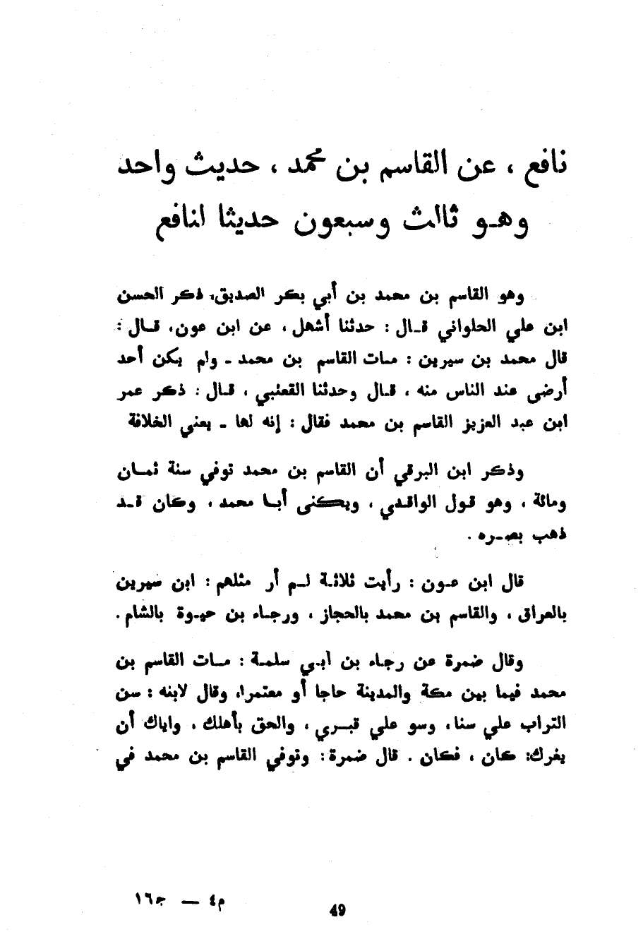 نَافِعٌ عَنِ الْقَاسِمِ بْنِ مُحَمَّدٍ حَدِيثٌ وَاحِدٌ وَهُوَ ثَالِثٌ وَسَبْعُونَ حَدِيثًا لِنَافِعٍ وَهُوَ الْقَاسِمِ بْنِ مُحَمَّدِ بْنِ أَبِي بَكْرٍ الصَّدِيقِ ذَكَرُ الْحَسَنُ بْنُ عَلِيٍّ الْحُلْوَانِيُّ قَالَ حَدَّثَنَا أَشْهَلُ عَنِ ابْنِ عَوْنٍ قَالَ قَالَ مُحَمَّدُ بْنُ سِيرِينَ مَاتَ الْقَاسِمُ بْنُ مُحَمَّدٍ وَلَمْ يَكُنْ أَحَدٌ أَرْضَى عِنْدَ النَّاسِ مِنْهُ قَالَ وَحَدَّثَنَا الْقَعْنَبِيُّ قَالَ ذَكَرَ عُمَرُ بْنُ عَبْدِ الْعَزِيزِ الْقَاسِمَ بْنَ مُحَمَّدٍ فَقَالَ إِنَّهُ لَهَا يَعْنِي الْخِلَافَةَ وَذَكَرَ ابْنُ الْبَرْقِيِّ أَنَّ الْقَاسِمَ بْنَ مُحَمَّدٍ تُوُفِّيَ سَنَةَ ثَمَانٍ وَمِائَةٍ وَهُوَ قَوْلُ الْوَاقِدِيِّ وَيُكَنَّى أَبَا مُحَمَّدٍ وَكَانَ قَدْ ذَهَبَ بَصَرُهُ قَالَ ابْنُ عَوْنٍ رَأَيْتُ ثَلَاثَةً لَمْ أَرَ مِثْلَهُمْ ابْنَ سِيرِينَ بِالْعِرَاقِ وَالْقَاسِمَ بْنَ مُحَمَّدٍ بِالْحِجَازِ وَرَجَاءَ بْنَ حَيْوَةَ بِالشَّامِ وَقَالَ ضَمْرَةُ عَنْ رَجَاءَ بْنِ أَبِي سَلَمَةَ مَاتَ الْقَاسِمُ بْنُ مُحَمَّدٍ فِيمَا بَيْنَ مَكَّةَ وَالْمَدِينَةِ حَاجًّا أَوْ مُعْتَمِرًا وَقَالَ لِابْنِهِ سِنَّ التُّرَابَ عَلَيَّ سَنًّا وَسَوِّ عَلَيَّ قَبْرِي وَالْحَقْ بِأَهْلِكَ وَإِيَّاكَ أَنْ يَغُرَّكَ كَانَ فَكَانَ قَالَ ضَمْرَةُ وَتُوُفِّيَ الْقَاسِمُ بْنُ مُحَمَّدٍ فِي
