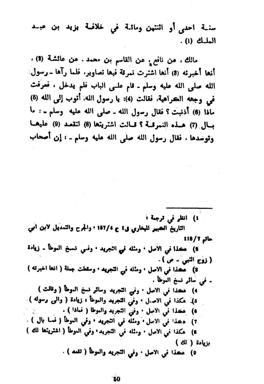 سَنَةِ إِحْدَى أَوِ اثْنَتَيْنِ وَمِائَةٍ فِي خِلَافَةِ يَزِيدَ بْنِ عَبْدِ الْمَلِكِ مَالِكٌ عَنْ نَافِعٍ عَنِ الْقَاسِمِ بْنِ مُحَمَّدٍ عَنْ عَائِشَةَ أَنَّهَا أَخْبَرَتْهُ أَنَّهَا اشْتَرَتْ نُمْرُقَةً فِيهَا تَصَاوِيرُ فَلَمَّا رَآهَا رَسُولُ اللَّهِ صَلَّى اللَّهُ عَلَيْهِ وَسَلَّمَ قَامَ عَلَى الْبَابِ فَلَمْ يَدْخُلْ فَعَرَفَتْ فِي وَجْهِهِ الْكَرَاهِيَةَ فَقَالَتْ يَا رَسُولَ اللَّهِ أَتُوبُ إِلَى اللَّهِ مَاذَا أَذْنَبْتُ فَقَالَ رَسُولُ اللَّهِ صَلَّى اللَّهُ عَلَيْهِ وَسَلَّمَ مَا بَالُ هَذِهِ النُّمْرُقَةِ قَالَتِ اشْتَرَيْتُهَا لِتَقْعُدَ عَلَيْهَا وَتَوَسَّدَهَا فَقَالَ رَسُولُ اللَّهِ صَلَّى اللَّهُ عَلَيْهِ وَسَلَّمَ أن أصحاب