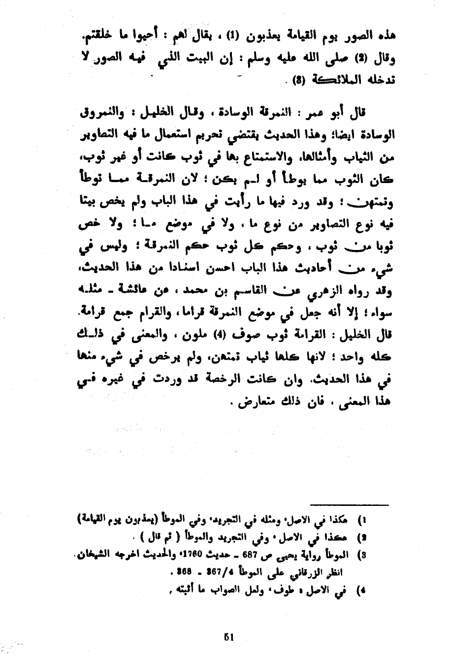 هَذِهِ الصُّوَرِ يَوْمَ الْقِيَامَةِ يُعَذَّبُونَ يُقَالُ لَهُمْ أَحْيُوا مَا خَلَقْتُمْ وَقَالَ صَلَّى اللَّهُ عَلَيْهِ وَسَلَّمَ إِنَّ الْبَيْتَ الَّذِي فِيهِ الصُّوَرُ لَا تَدْخُلُهُ الْمَلَائِكَةُ قَالَ أَبُو عُمَرَ النُّمْرُقَةُ الْوِسَادَةُ وَقَالَ الْخَلِيلُ وَالنُّمْرُوقُ الْوِسَادَةُ أَيْضًا وَهَذَا الْحَدِيثُ يَقْتَضِي تَحْرِيمَ اسْتِعْمَالِ مَا فِيهِ التَّصَاوِيرُ مِنَ الثِّيَابِ وَأَمْثَالِهَا وَالِاسْتِمْتَاعِ بِهَا فِي ثَوْبٍ كَانَتْ أَوْ غَيْرِ ثَوْبٍ كَانَ الثَّوْبُ مِمَّا يُوطَأُ أَوْ لَمْ يَكُنْ لِأَنَّ النُّمْرُقَةَ مِمَّا تُوطَأُ وَتُمْتَهَنُ وَقَدْ وَرَدَ فِيهَا مَا رَأَيْتَ فِي هَذَا الْبَابِ وَلَمْ يَخُصَّ بَيْتًا فِيهِ نَوْعُ التَّصَاوِيرِ مِنْ نَوْعٍ مَا وَلَا فِي مَوْضِعٍ مَا وَلَا خَصَّ ثَوْبًا مِنْ ثَوْبٍ وَحُكْمُ كُلِّ ثَوْبٍ حُكْمُ النُّمْرُقَةِ وَلَيْسَ فِي شَيْءٍ مِنْ أَحَادِيثِ هَذَا الْبَابِ أَحْسَنُ إِسْنَادًا مِنْ هَذَا الْحَدِيثِ وَقَدْ رَوَاهُ الزُّهْرِيُّ عَنِ الْقَاسِمِ بْنِ مُحَمَّدٍ عَنْ عَائِشَةَ مِثْلَهُ سَوَاءً إِلَّا أَنَّهُ جَعَلَ فِي مَوْضِعِ النُّمْرُقَةِ قِرَامًا وَالْقِرَامُ جَمْعُ قُرَامَةَ قَالَ الْخَلِيلُ الْقُرَامَةُ ثَوْبُ صُوفٍ مُلَوَّنٌ وَالْمَعْنَى فِي ذَلِكَ كُلِّهِ وَاحِدٌ لِأَنَّهَا كُلَّهَا ثِيَابٌ تُمْتَهَنُ وَلَمْ يُرَخَّصْ فِي شَيْءٍ مِنْهَا فِي هَذَا الْحَدِيثِ وَإِنْ كَانَتِ الرُّخْصَةُ قَدْ وَرَدَتْ فِي غَيْرِهِ فِي هَذَا الْمَعْنَى فَإِنَّ ذَلِكَ مُتَعَارِضٌ