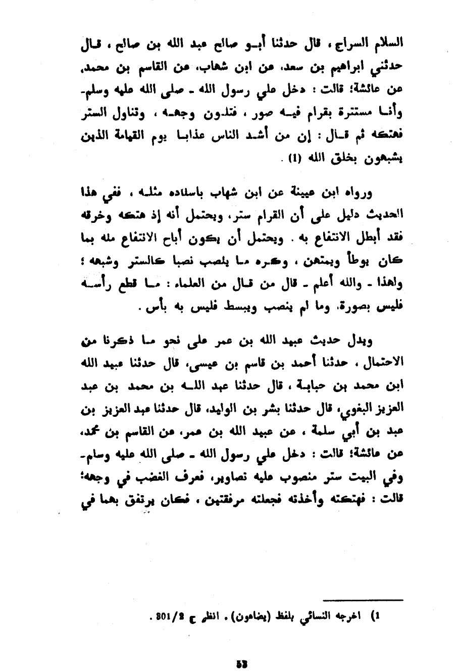 السَّلَامِ السَّرَّاجُ قَالَ حَدَّثَنَا أَبُو صَالِحٍ عَبْدُ اللَّهِ بْنُ صَالِحٍ قَالَ حَدَّثَنِي إِبْرَاهِيمُ بْنُ سَعْدٍ عَنِ ابْنِ شِهَابٍ عَنِ الْقَاسِمِ بْنِ مُحَمَّدٍ عَنْ عَائِشَةَ قَالَتْ دَخَلَ عَلَيَّ رَسُولُ اللَّهِ صَلَّى اللَّهُ عَلَيْهِ وَسَلَّمَ وَأَنَا مُسْتَتِرَةٌ بِقِرَامٍ فِيهِ صُوَرٌ فَتَلَوَّنَ وَجْهُهُ وَتَنَاوَلَ السِّتْرَ فَهَتَكَهُ ثُمَّ قَالَ إِنَّ مِنْ أَشَدِّ النَّاسِ عَذَابًا يَوْمَ الْقِيَامَةِ الَّذِينَ يُشَبِّهُونَ بِخَلْقِ اللَّهِ وَرَوَاهُ ابْنُ عُيَيْنَةَ عَنِ ابْنِ شِهَابٍ بِإِسْنَادِهِ مِثْلَهُ فَفِي هَذَا الْحَدِيثِ دَلِيلٌ عَلَى أَنَّ الْقِرَامَ سِتْرٌ وَيُحْتَمَلُ أَنَّهُ إِذْ هَتَكَهُ وَخَرَقَهُ فَقَدْ أَبْطَلَ الِانْتِفَاعَ بِهِ وَيُحْتَمَلُ أَنْ يَكُونَ أَبَاحَ الِانْتِفَاعَ مِنْهُ بِمَا كَانَ يُوطَأُ وَيُمْتَهَنُ وَكَرِهَ مَا يُنْصَبُ نَصْبًا كَالسِّتْرِ وَشِبْهِهِ وَلِهَذَا وَاللَّهُ أَعْلَمُ قَالَ مَنْ قَالَ مِنَ الْعُلَمَاءِ مَا قُطِعَ رَأْسُهُ فَلَيْسَ بِصُورَةٍ وَمَا لَمْ يُنْصَبْ وَيُبْسَطْ فَلَيْسَ بِهِ بَأْسٌ وَيَدُلُّ حَدِيثُ عُبَيْدِ اللَّهِ بْنِ عُمَرَ عَلَى نَحْوِ مَا ذَكَرْنَا مِنَ الِاحْتِمَالِ حَدَّثَنَا أَحْمَدُ بْنُ قَاسِمِ بْنِ عِيسَى قَالَ حَدَّثَنَا عُبَيْدُ اللَّهِ بْنُ مُحَمَّدِ بْنِ حَبَابَةَ قَالَ حَدَّثَنَا عَبْدُ اللَّهِ بْنُ مُحَمَّدِ بْنِ عَبْدِ الْعَزِيزِ الْبَغَوِيُّ قَالَ حَدَّثَنَا بِشْرُ بْنُ الْوَلِيدِ قَالَ حَدَّثَنَا عَبْدُ الْعَزِيزِ بْنُ عَبْدِ بْنِ أَبِي سَلَمَةَ عَنْ عُبَيْدِ اللَّهِ بْنِ عُمَرَ عَنِ الْقَاسِمِ بْنِ مُحَمَّدٍ عَنْ عَائِشَةَ قَالَتْ دَخَلَ عَلَيَّ رَسُولُ اللَّهِ صَلَّى اللَّهُ عَلَيْهِ وَسَلَّمَ وَفِي الْبَيْتِ سِتْرٌ مَنْصُوبٌ عَلَيْهِ تَصَاوِيرُ فَعُرِفَ الْغَضَبُ فِي وَجْهِهِ قَالَتْ فَهَتَكْتُهُ وَأَخَذْتُهُ فَجَعَلْتُهُ مِرْفَقَتَيْنِ فَكَانَ يَرْتَفِقُ بِهِمَا فِي