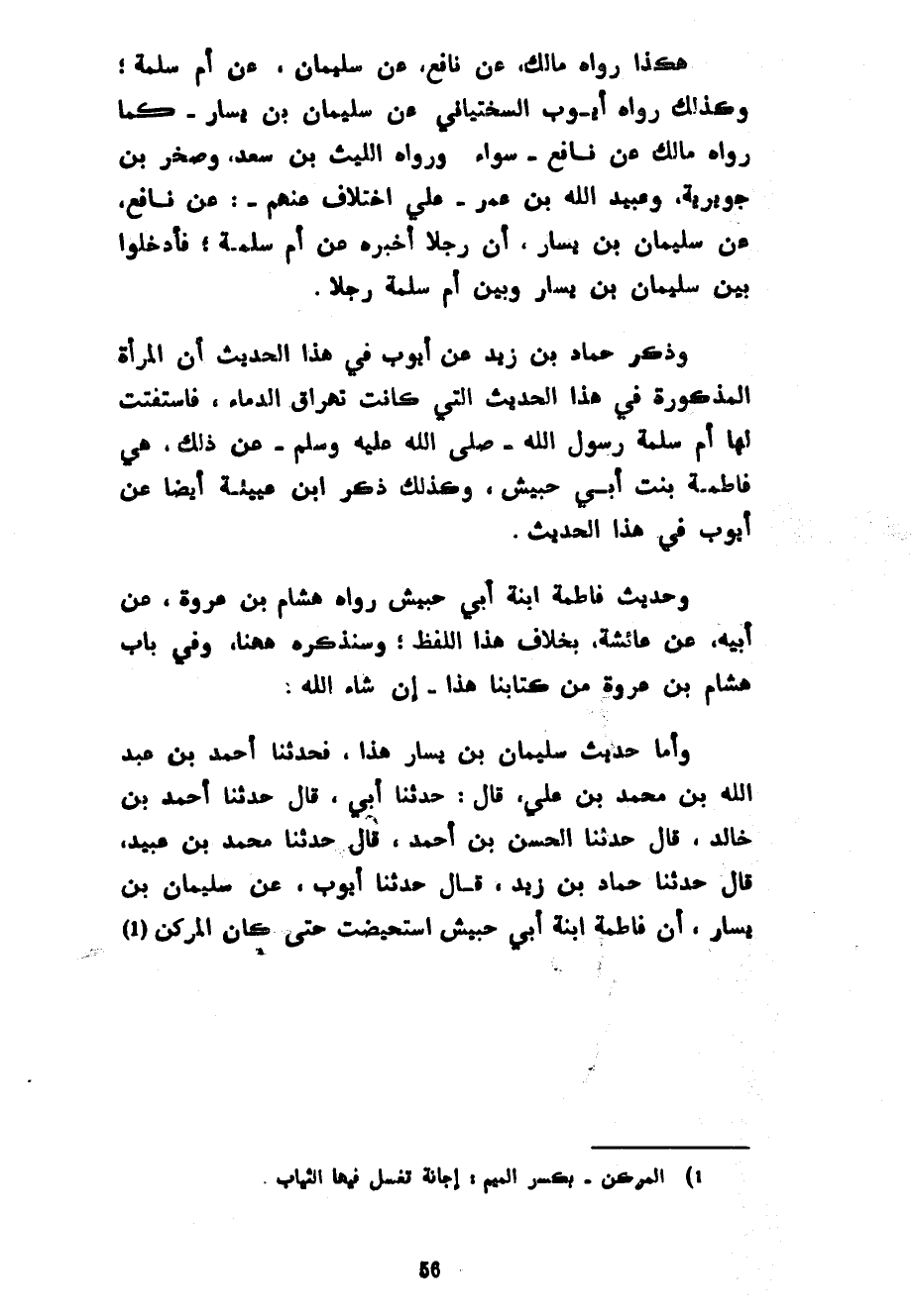 هَكَذَا رَوَاهُ مَالِكٌ عَنْ نَافِعٍ عَنْ سُلَيْمَانَ عَنْ أُمِّ سَلَمَةَ وَكَذَلِكَ رَوَاهُ أَيُّوبُ السِّخْتِيَانِيُّ عَنْ سُلَيْمَانَ بْنِ يَسَارٍ كَمَا رَوَاهُ مَالِكٌ عن نافع سواء ورواه الليث بن سعيد وخصر بْنُ جُوَيْرِيَّةَ وَعُبَيْدُ اللَّهِ بْنُ عُمَرَ عَلَى اخْتِلَافٍ عَنْهُمْ عَنْ نَافِعٍ عَنْ سُلَيْمَانَ بْنِ يَسَارٍ أَنَّ رَجُلًا أَخْبَرَهُ عَنْ أُمِّ سَلَمَةَ فَأَدْخَلُوا بَيْنَ سُلَيْمَانَ بْنِ يَسَارٍ وَبَيْنَ أُمِّ سَلَمَةَ رَجُلًا وَذَكَرَ حَمَّادُ بْنُ زَيْدٍ عَنْ أَيُّوبَ فِي هَذَا الْحَدِيثِ أَنَّ الْمَرْأَةَ الْمَذْكُورَةَ فِي هَذَا الْحَدِيثِ الَّتِي كَانَتْ تُهَرَاقُ الدِّمَاءَ فَاسْتَفْتَتْ لَهَا أُمُّ سَلَمَةَ رَسُولَ اللَّهِ صَلَّى اللَّهُ عَلَيْهِ وَسَلَّمَ عَنْ ذَلِكَ هِيَ فَاطِمَةُ بِنْتُ أَبِي حُبَيْشٍ وَكَذَلِكَ ذَكَرَ ابْنُ عُيَيْنَةَ أَيْضًا عَنْ أَيُّوبَ فِي هَذَا الْحَدِيثِ وَحَدِيثُ فَاطِمَةَ ابْنَةِ أَبِي حُبَيْشٍ رَوَاهُ هِشَامُ بْنُ عُرْوَةَ عَنْ أَبِيهِ عَنْ عَائِشَةَ بِخِلَافِ هَذَا اللفظ وسنذكره ههنا وَفِي بَابِ هِشَامِ بْنِ عُرْوَةَ مِنْ كِتَابِنَا هَذَا إِنْ شَاءَ اللَّهُ وَأَمَّا حَدِيثُ سُلَيْمَانَ بْنِ يَسَارٍ هَذَا فَحَدَّثَنَا أَحْمَدُ بْنُ عَبْدِ اللَّهِ بْنِ مُحَمَّدِ بْنِ عَلِيٍّ قَالَ حَدَّثَنَا أَبِي قَالَ حَدَّثَنَا أَحْمَدُ بْنُ خَالِدٍ قَالَ حَدَّثَنَا الْحَسَنُ بْنُ أَحْمَدَ قَالَ حَدَّثَنَا مُحَمَّدُ بْنُ عُبَيْدٍ قَالَ حَدَّثَنَا حَمَّادُ بْنُ زَيْدٍ قَالَ حَدَّثَنَا أَيُّوبُ عَنْ سُلَيْمَانَ بْنِ يَسَارٍ أَنَّ فَاطِمَةَ ابْنَةَ أَبِي حُبَيْشٍ اسْتُحِيضَتْ حَتَّى كان المركن