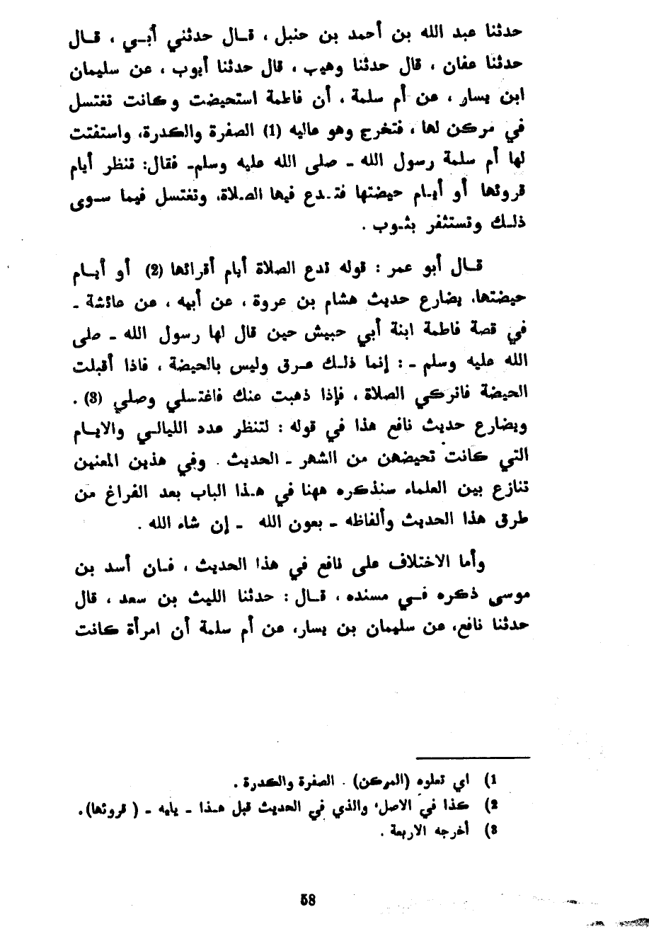حَدَّثَنَا عَبْدُ اللَّهِ بْنُ أَحْمَدَ بْنِ حَنْبَلٍ قَالَ حَدَّثَنِي أَبِي قَالَ حَدَّثَنَا عَفَّانُ قَالَ حَدَّثَنَا وُهَيْبٌ قَالَ حَدَّثَنَا أَيُّوبُ عَنْ سُلَيْمَانَ بْنِ يَسَارٍ عَنْ أُمِّ سَلَمَةَ أَنَّ فَاطِمَةَ اسْتُحِيضَتْ وَكَانَتْ تَغْتَسِلُ فِي مِرْكَنٍ لَهَا فَتَخْرُجُ وَهُوَ عَالِيهِ الصُّفْرَةُ وَالْكُدْرَةُ وَاسْتَفْتَتْ لَهَا أُمُّ سَلَمَةَ رَسُولَ اللَّهِ صَلَّى اللَّهُ عَلَيْهِ وَسَلَّمَ فَقَالَ تَنْظُرُ أَيَّامَ قُرُوئِهَا أَوْ أَيَّامَ حَيْضَتِهَا فَتَدَعُ فِيهَا الصَّلَاةَ وَتَغْتَسِلُ فِيمَا سِوَى ذَلِكَ وَتَسْتَثْفِرُ بِثَوْبٍ قَالَ أَبُو عُمَرَ قَوْلُهُ تَدَعُ الصَّلَاةَ أَيَّامَ أقْرَائِهَا أَوْ أَيَّامَ حَيْضَتِهَا يُضَارِعُ حَدِيثَ هِشَامِ بْنِ عُرْوَةَ عَنْ أَبِيهِ عَنْ عَائِشَةَ فِي قِصَّةِ فَاطِمَةَ ابْنَةِ أَبِي حُبَيْشٍ حِينَ قَالَ لَهَا رَسُولُ اللَّهِ صَلَّى اللَّهُ عَلَيْهِ وَسَلَّمَ إِنَّمَا ذَلِكَ عِرْقٌ وَلَيْسَ بِالْحَيْضَةِ فَإِذَا أَقْبَلَتِ الْحَيْضَةُ فَاتْرُكِي الصَّلَاةَ فَإِذَا ذَهَبَتْ عَنْكِ فَاغْتَسِلِي وَصَلِّي وَيُضَارِعُ حَدِيثَ نَافِعٍ هَذَا فِي قَوْلِهِ لِتَنْظُرْ عَدَدَ اللَّيَالِي وَالْأَيَّامِ الَّتِي كانت تحيضهم مِنَ الشَّهْرِ الْحَدِيثَ وَفِي هَذَيْنِ الْمَعْنَيَيْنِ تَنَازُعٌ بين العلماء سنذكره ههنا فِي هَذَا الْبَابِ بَعْدَ الْفَرَاغِ مِنْ طُرُقِ هَذَا الْحَدِيثِ وَأَلْفَاظِهِ بِعَوْنِ اللَّهِ إِنْ شَاءَ اللَّهُ وَأَمَّا الِاخْتِلَافُ عَلَى نَافِعٍ فِي هَذَا الْحَدِيثِ فَإِنَّ أَسَدَ بْنَ مُوسَى ذَكَرَهُ فِي مُسْنَدِهِ قَالَ حَدَّثَنَا اللَّيْثُ بْنُ سَعْدٍ قَالَ حَدَّثَنَا نَافِعٌ عَنْ سُلَيْمَانَ بْنِ يَسَارٍ عَنْ أُمِّ سَلَمَةَ أَنَّ امْرَأَةً كَانَتْ