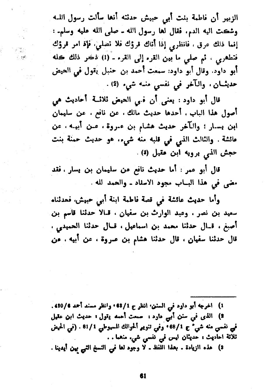 الزُّبَيْرِ أَنَّ فَاطِمَةَ بِنْتَ أَبِي حُبَيْشٍ حَدَّثَتْهُ أَنَّهَا سَأَلَتْ رَسُولَ اللَّهِ وَشَكَتْ إِلَيْهِ الدَّمَ فَقَالَ لَهَا رَسُولُ اللَّهِ صَلَّى اللَّهُ عَلَيْهِ وَسَلَّمَ إِنَّمَا ذَلِكَ عِرْقٌ فَانْظُرِي إِذَا أَتَاكِ قُرْؤُكِ فَلَا تُصَلِّي فَإِذَا مَرَّ قُرْؤُكِ فَتَطَهَّرِي ثُمَّ صَلِّي مَا بَيْنَ الْقُرْءِ إِلَى الْقُرْءِ ذَكَرَ ذَلِكَ كُلَّهُ أَبُو دَاوُدَ وَقَالَ أَبُو دَاوُدَ سَمِعْتُ أَحْمَدَ بْنَ حَنْبَلٍ يَقُولُ فِي الْحَيْضِ حَدِيثَانِ وَالْآخَرُ فِي نَفْسِي مِنْهُ شَيْءٌ قَالَ أَبُو دَاوُدَ يَعْنِي أَنَّ فِي الْحَيْضِ ثَلَاثَةَ أَحَادِيثَ هِيَ أُصُولُ هَذَا الْبَابِ أَحَدُهَا حَدِيثُ مَالِكٍ عَنْ نَافِعٍ عَنْ سُلَيْمَانَ بْنِ يَسَارٍ وَالْآخَرُ حَدِيثَ هِشَامِ بْنِ عُرْوَةَ عَنْ أَبِيهِ عَنْ عَائِشَةَ وَالثَّالِثُ الَّذِي فِي قَلْبِهِ مِنْهُ شَيْءٌ هُوَ حَدِيثُ حَمْنَةَ بِنْتِ جَحْشٍ الَّذِي يَرْوِيهِ ابْنُ عُقَيْلٍ قَالَ أَبُو عُمَرَ أَمَّا حَدِيثُ نَافِعٍ عَنْ سُلَيْمَانَ بْنِ يَسَارٍ فَقَدْ مَضَى فِي هَذَا الْبَابِ مُجَوَّدَ الْإِسْنَادِ وَالْحَمْدُ لِلَّهِ وَأَمَّا حَدِيثُ عَائِشَةَ فِي قِصَّةِ فَاطِمَةَ ابْنَةِ أَبِي حُبَيْشٍ فَحَدَّثَنَاهُ سَعِيدُ بْنُ نَصْرٍ وَعَبْدُ الْوَارِثِ بْنُ سُفْيَانَ قَالَا حَدَّثَنَا قَاسِمُ بْنُ أَصْبَغَ قَالَ حَدَّثَنَا مُحَمَّدُ بْنُ إِسْمَاعِيلَ قَالَ حَدَّثَنَا الْحُمَيْدِيُّ قَالَ حَدَّثَنَا سُفْيَانُ قَالَ حَدَّثَنَا هِشَامُ بْنُ عُرْوَةَ عَنْ أَبِيهِ عَنْ