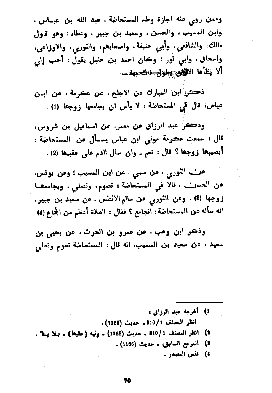 وَمِمَّنْ رُوِيَ عَنْهُ إِجَازَةُ وَطْءِ الْمُسْتَحَاضَةِ عَبْدُ اللَّهِ بْنُ عَبَّاسٍ وَابْنُ الْمُسَيَّبِ وَالْحَسَنُ وَسَعِيدُ بْنُ جُبَيْرٍ وَعَطَاءٌ وَهُوَ قَوْلُ مَالِكٍ وَالشَّافِعِيِّ وَأَبِي حَنِيفَةَ وَأَصْحَابِهِمْ وَالثَّوْرِيِّ وَالْأَوْزَاعِيِّ وَإِسْحَاقَ وَأَبِي ثَوْرٍ وَكَانَ أَحْمَدُ بْنُ حَنْبَلٍ يَقُولُ أَحَبُّ إِلَيَّ أَلَّا يَطَأَهَا إِلَّا أَنْ يَطُولَ ذَلِكَ بِهَا ذَكَرَ ابْنُ الْمُبَارَكِ عَنِ الْأَجْلَحِ عَنْ عِكْرِمَةَ عَنِ ابْنِ عَبَّاسٍ قَالَ فِي الْمُسْتَحَاضَةِ لَا بَأْسَ أَنْ يُجَامِعَهَا زَوْجُهَا وَذَكَرَ عَبْدُ الرَّزَّاقِ عَنْ مَعْمَرٍ عَنْ إِسْمَاعِيلَ بْنِ شَرُوسٍ قَالَ سَمِعْتُ عِكْرِمَةَ مَوْلَى ابْنِ عَبَّاسٍ يَسْأَلُ عَنِ الْمُسْتَحَاضَةِ أَيُصِيبُهَا زَوْجُهَا قَالَ نَعَمْ وَإِنْ سَالَ الدَّمُ عَلَى عَقِبَيْهَا عَنِ الثَّوْرِيِّ عَنْ سُمَيٍّ عَنِ ابْنِ الْمُسَيَّبِ وَعَنْ يُونُسَ عَنِ الْحَسَنِ قَالَا فِي الْمُسْتَحَاضَةِ تَصُومُ وَتُصَلِّي وَيُجَامِعُهَا زَوْجُهَا وَعَنِ الثَّوْرِيِّ عَنْ سَالِمٍ الْأَفْطَسِ عَنْ سَعِيدِ بْنِ جُبَيْرِ أَنَّهُ سَأَلَهُ عَنِ الْمُسْتَحَاضَةِ أَتُجَامِعُ فَقَالَ الصَّلَاةُ أَعْظَمُ مِنَ الْجِمَاعِ وَذَكَرَ ابْنُ وَهْبٍ عَنْ عَمْرِو بْنِ الْحَرْثِ عَنْ يَحْيَى بْنِ سَعِيدٍ عَنْ سَعِيدِ بْنِ المسيب أَنَّهُ قَالَ الْمُسْتَحَاضَةُ تَصُومُ وَتُصَلِّي