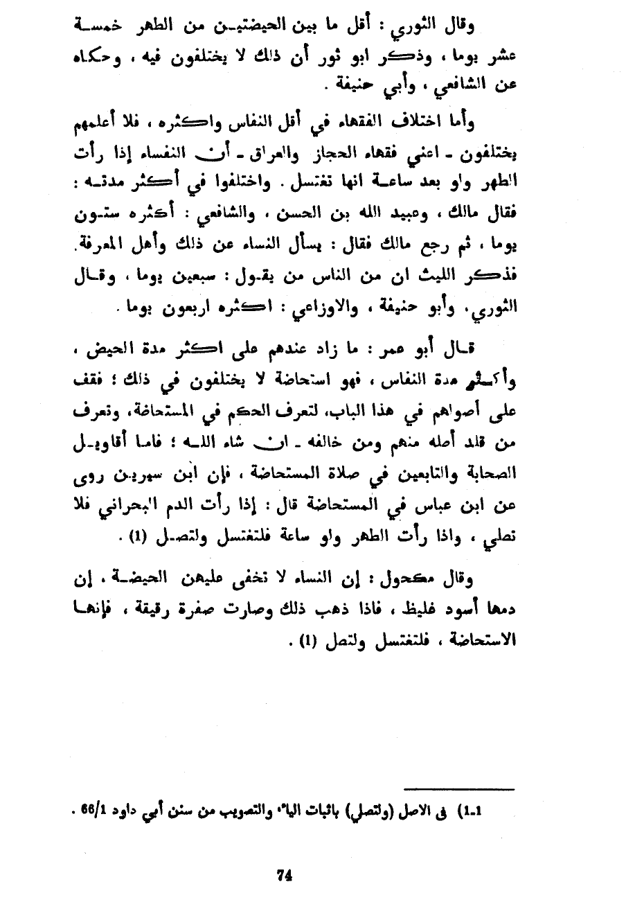 وَقَالَ الثَّوْرِيُّ أَقَلُّ مَا بَيْنَ الْحَيْضَتَيْنِ مِنَ الطُّهْرِ خَمْسَةَ عَشَرَ يَوْمًا وَذَكَرَ أَبُو ثَوْرٍ أَنَّ ذَلِكَ لَا يَخْتَلِفُونَ فِيهِ وَحَكَاهُ عَنِ الشَّافِعِيِّ وَأَبِي حَنِيفَةَ وَأَمَّا اخْتِلَافُ الْفُقَهَاءِ فِي أَقَلِّ النِّفَاسِ وَأَكْثَرِهِ فَلَا أَعْلَمُهُمْ يَخْتَلِفُونَ أَعْنِي فُقَهَاءَ الْحِجَازِ وَالْعِرَاقِ أَنَّ النُّفَسَاءَ إِذَا رَأَتِ الطُّهْرَ وَلَوْ بَعْدَ سَاعَةٍ أَنَّهَا تَغْتَسِلُ وَاخْتَلَفُوا فِي أَكْثَرِ مُدَّتِهِ فَقَالَ مَالِكٌ وَعُبَيْدُ اللَّهِ بْنُ الْحَسَنِ وَالشَّافِعِيُّ أَكْثَرُهُ سِتُّونَ يَوْمًا ثُمَّ رَجَعَ مَالِكٌ فَقَالَ يُسْأَلُ النِّسَاءُ عَنْ ذَلِكَ وَأَهْلُ الْمَعْرِفَةِ فَذَكَرَ اللَّيْثُ أَنَّ مِنَ النَّاسِ مَنْ يَقُولُ سَبْعِينَ يَوْمًا وَقَالَ الثَّوْرِيُّ وَأَبُو حَنِيفَةَ وَالْأَوْزَاعِيُّ أَكْثَرُهُ أَرْبَعُونَ يَوْمًا قَالَ أَبُو عُمَرَ مَا زَادَ عِنْدَهُمْ عَلَى أَكْثَرِ مُدَّةِ الْحَيْضِ وَأَكْثَرِ مُدَّةِ النِّفَاسِ فَهُوَ اسْتِحَاضَةٌ لَا يَخْتَلِفُونَ فِي ذَلِكَ فَقِفْ عَلَى أُصُولِهِمْ فِي هَذَا الْبَابِ لِتَعْرِفَ الْحُكْمَ فِي الْمُسْتَحَاضَةِ وَتَعْرِفَ مَنْ قَلَّدَ أَصْلَهُ مِنْهُمْ وَمَنْ خَالَفَهُ إِنْ شَاءَ اللَّهُ فَأَمَّا أَقَاوِيلُ الصَّحَابَةِ وَالتَّابِعِينَ فِي صَلَاةِ الْمُسْتَحَاضَةِ فَإِنَّ ابْنَ سِيرِينَ رَوَى عَنِ ابْنِ عَبَّاسٍ فِي الْمُسْتَحَاضَةِ قَالَ إِذَا رَأَتِ الدَّمَ الْبَحْرَانِيَّ فَلَا تُصَلِّي وَإِذَا رَأَتِ الطُّهْرَ وَلَوْ سَاعَةً فَلْتَغْتَسِلْ وَلْتُصَلِّ وَقَالَ مَكْحُولٌ إِنَّ النِّسَاءَ لَا تَخْفَى عَلَيْهِنَّ الْحَيْضَةُ إِنَّ دَمَهَا أَسْوَدُ غَلِيظٌ فَإِذَا ذَهَبَ ذَلِكَ وَصَارَتْ صُفْرَةً رَقِيقَةً فَإِنَّهَا الِاسْتِحَاضَةُ فَلْتَغْتَسِلْ وَلْتُصَلِّ