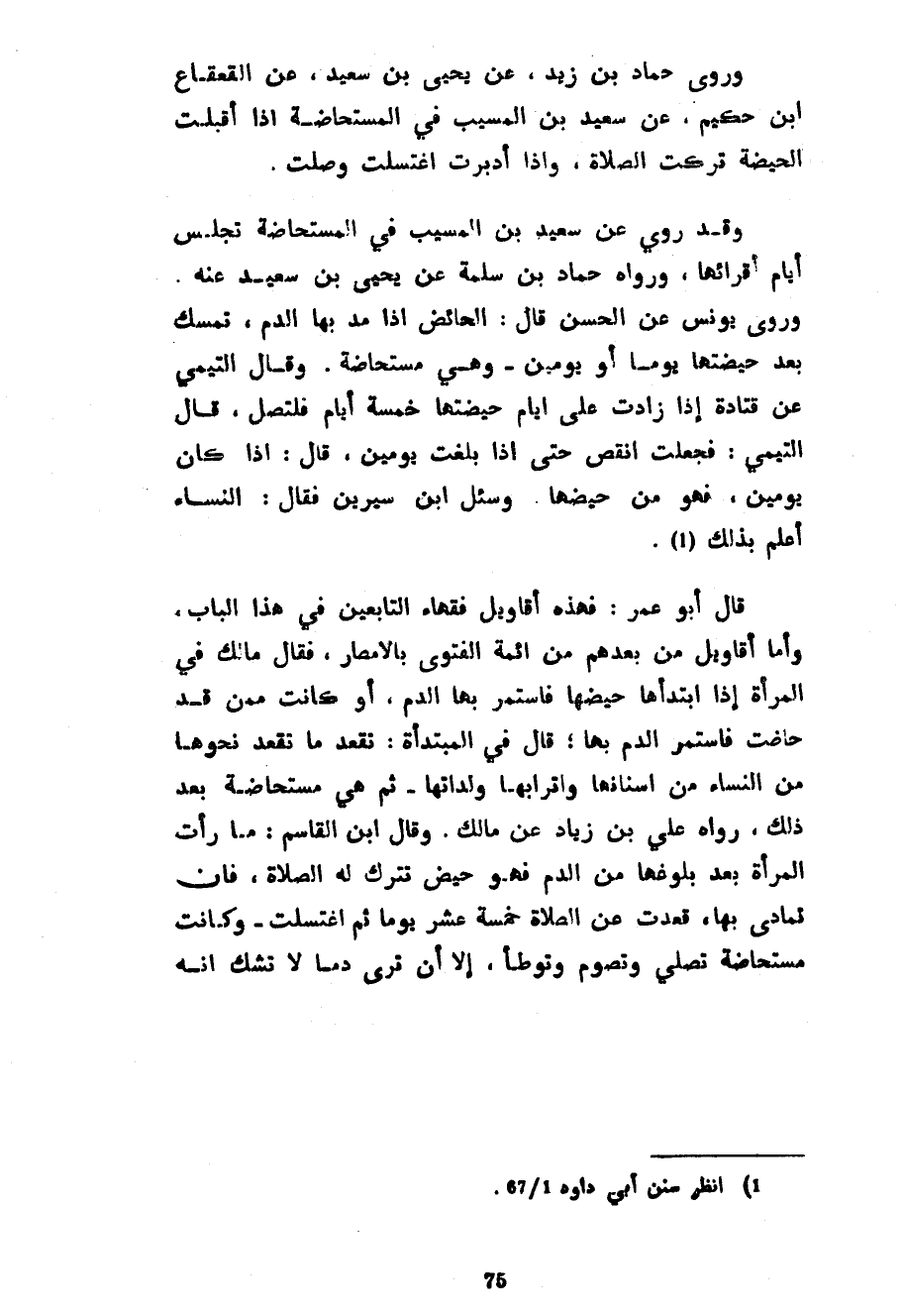 وَرَوَى حَمَّادُ بْنُ زَيْدٍ عَنْ يَحْيَى بْنِ سَعِيدٍ عَنِ الْقَعْقَاعِ بْنِ حَكِيمٍ عَنْ سَعِيدِ بْنِ الْمُسَيَّبِ فِي الْمُسْتَحَاضَةِ إِذَا أَقْبَلَتِ الْحَيْضَةُ تَرَكَتِ الصَّلَاةَ وَإِذَا أَدْبَرَتِ اغْتَسَلَتْ وَصَلَّتْ وَقَدْ رُوِيَ عَنْ سَعِيدِ بْنِ الْمُسَيَّبِ فِي الْمُسْتَحَاضَةِ تَجْلِسُ أَيَّامَ أَقْرَائِهَا وَرَوَاهُ حَمَّادُ بْنُ سَلَمَةَ عَنْ يَحْيَى بْنِ سَعِيدٍ عَنْهُ وَرَوَى يُونُسُ عَنِ الْحَسَنِ قَالَ الْحَائِضُ إِذَا مَدَّ بِهَا الدَّمُ تُمْسِكُ بَعْدَ حَيْضَتِهَا يَوْمًا أَوْ يَوْمَيْنِ وَهِيَ مُسْتَحَاضَةٌ وَقَالَ التَّيْمِيُّ عَنْ قَتَادَةَ إِذَا زَادَتْ عَلَى أَيَّامِ حَيْضَتِهَا خَمْسَةَ أَيَّامٍ فَلْتُصَلِّ قَالَ التَّيْمِيُّ فَجَعَلْتُ أُنْقِصُ حَتَّى إِذَا بَلَغْتُ يَوْمَيْنِ قَالَ إِذَا كَانَ يَوْمَيْنِ فَهُوَ مِنْ حَيْضِهَا وَسُئِلَ ابْنُ سِيرِينَ فَقَالَ النِّسَاءُ أَعْلَمُ بِذَلِكَ قَالَ أَبُو عُمَرَ فَهَذِهِ أَقَاوِيلُ فُقَهَاءِ التَّابِعِينَ فِي هَذَا الْبَابِ وَأَمَّا أَقَاوِيلُ مَنْ بَعْدَهُمْ مِنْ أَئِمَّةِ الْفَتْوَى بِالْأَمْصَارِ فَقَالَ مَالِكٌ فِي الْمَرْأَةِ إِذَا ابْتَدَأَهَا حَيْضُهَا فَاسْتَمَرَّ بِهَا الدَّمُ أَوْ كَانَتْ مِمَّنْ قَدْ حَاضَتْ فَاسْتَمَرَّ الدَّمُ بِهَا قَالَ فِي الْمُبْتَدَأَةِ تَقْعُدُ مَا تَقْعُدُ نَحْوُهَا مِنَ النِّسَاءِ مِنْ أَسْنَانِهَا وَأَتْرَابِهَا وَلِدَاتِهَا ثُمَّ هِيَ مُسْتَحَاضَةٌ بَعْدَ ذَلِكَ رَوَاهُ عَلِيُّ بْنُ زِيَادٍ عَنْ مَالِكٍ وَقَالَ ابْنُ الْقَاسِمِ مَا رَأَتِ الْمَرْأَةُ بَعْدَ بُلُوغِهَا مِنَ الدَّمِ فَهُوَ حَيْضٌ تَتْرُكُ لَهُ الصَّلَاةَ فَإِنْ تَمَادَى بِهَا قَعَدَتْ عَنِ الصَّلَاةِ خَمْسَةَ عَشَرَ يَوْمًا ثُمَّ اغْتَسَلَتْ وَكَانَتْ مُسْتَحَاضَةً تُصَلِّي وَتَصُومُ وَتُوطَأُ إِلَّا أَنْ تَرَى دَمًا لَا تَشُكُّ أنه