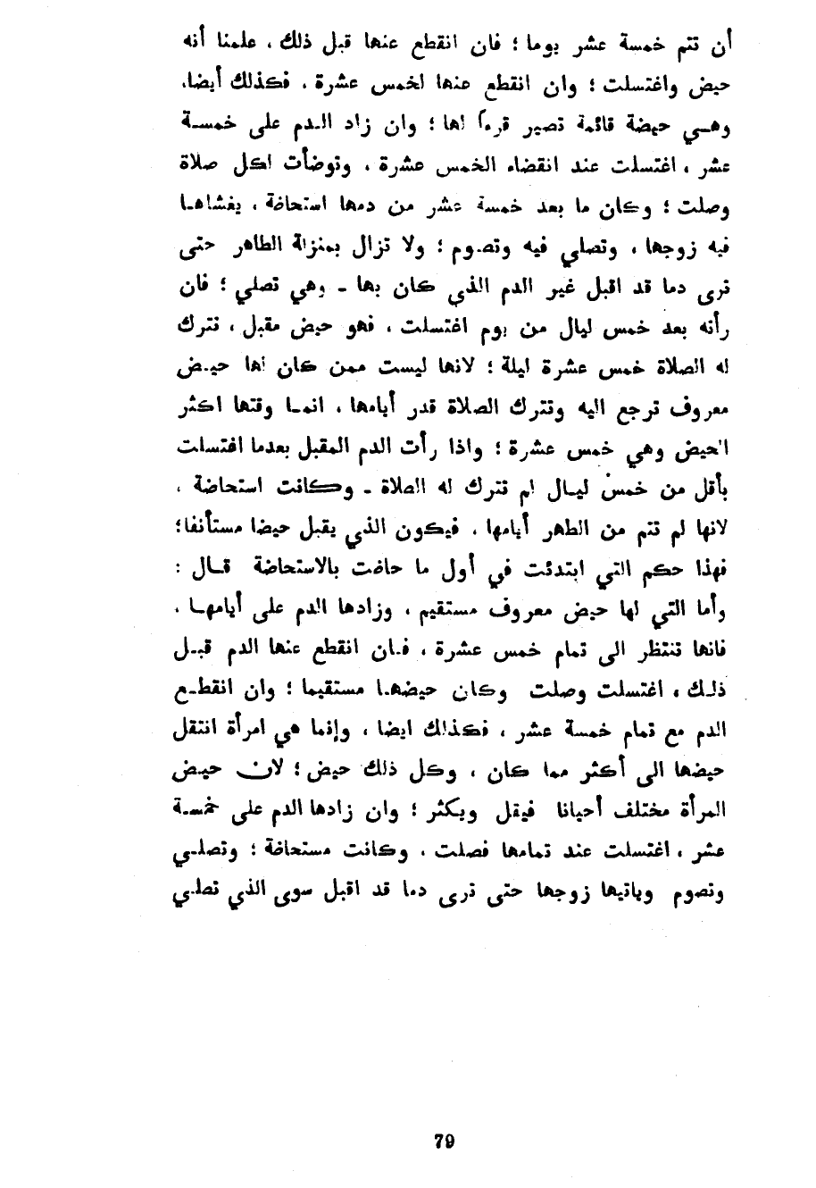 أَنْ تُتِمَّ خَمْسَةَ عَشَرَ يَوْمًا فَإِنِ انْقَطَعَ عَنْهَا قَبْلَ ذَلِكَ عَلِمْنَا أَنَّهُ حَيْضٌ وَاغْتَسَلَتْ وَإِنِ انْقَطَعَ عَنْهَا لِخَمْسَ عَشْرَةَ فَكَذَلِكَ أَيْضًا وَهِيَ حَيْضَةٌ قَائِمَةٌ تَصِيرُ قُرْءًا لَهَا وَإِنْ زَادَ الدَّمُ عَلَى خَمْسَةَ عَشَرَ اغْتَسَلَتْ عِنْدَ انْقِضَاءِ الْخَمْسَ عَشْرَةَ وَتَوَضَّأَتْ لِكُلِّ صَلَاةٍ وَصَلَّتْ وَكَانَ مَا بَلَغَ خَمْسَةَ عَشَرَ مِنْ دَمِهَا اسْتِحَاضَةً يَغْشَاهَا فِيهِ زَوْجُهَا وَتُصَلِّي فِيهِ وَتَصُومُ وَلَا تَزَالُ بِمَنْزِلَةِ الطَّاهِرِ حَتَّى تَرَى دَمًا قَدْ أَقْبَلَ غَيْرَ الدَّمِ الَّذِي كَانَ بِهَا وَهِيَ تُصَلِّي فَإِنْ رَأَتْهُ بَعْدَ خَمْسِ لَيَالٍ مِنْ يَوْمِ اغْتَسَلَتْ فَهُوَ حَيْضٌ مُقْبِلٌ تَتْرُكُ لَهُ الصَّلَاةَ خَمْسَ عَشْرَةَ لَيْلَةً لِأَنَّهَا لَيْسَتْ مِمَّنْ كَانَ لَهَا حَيْضٌ مَعْرُوفٌ تَرْجِعُ إِلَيْهِ وَتَتْرُكُ الصَّلَاةَ قَدْرَ أَيَّامِهَا إِنَّمَا وَقْتُهَا أَكْثَرُ الْحَيْضِ وَهِيَ خَمْسَ عَشْرَةَ وَإِذَا رَأَتِ الدَّمَ الْمُقْبِلَ بَعْدَمَا اغْتَسَلَتْ بِأَقَلَّ مِنْ خَمْسِ لَيَالٍ لَمْ تَتْرُكْ لَهُ الصَّلَاةَ وَكَانَتِ اسْتِحَاضَةً لِأَنَّهَا لَمْ تُتِمَّ مِنَ الطُّهْرِ أَيَّامَهَا فَيَكُونُ الَّذِي يُقْبِلُ حَيْضًا مُسْتَأْنَفًا فَهَذَا حُكْمُ الَّتِي ابْتُدِئَتْ فِي أَوَّلِ مَا حَاضَتْ بِالِاسْتِحَاضَةِ قَالَ وَأَمَّا الَّتِي لَهَا حَيْضٌ مَعْرُوفٌ مُسْتَقِيمٌ وَزَادَهَا الدَّمُ عَلَى أَيَّامِهَا فَإِنَّهَا تَنْتَظِرُ إِلَى تَمَامِ خَمْسَ عَشْرَةَ فَإِنِ انْقَطَعَ عَنْهَا الدَّمُ قَبْلَ ذَلِكَ اغْتَسَلَتْ وَصَلَّتْ وَكَانَ حَيْضُهَا مُسْتَقِيمًا وَإِنِ انْقَطَعَ الدَّمُ مَعَ تَمَامِ خَمْسَةَ عَشَرَ فَكَذَلِكَ أَيْضًا وَإِنَّمَا هِيَ امْرَأَةٌ انْتَقَلَ حَيْضُهَا إِلَى أَكْثَرَ مِمَّا كَانَ وَكُلُّ ذَلِكَ حَيْضٌ لِأَنَّ حَيْضَ الْمَرْأَةِ مُخْتَلِفٌ أَحْيَانًا فَيَقِلُّ وَيَكْثُرُ وَإِنْ زَادَهَا الدَّمُ عَلَى خَمْسَةَ عَشَرَ اغْتَسَلَتْ عِنْدَ تَمَامِهَا فَصَلَّتْ وَكَانَتْ مُسْتَحَاضَةً وَتُصَلِّي وَتَصُومُ وَيَأْتِيهَا زَوْجُهَا حَتَّى تَرَى دَمًا قَدْ أَقْبَلَ سِوَى الَّذِي تصلي