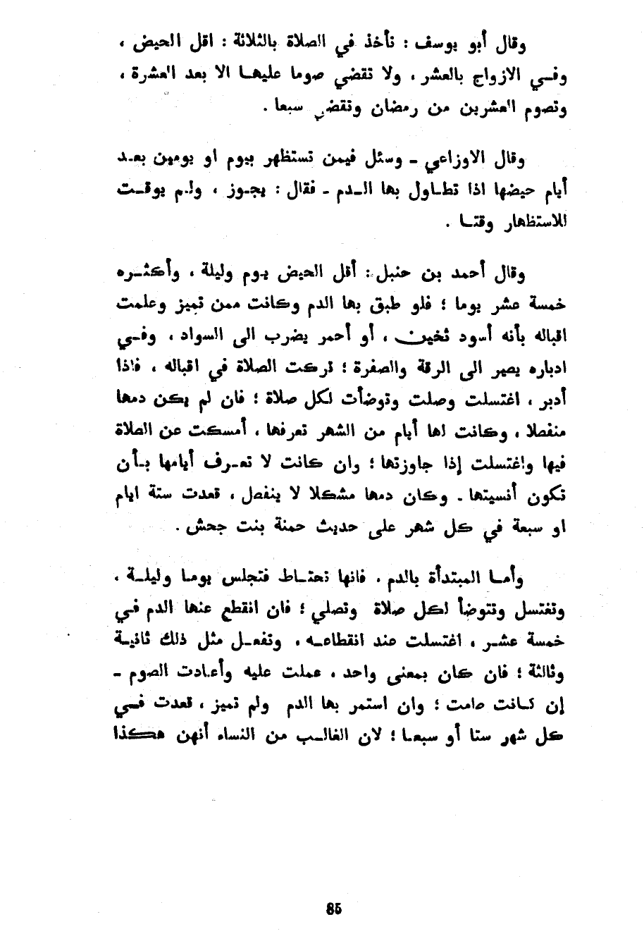 وَقَالَ أَبُو يُوسُفَ تَأْخُذُ فِي الصَّلَاةِ بِالثَّلَاثَةِ أَقَلُّ الْحَيْضِ وَفِي الْأَزْوَاجِ بِالْعَشْرِ وَلَا تَقْضِي صَوْمًا عَلَيْهَا إِلَّا بَعْدَ الْعَشَرَةِ وَتَصُومُ الْعِشْرِينَ مِنْ رَمَضَانَ وَتَقْضِي سَبْعًا وَقَالَ الْأَوْزَاعِيُّ وَسُئِلَ فِيمَنْ تَسْتَظْهِرُ بِيَوْمٍ أَوْ يَوْمَيْنِ بَعْدَ أَيَّامِ حَيْضِهَا إِذَا تَطَاوَلَ بِهَا الدَّمُ فَقَالَ يَجُوزُ وَلَمْ يُوَقِّتْ لِلِاسْتِظْهَارِ وَقْتًا وَقَالَ أَحْمَدُ بْنُ حَنْبَلٍ أَقَلُّ الْحَيْضِ يَوْمٌ وَلَيْلَةٌ وَأَكْثَرُهُ خَمْسَةَ عَشَرَ يَوْمًا فَلَوْ طَبَقَ بِهَا الدَّمُ وَكَانَتْ مِمَّنْ تُمَيِّزُ وَعَلِمَتْ إِقْبَالَهُ بِأَنَّهُ أَسْوَدُ ثَخِينٌ أَوْ أَحْمَرُ يَضْرِبُ إِلَى السَّوَادِ وَفِي إِدْبَارِهِ يَصِيرُ إِلَى الرِّقَّةِ وَالصُّفْرَةِ تَرَكَتِ الصَّلَاةَ فِي إِقْبَالِهِ فَإِذَا أَدْبَرَ اغْتَسَلَتْ وَصَلَّتْ وَتَوَضَّأَتْ لِكُلِّ صَلَاةٍ فَإِنْ لَمْ يَكُنْ دَمُهَا مُنْفَصِلًا وَكَانَتْ لَهَا أَيَّامٌ مِنَ الشَّهْرِ تَعْرِفُهَا أَمْسَكَتْ عَنِ الصَّلَاةِ فِيهَا وَاغْتَسَلَتْ إِذَا جَاوَزَتْهَا وَإِنْ كَانَتْ لَا تَعْرِفُ أَيَّامَهَا بِأَنْ تَكُونَ أُنْسِيَتْهَا وَكَانَ دَمُهَا مُشْكَلًا لَا يَنْفَصِلُ قَعَدَتْ سِتَّةَ أَيَّامٍ أَوْ سَبْعَةً فِي كُلِّ شَهْرٍ عَلَى حَدِيثِ حَمْنَةَ بِنْتِ جَحْشٍ وَأَمَّا الْمُبْتَدَأَةُ بِالدَّمِ فَإِنَّهَا تَحْتَاطُ فَتَجْلِسُ يَوْمًا وَلَيْلَةً وَتَغْتَسِلُ وَتَتَوَضَّأُ لِكُلِّ صَلَاةٍ وَتُصَلِّي فَإِنِ انْقَطَعَ عَنْهَا الدَّمُ فِي خَمْسَةَ عَشَرَ اغْتَسَلَتْ عِنْدَ انْقِطَاعِهِ وَتَفْعَلُ مِثْلَ ذَلِكَ ثَانِيَةً وَثَالِثَةً فَإِنْ كَانَ بِمَعْنًى وَاحِدٍ عَمِلَتْ عَلَيْهِ وَأَعَادَتِ الصَّوْمَ إِنْ كَانَتْ صَامَتْ وَإِنِ اسْتَمَرَّ بِهَا الدَّمُ وَلَمْ تُمَيِّزْ قَعَدَتْ فِي كُلِّ شَهْرٍ سِتًّا أَوْ سَبْعًا لِأَنَّ الْغَالِبَ مِنَ النِّسَاءِ أَنَّهُنَّ هَكَذَا