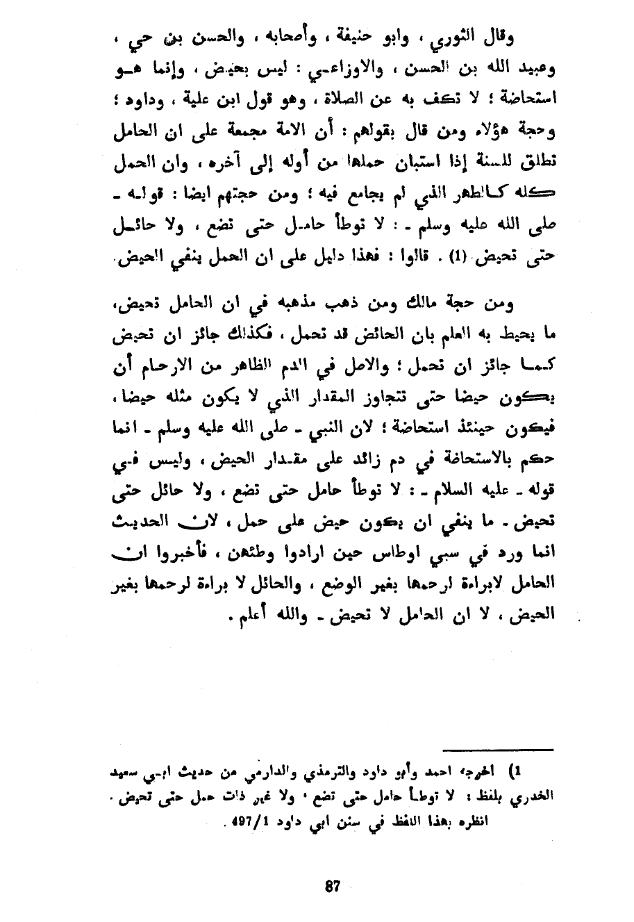 وَقَالَ الثَّوْرِيُّ وَأَبُو حَنِيفَةَ وَأَصْحَابُهُ وَالْحَسَنُ بْنُ حَيٍّ وَعُبَيْدُ اللَّهِ بْنُ الْحَسَنِ وَالْأَوْزَاعِيُّ لَيْسَ بِحَيْضٍ وَإِنَّمَا هُوَ اسْتِحَاضَةٌ لَا تَكُفُّ بِهِ عَنِ الصَّلَاةِ وَهُوَ قَوْلُ ابْنِ عُلَيَّةَ وَدَاوُدَ وَحُجَّةُ هَؤُلَاءِ وَمَنْ قَالَ بِقَوْلِهِمْ أَنَّ الْأُمَّةَ مُجْمِعَةٌ عَلَى أَنَّ الْحَامِلَ تُطَلَّقُ لِلسُّنَّةِ إِذَا اسْتَبَانَ حَمْلُهَا مِنْ أَوَّلِهِ إِلَى آخِرِهِ وَأَنَّ الْحَمْلَ كُلَّهُ كَالطُّهْرِ الَّذِي لَمْ يُجَامَعْ فِيهِ وَمِنْ حُجَّتِهِمْ أَيْضًا قَوْلُهُ صَلَّى اللَّهُ عَلَيْهِ وَسَلَّمَ لَا تُوطَأُ حَامِلٌ حَتَّى تَضَعَ وَلَا حَائِلٌ حَتَّى تَحِيضَ قَالُوا فَهَذَا دَلِيلٌ عَلَى أَنَّ الْحَمْلَ يَنْفِي الْحَيْضَ وَمِنْ حُجَّةِ مَالِكٍ وَمَنْ ذَهَبَ مَذْهَبَهُ فِي أَنَّ الْحَامِلَ تَحِيضُ مَا يُحِيطُ بِهِ الْعِلْمُ بِأَنَّ الْحَائِضَ قَدْ تَحْمِلُ فَكَذَلِكَ جَائِزٌ أَنْ تَحِيضَ كَمَا جَائِزٌ أَنْ تَحْمِلَ وَالْأَصْلُ فِي الدَّمِ الظَّاهِرِ مِنَ الْأَرْحَامِ أَنْ يَكُونَ حَيْضًا حَتَّى تَتَجَاوَزَ الْمِقْدَارَ الَّذِي لَا يَكُونُ مِثْلُهُ حَيْضًا فَيَكُونُ حِينَئِذٍ اسْتِحَاضَةً لِأَنَّ النَّبِيَّ صَلَّى اللَّهُ عَلَيْهِ وَسَلَّمَ إِنَّمَا حَكَمَ بِالِاسْتِحَاضَةِ فِي دَمٍ زَائِدٍ عَلَى مِقْدَارِ الْحَيْضِ وَلَيْسَ فِي قَوْلِهِ عَلَيْهِ السَّلَامُ لَا تُوطَأُ حَامِلٌ حَتَّى تَضَعَ وَلَا حَائِلٌ حَتَّى تَحِيضَ مَا يَنْفِي أَنْ يَكُونَ حَيْضٌ عَلَى حَمْلٍ لِأَنَّ الْحَدِيثَ إِنَّمَا وَرَدَ فِي سبي أوطاس حين أرادوا وطئهن فأخبروا عن الْحَامِلَ لَا بَرَاءَةَ لِرَحِمِهَا بِغَيْرِ الْوَضْعِ وَالْحَائِلَ لَا بَرَاءَةَ لِرَحِمِهَا بِغَيْرِ الْحَيْضِ لَا أَنَّ الْحَامِلَ لَا تَحِيضُ وَاللَّهُ أَعْلَمُ